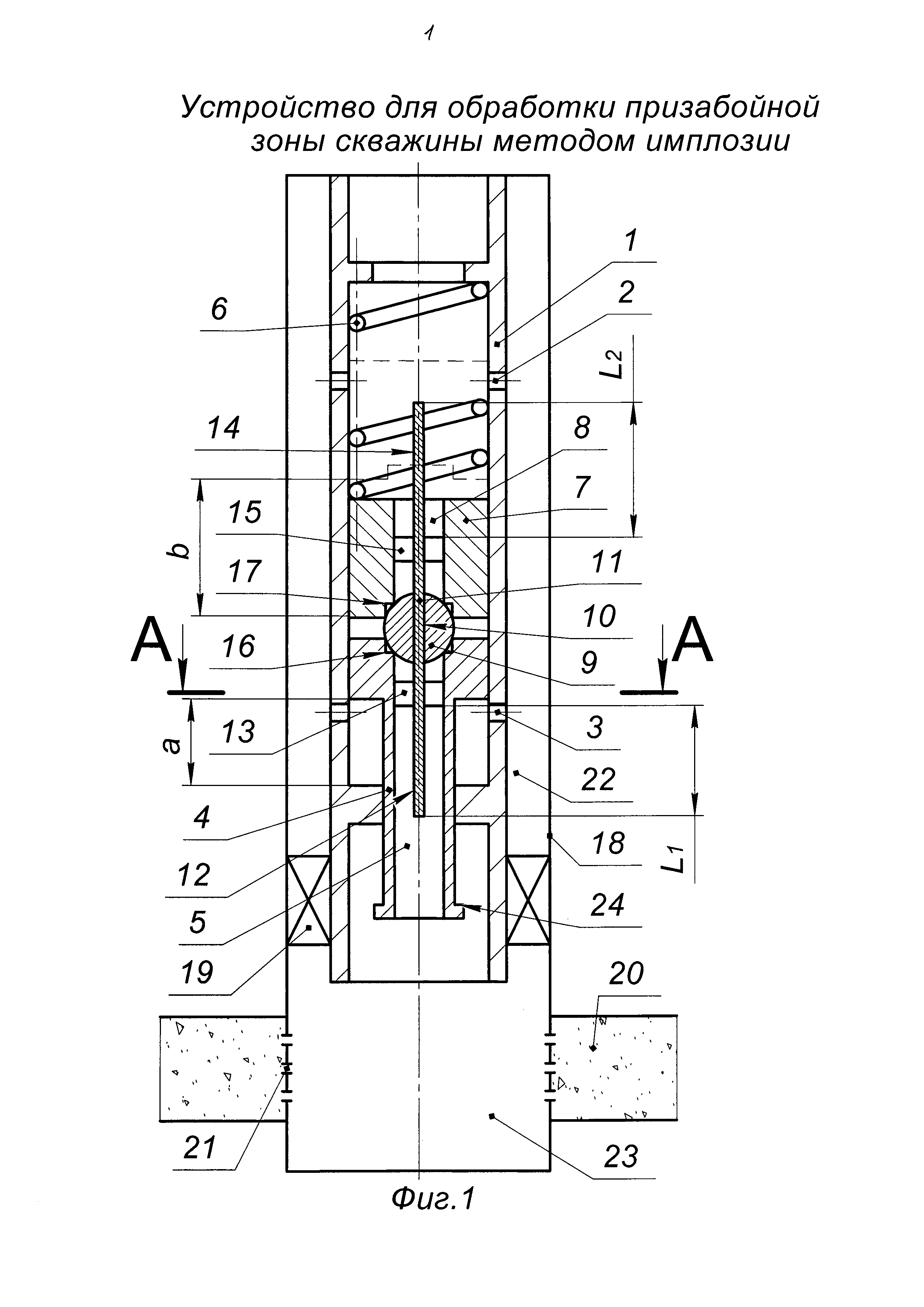 Изобретение относится к нефтегазодобывающей промышленности, в частности к устройствам для обработки призабойных зон скважин. Известно устройство для обработки призабойной зоны методом имплозии (авторское свидетельство SU №721524, МПК E21B 43/26, опуб. 15.03.1980 в бюл. №10), содержащее корпус с радиальными каналами, размещенный в корпусе подпружиненный дифференциальный поршень, цилиндр и обратный клапан, при этом с целью обеспечения автоматического многократного проведения процесса с использованием энергии пласта, внутри цилиндра установлен ступенчатый поршень с осевым каналом и шаровым клапаном, причем дифференциальный поршень выполнен полым с радиальными отверстиями, а шаровой клапан размещен между ступенчатым и дифференциальным поршнями. Недостатками данного устройства являются: - во-первых, сложность конструкции, обусловленная большим количеством узлов и деталей (цилиндр, дифференциальный поршень, обратный клапан и т.д.); - во-вторых, низкое качество имплозионной обработки призабойной зоны скважины вследствие потери герметичности, обусловленной конусными поверхностями седел шарового клапана, на которых в процессе работы откладываются продукты имплозионной очистки пласта, что вскоре приводит к негерметичной работе шарового клапана; - в-третьих, необходим наземный привод для работы устройства. Наиболее близким по технической сущности и достигаемому результату является устройство для обработки призабойной зоны методом имплозии (авторское свидетельство SU №1004624, МПК E21B 43/26, опуб. 15.03.1983 г. в бюл. №10), содержащее корпус с верхним и нижним рядами радиальных каналов, размещенные в корпусе нижний ступенчатый поршень с осевым каналом, верхний подпружиненный поршень с осевым каналом и установленный между поршнями шаровой клапан с седлами, имеющий возможность перекрытия осевого канала верхнего поршня. Недостатками данного устройства являются: - во-первых, низкое качество имплозионной обработки призабойной зоны скважины вследствие потери герметичности, обусловленной конусными поверхностями седел шарового клапана, на которых в процессе работы откладываются продукты имплозионной очистки пласта, что вскоре приводит к негерметичной работе шарового клапана; -во-вторых, низкая надежность работы в наклонных и горизонтальных скважинах, обусловленная тем, что шаровой клапан расположен между двумя поршнями свободно, т.е. не имеет ограничения радиального перемещения и не будет перекрывать осевые каналы соответствующих поршней в таких скважинах, так как будет располагаться на периферии между поршнями у корпуса устройства, что вызывает отказ устройства в работе. Технической задачей изобретения является повышение качества имплозионной обработки призабойной зоны скважины, а также повышение надежности работы устройства в наклонных и горизонтальных скважинах. Поставленная техническая задача решается устройством для обработки призабойной зоны скважины методом имплозии, содержащим корпус с верхним и нижним рядами радиальных каналов, размещенные в корпусе нижний ступенчатый поршень с осевым каналом и верхний подпружиненный поршень с осевым каналом, шаровой клапан с седлами, установленный между нижним ступенчатым и верхним подпружиненным поршнями и имеющий возможность перекрытия осевого канала верхнего поршня. Новым являе