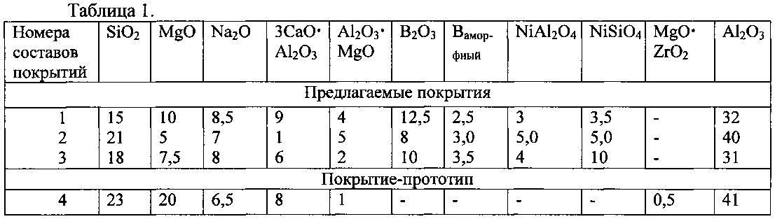 Защитное технологическое покрытие, включающее SiO2, MgO, Na2O, 3СаО·Al2O3, Al2O3·MgO, Al2O3, отличающееся тем, что оно дополнительно содержит B2O3, Bаморфный, NiAl2O4, NiSiO4 при следующем соотношении компонентов, мас.%:SiO2 15-21 MgO 5-10 Na2O 7-8,5 3CaO·Al2O3 1-9 Al2O3·MgO 2-5 B2O3 8-12,5 Bаморфный 2,5-3,5 NiAl2O4 3-5 NiSiO4 3,5-10 Al2O3 остальное