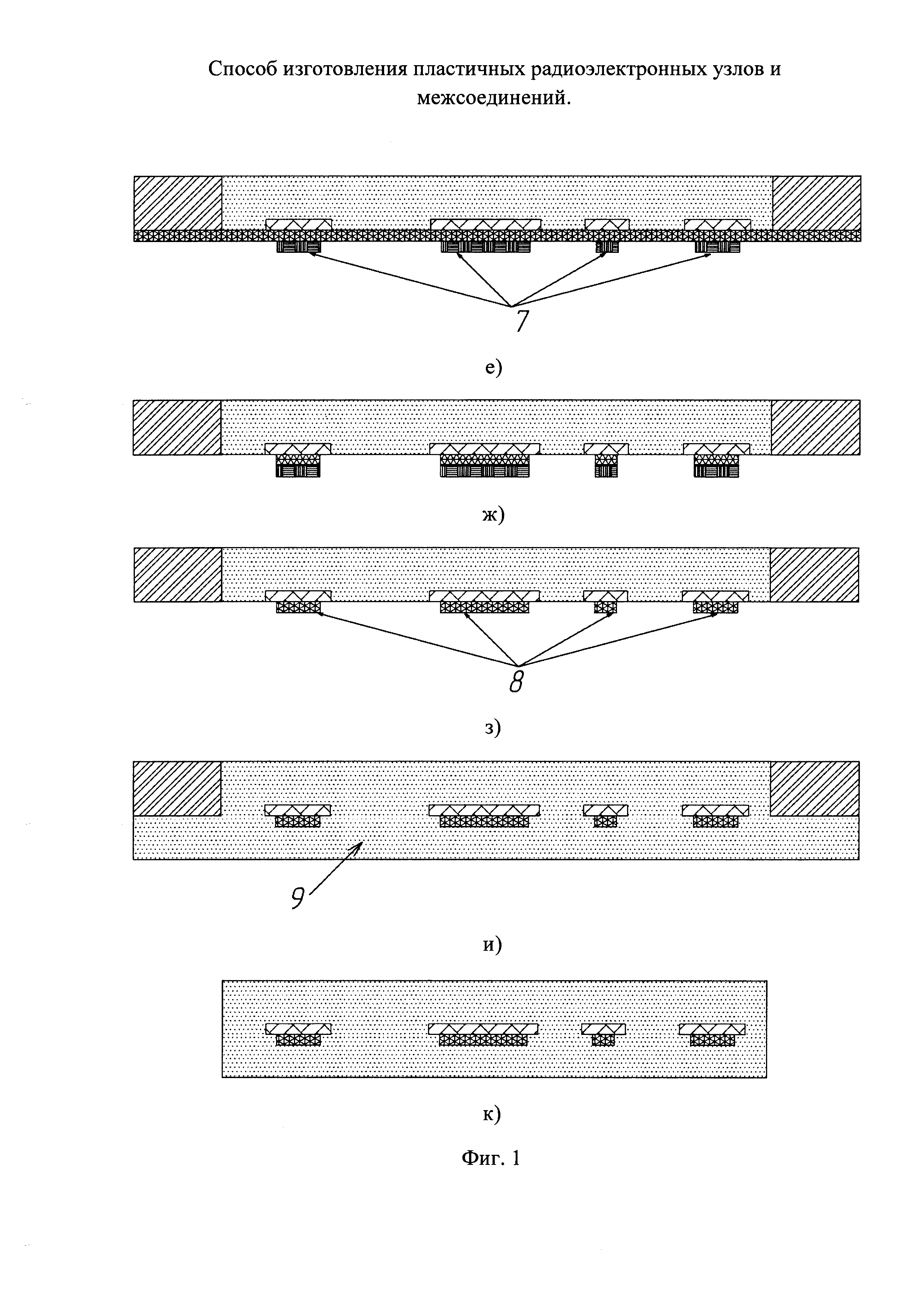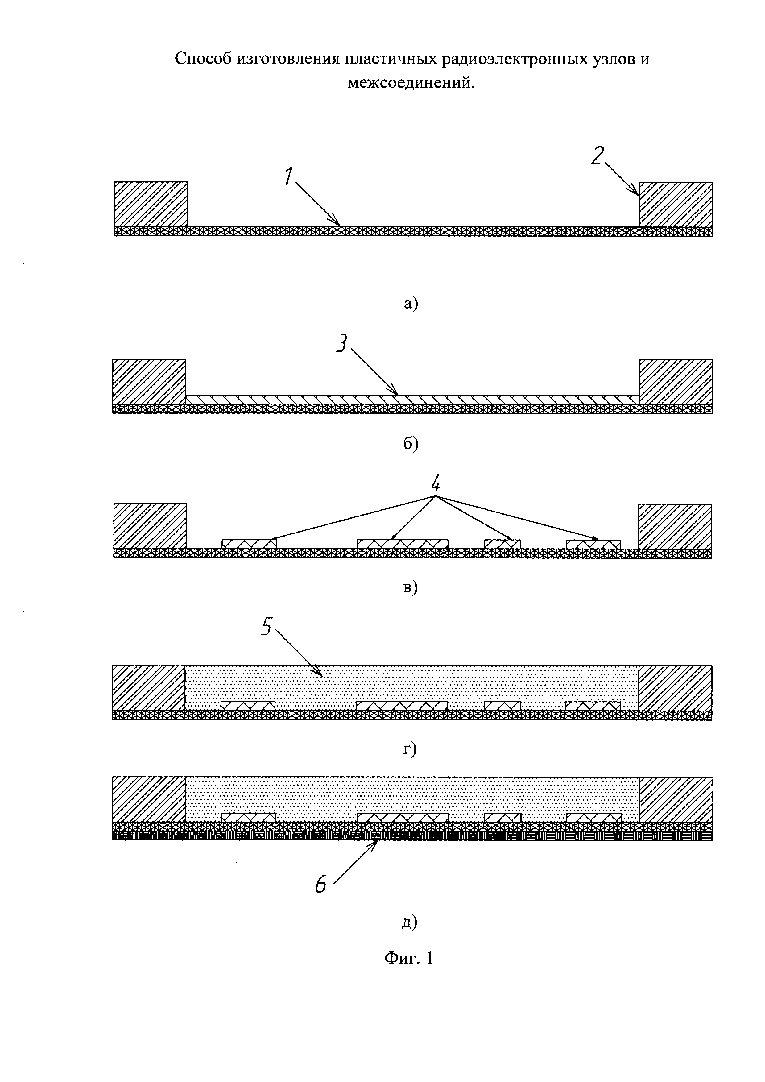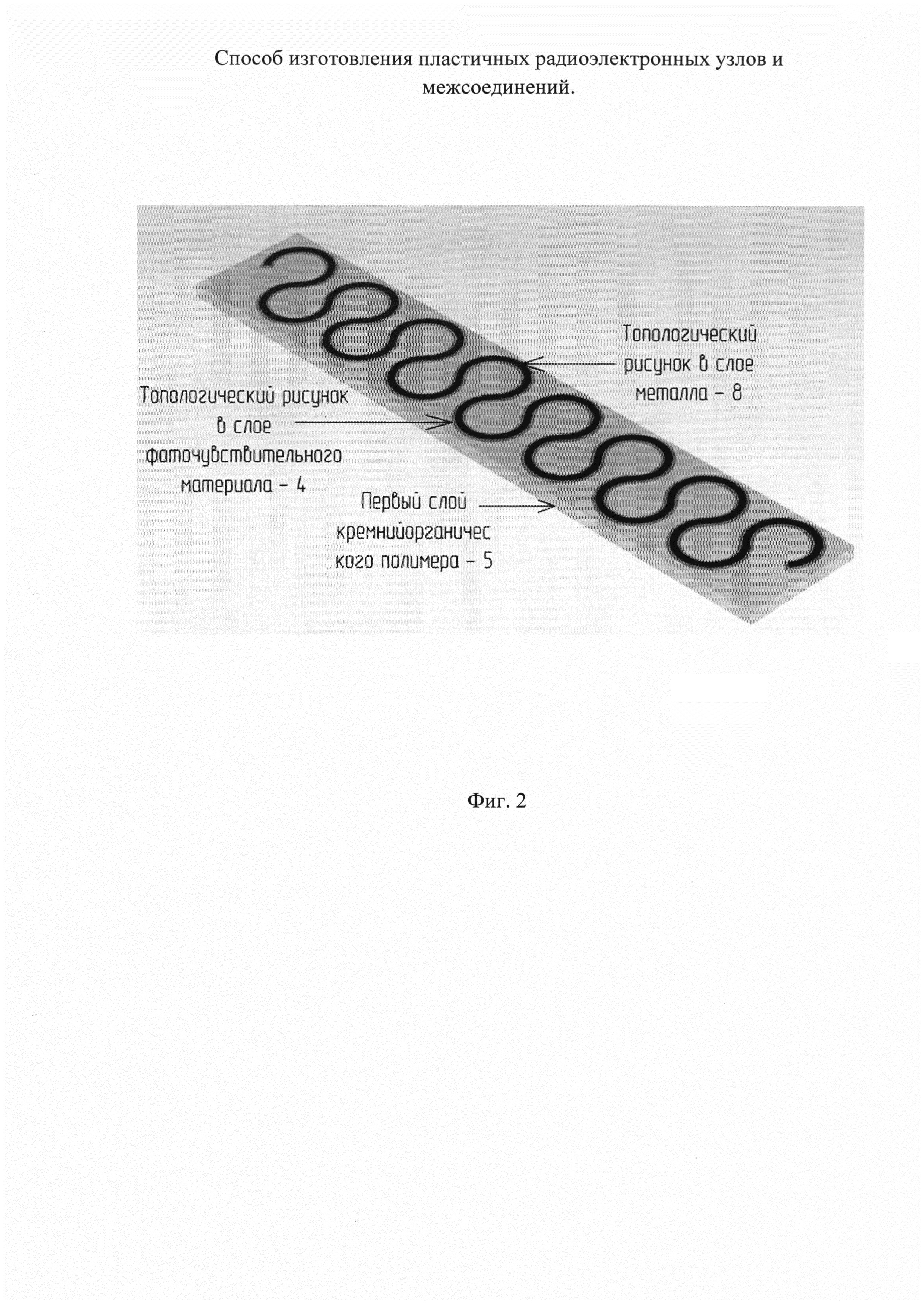 Способ изготовления пластичных радиоэлектронных узлов и межсоединений, включающий изготовление основания, соединение слоя коммутации с жестким основанием, формирование топологического рисунка и усиление слоя коммутации промежуточным гибким слоем, отличающийся тем, что изготавливают жесткое основание - опорное металлическое кольцо, закрепляют металлическую фольгу на опорном металлическом кольце, наносят промежуточный гибкий слой на одной стороне металлической фольги, формируют в нем рисунок фотолитографией, наносят первый слой кремнийорганического полимера на сформированный фотолитографией рисунок, формируют топологический рисунок фотолитографией на другой стороне металлической фольги, травят насквозь металлическую фольгу, наносят второй слой кремнийорганического полимера на полученный топологический рисунок.