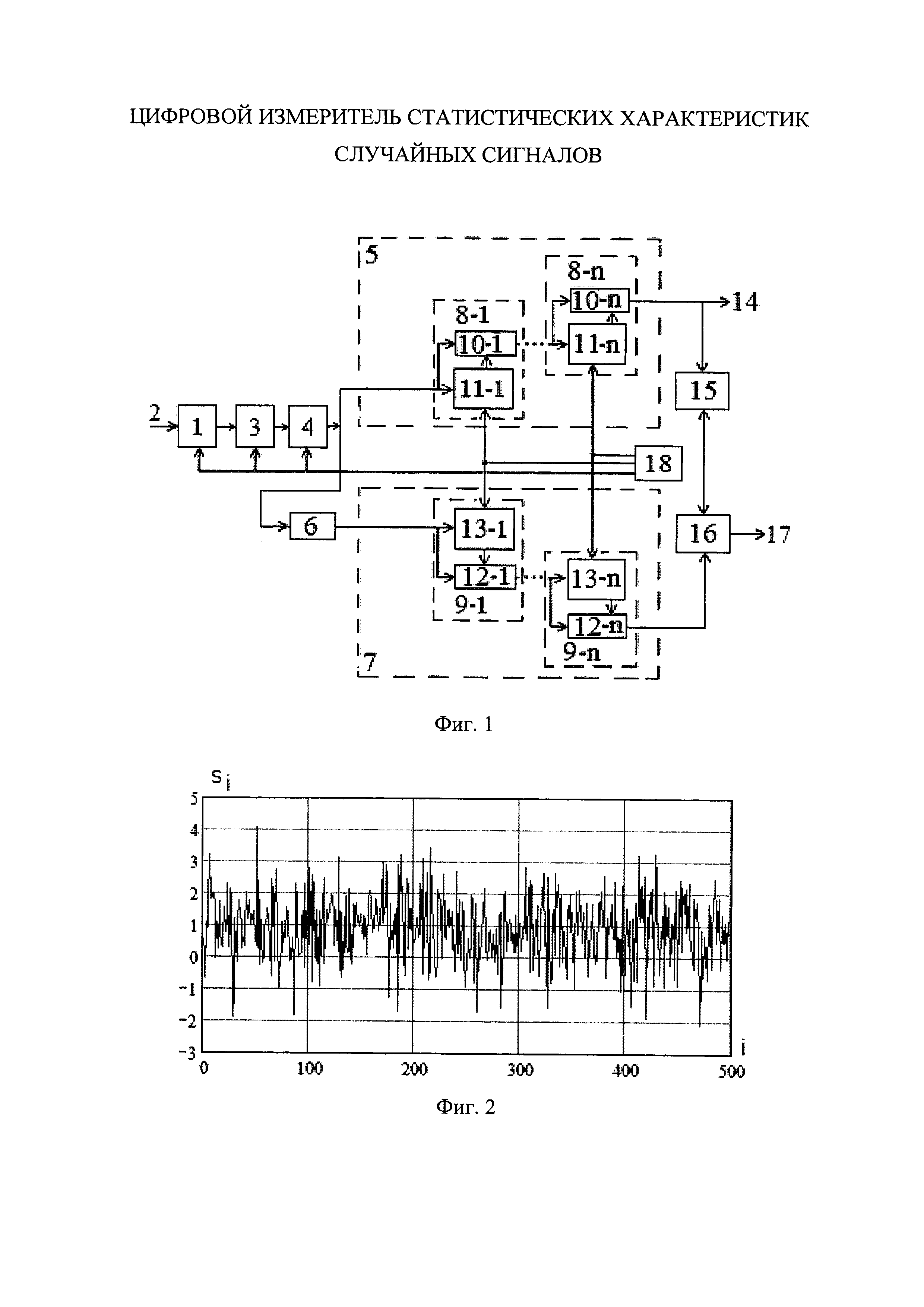 Цифровой измеритель статистических характеристик случайных сигналов, содержащий аналого-цифровой преобразователь, последовательно соединенный с ним регистр и таймер (генератор тактовых импульсов), отличающийся тем, что он дополнительно содержит соединенный с выходом регистра цифровой фильтр, канал формирования среднего значения и первый квадратичный преобразователь, входы которых соединены с выходом цифрового фильтра, канал формирования среднего квадрата, вход которого подключен к выходу первого квадратичного преобразователя, второй квадратичный преобразователь, вход которого соединен с выходом канала формирования среднего значения, а выход подключен к первому входу вычитателя, второй вход вычитателя подключен к выходу канала формирования среднего квадрата, каналы формирования среднего значения и формирования среднего квадрата содержат по n каскадно соединенных накопителей отсчетов, каждый накопитель отсчетов содержит сумматор и регистр сдвига многоразрядных кодов, первый вход сумматора и вход регистра соединены вместе и образуют общий вход накопителя отсчетов, выход регистра сдвига соединен со вторым входом сумматора, а выход сумматора является выходом накопителя отсчетов, вход первого накопителя отсчетов канала формирования среднего значения является входом канала формирования среднего значения, а выход его n-го накопителя отсчетов - выходом канала формирования среднего значения, вход первого накопителя отсчетов канала формирования среднего квадрата является входом канала формирования среднего квадрата, а выход его n-го накопителя отсчетов - выходом канала формирования среднего квадрата, на выходе канала формирования среднего значения формируется код среднего значения, а на выходе вычитателя - дисперсия случайного сигнала.