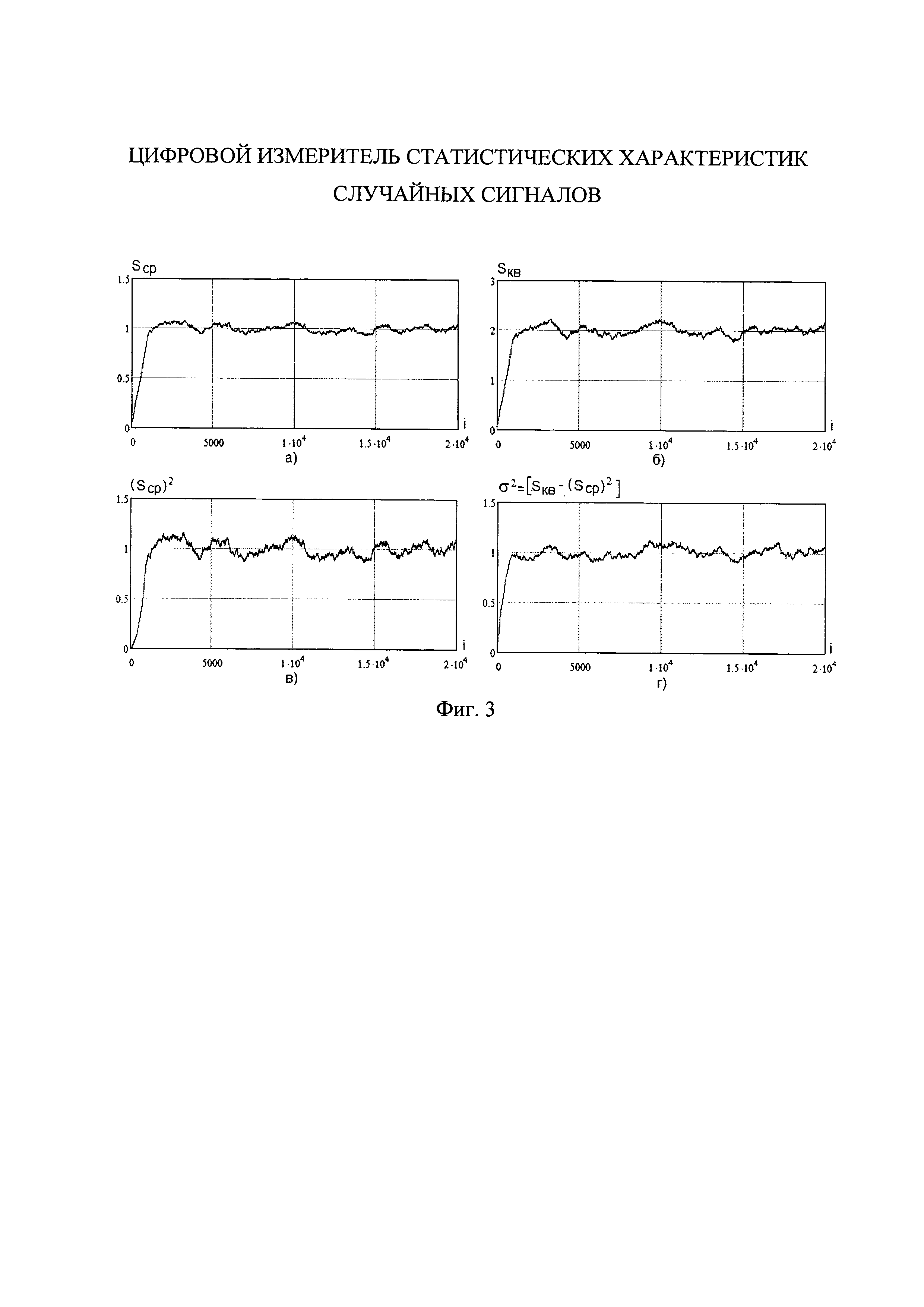 Изобретение относится к области радиотехники и измерительной техники. Технический результат заключается в обеспечении непрерывного цифрового измерения среднего значения и дисперсии случайных сигналов с высокой точностью при минимальном числе необходимых арифметических операций. Технический результат достигается за счет цифрового измерителя статистических характеристик случайных сигналов, который содержит аналого-цифровой преобразователь, регистр, цифровой фильтр, канал формирования среднего значения, первый и второй квадратичные преобразователи, канал формирования среднего квадрата, вычитатель и генератор тактовых импульсов, каналы формирования среднего значения и формирования среднего квадрата содержат по n накопителей отсчетов, каждый из которых содержит сумматор и регистр сдвига многоразрядных кодов. 3 ил.