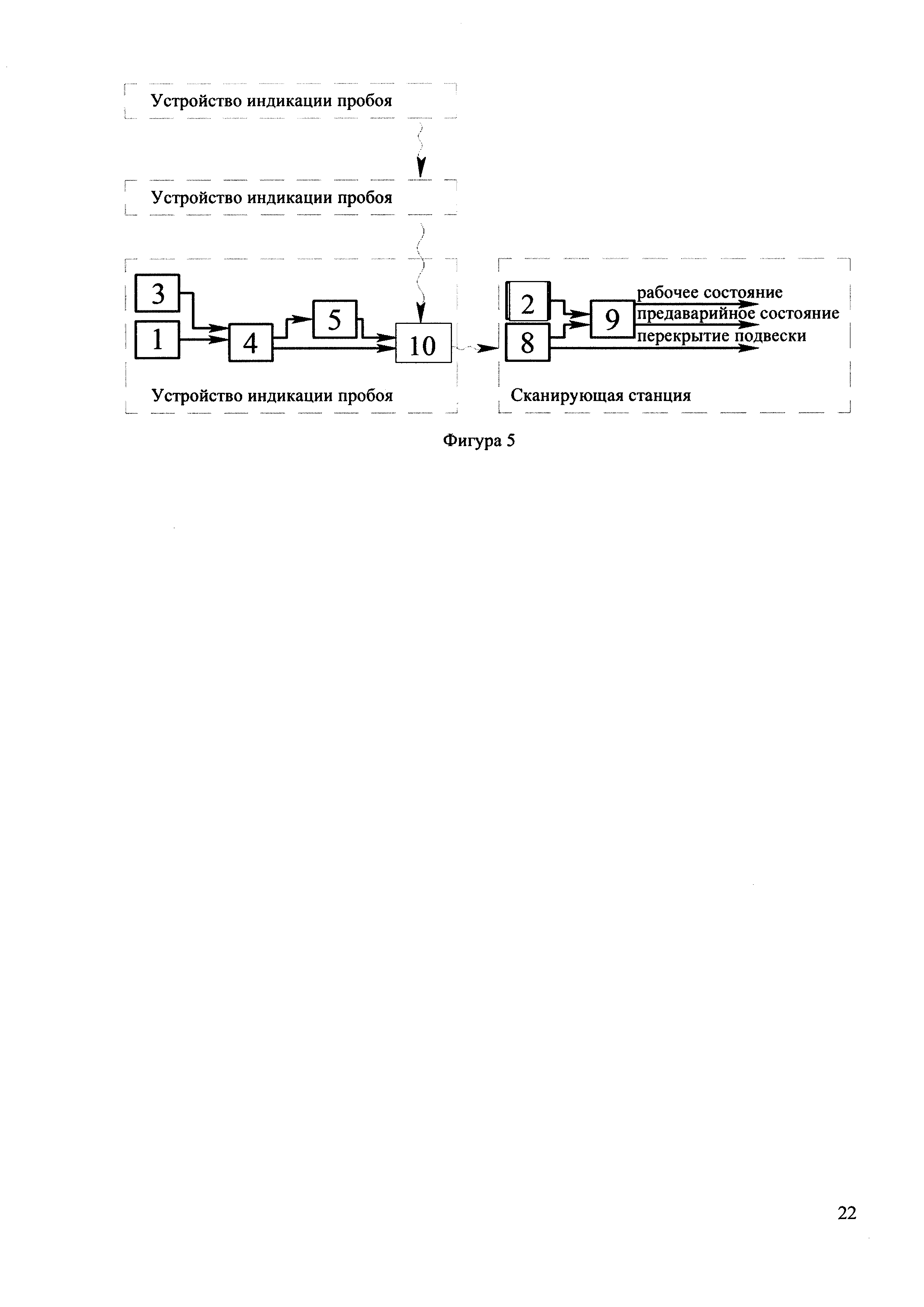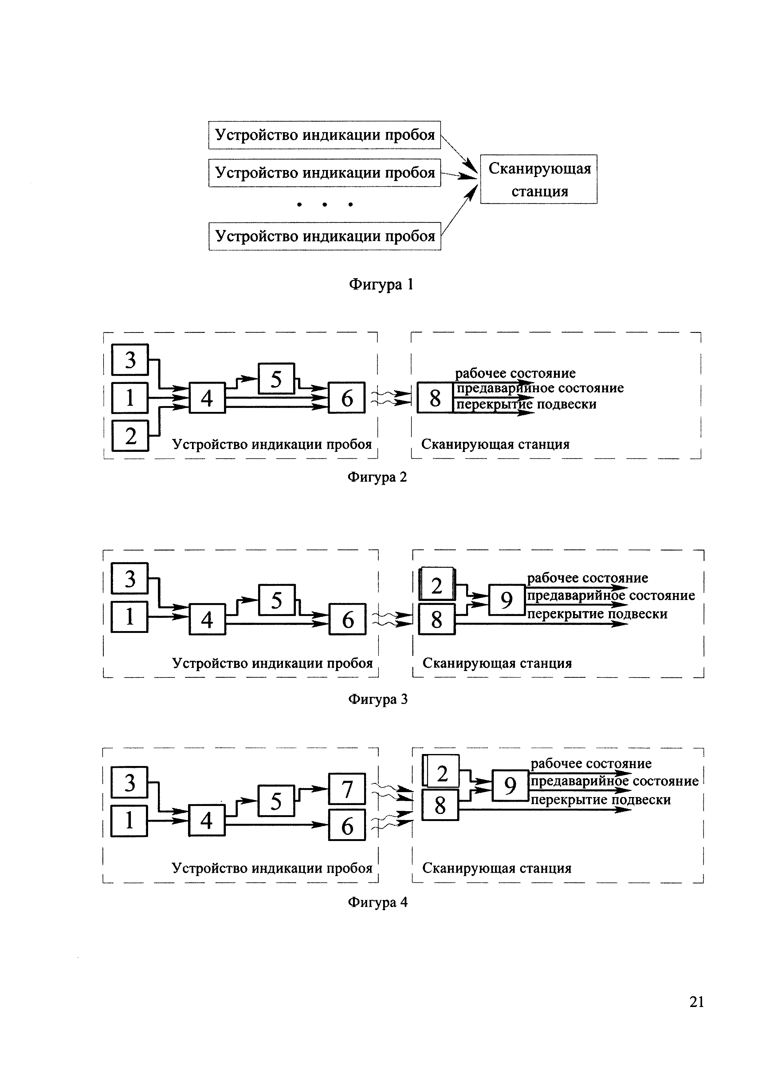 1. Устройство определения состояния изолирующих подвесок, содержащее устройство индикации пробоя и сканирующую станцию, отличающееся тем, что устройство индикации пробоя снабжено измерителем тока утечки (1), формирователями первого (2) и второго (3) порогового значения тока утечки, которые подключены к элементу сравнения (4), элементом памяти (5), получающим информацию от элемента сравнения о перекрытии изолирующей подвески, когда измеренный ток утечки больше второго порогового значения, радиопередающее устройство (6), получающее от элемента памяти (5) информацию о случившемся перекрытии изолирующей подвески, а от элемента сравнения (4) - информацию о нахождении изолятора в рабочем состоянии, когда измеренный ток утечки меньше первого порогового значения или предаварийном состоянии, когда измеренный ток утечки меньше второго порогового значения, но больше первого порогового значения, при этом сканирующая станция снабжена радиопринимающим устройством (8), получающим информацию с радиопередающего устройства по каналу радиосвязи о состоянии изолирующей подвески. 2. Устройство определения состояния изолирующих подвесок, содержащее устройство индикации пробоя и сканирующую станцию, отличающееся тем, что устройство индикации пробоя снабжено измерителем тока утечки (1), формирователем второго (3) порогового значения тока утечки, которые подключены к элементу сравнения (4), элементом памяти (5), получающим информацию от элемента сравнения о перекрытии изолирующей подвески, когда измеренный ток утечки больше второго порогового значения, радиопередающим устройством (6), получающее от элемента памяти (5) информацию о случившемся перекрытии изолирующей подвески, а от элемента сравнения (4) - информацию о величине тока утечки, когда измеренный ток утечки меньше второго порогового значения, при этом сканирующая станция снабжена радиопринимающим устройством (8), получающим информацию с радиопередающего устройства по каналу радиосвязи о состоянии изолирующей подвески или о величине тока утечки, и формирователем первого (2) порогового значения тока утечки, которые подключены к элементу сравнения (9), который сравнивает величину тока утечки с заданным в формирователе порога (2) первым пороговым значением. 3. Устройство определения состояния изолирующих подвесок, содержащее устройство индикации пробоя и сканирующую станцию, отличающееся тем, что устройство индикации пробоя снабжено измерителем тока утечки (1), формирователем второго (3) порогового значения тока утечки, которые подключены к элементу сравнения (4), элементом памяти (5), получающим информацию от элемента сравнения о перекрытии изолирующей подвески, когда измеренный ток утечки больше второго порогового значения, радиопередающим устройством (7), подключенным к элементу памяти (5) и получающим информацию о случившемся перекрытии изолирующей подвески, радиопередающим устройством (6), подключенным к элементу сравнения и получающим информацию о величине тока утечки, когда измеренный ток утечки меньше второго порогового значения, при этом сканирующая станция снабжена радиопринимающим устройством (8), получающим информацию с радиопередающего устройства (7) по каналу радиосвязи о случившемся перекрытии изолирующей подвески, а с радиопередающего устройства (6) о величине тока уте