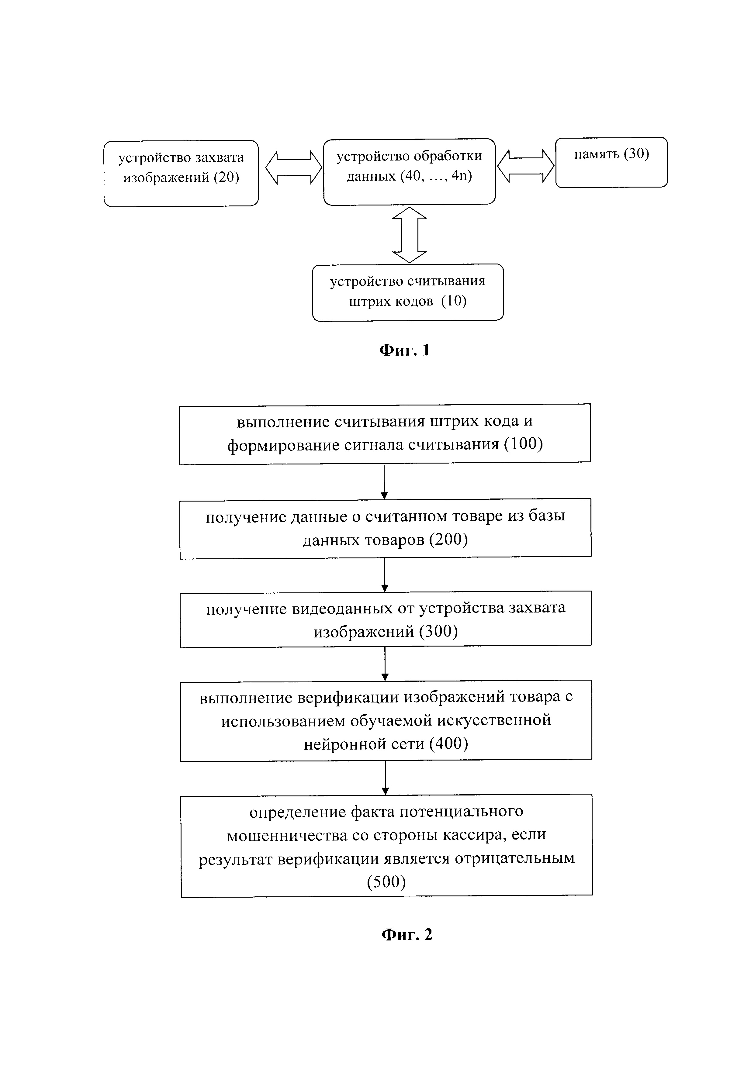 Изобретение относится к области вычислительной техники при использовании искусственных нейронных сетей. Технический результат заключается в повышении точности выявления факта потенциального мошенничества со стороны кассира. Технический результат достигается за счет получения данных о считанном товаре из базы данных товаров и получения видеоданных от устройства захвата изображений, при этом при поднесении кассиром товара к устройству считывания штрихкодов выполняется считывание штрихкода, на основании сигнала считывания получают данные о считанном товаре из базы данных товаров, в момент получения сигнала считывания получают изображение поднесенного товара от устройства захвата изображений, сохраняют полученное изображение поднесенного товара к данным о считанном товаре в базе данных товаров, затем повторяют вышеприведенные этапы для каждого товара, подносимого к устройству считывания штрихкодов. 5 н. и 30 з.п. ф-лы, 3 ил.