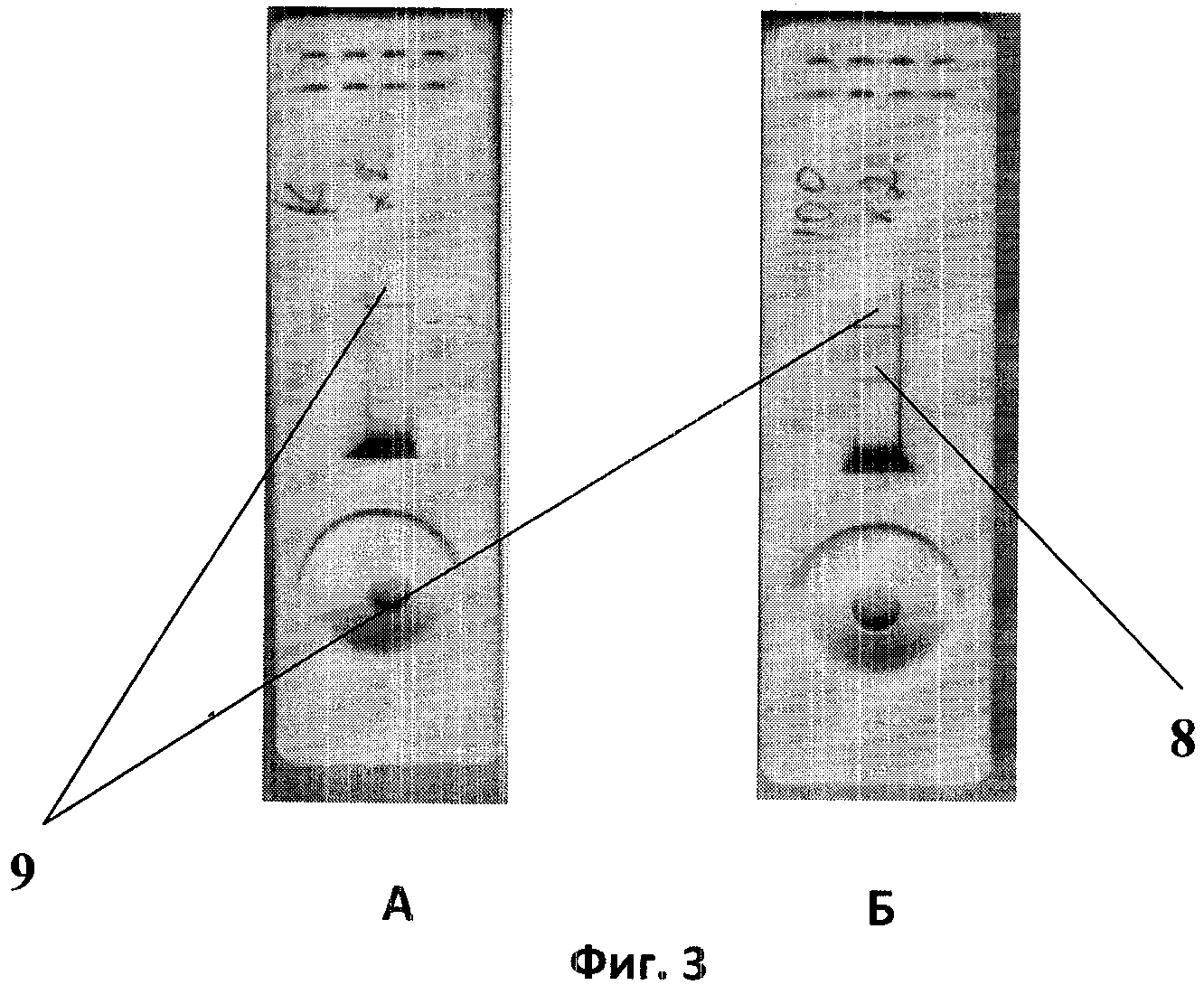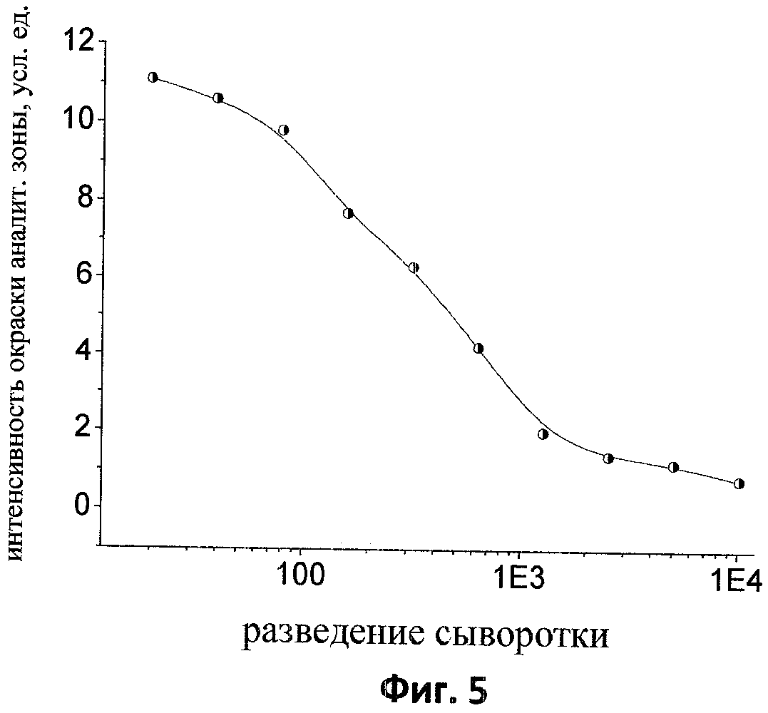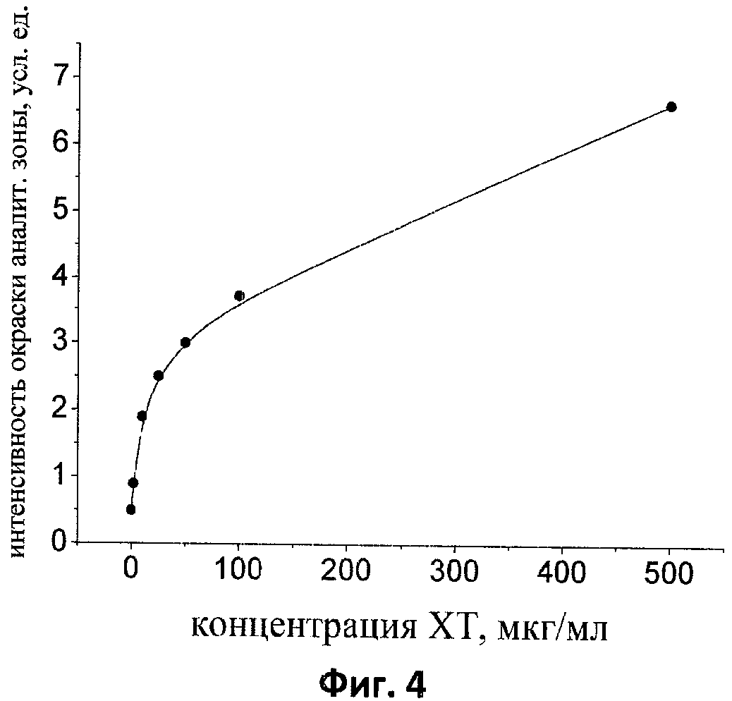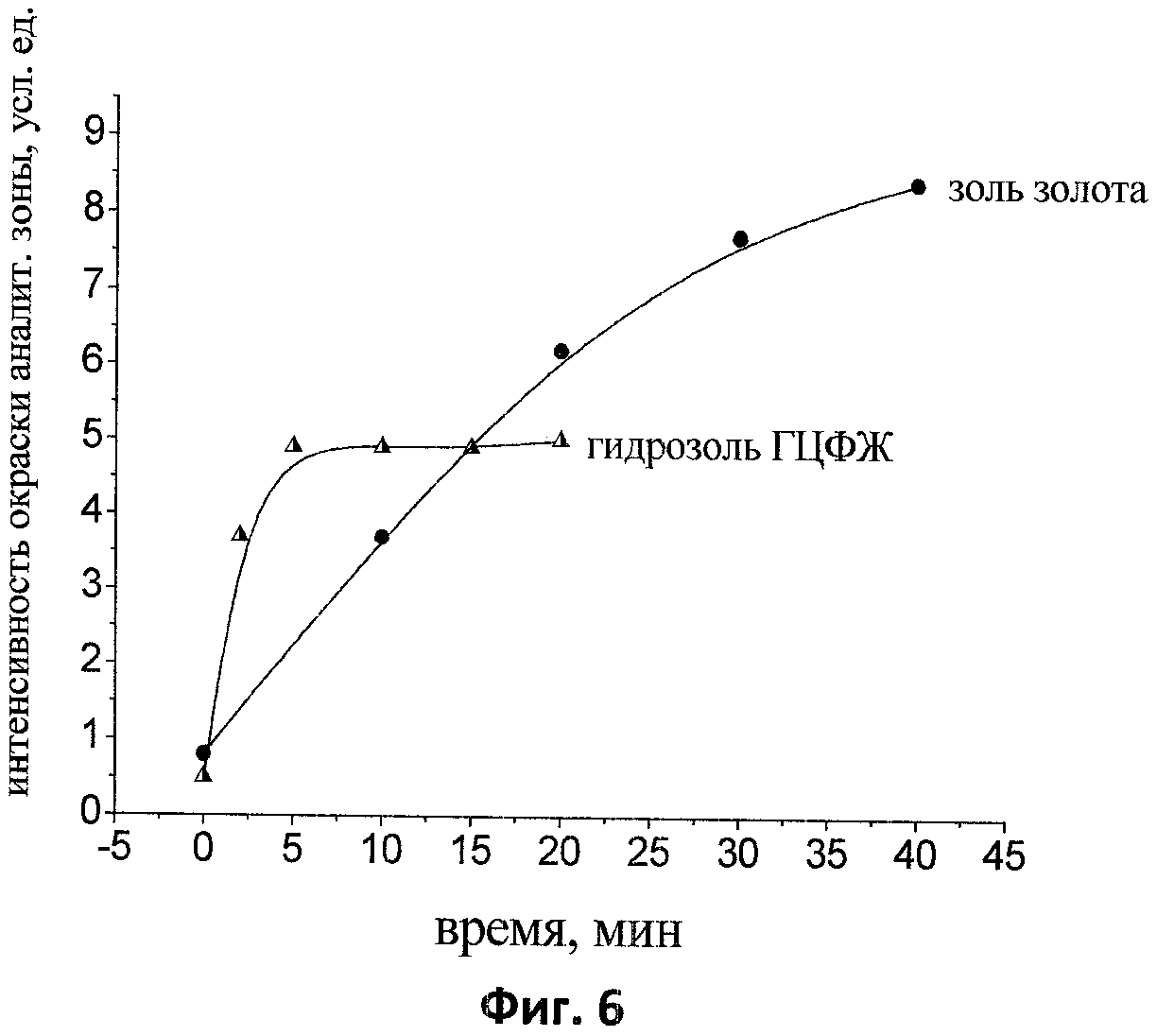 Известны многочисленные примеры использования иммунохроматографических тест-систем для детектирования аналитов (ЕР 0890103 В1; ЕР 1046913 А2; US 50968375238; US 5238652…). Подобные примеры описаны также в книге "Lateral flow immunoassay" R.C.Wong, H.Y. Tse, eds., Humana Press N-Y, 2009. В этих примерах в качестве дисперсной фазы для конъюгирования антител (антигенов) используют наночастицы (диаметр 5-80 нм) золота, окрашенные или флуоресцирующие полимерные частицы субмикронного размера (СА 2049919), наночастицы полупроводниковых материалов, способных к люминесценции (US 2006/0008921). Наиболее близкий аналог (прототип) предлагаемого изобретения описан в патенте ЕР 0890103 В1 "Quantitative immunochromatographic assay". В приспособлении, для проведения иммунохроматографического анализа, описанном в прототипе, предполагается, что мембрана для конъюгата содержит привнесенные в нее искусственно микрочастицы, такие как: коллоидные частицы металлов, молекулы органических соединений, липосомы, или органические полимерные латексные частицы. Указанные частицы связаны с детектирующим антителом, способным к связыванию с аналитом. В процессе иммунохроматографического анализа жидкая проба, содержащая аналит, взаимодействует с антителами микрочастиц, образованные комплексы аналита и микрочастиц капиллярным током жидкости увлекаются по аналитической мембране к узкой аналитической зоне, в которой находятся антитела захвата, останавливающие микрочастицы, связанные с аналитом, образуя при этом окрашенный или люминесцирующий комплекс. Указанный метод анализа на наш взгляд имеет, по меньшей мере, два недостатка. I. Коллоидные частицы металлов, молекулы органических соединений и, особенно, липосомы или органические полимерные латексные частицы дороги в изготовлении, требуют сложных методик синтеза самих частиц, трудоемких химических методик привнесения функциональных групп на поверхность для последующего связывания с антителами (антигенами). II. Скорость миграции по аналитической мембране комплекса аналит-микрочастицы и скорость формирования аналитического сигнала лимитируется конвекцией и диффузией в мембране [S.Qian, H.H.Bau. A mathematical model of lateral flow bioreactions applied to sandwich assays. / Analytical Biochemistry 2003, v.333, pp.89-98]. Коэффициент диффузии в мембранах с идентичными физическими свойствами зависит от гидродинамического радиуса комплекса микрочастиц с аналитом и вязкости элюирующего растворителя. Типичные времена формирования аналитической зоны при использовании микрочастиц коллоидного золота средним диаметром 35 нм, в мембранах с различной скоростью капиллярного течения (например, Millipor HF120 и Millipor HF240), при комнатной температуре, составляют от 20 до 45 мин. Кроме того, микрочастицы (особенно частицы полимерных латексов и липосом) обладают способностью к агрегации, что вызывает уменьшение скорости миграции последних. Об этой проблеме и способах ее преодоления говорится в патенте СА 2049919. При проведении иммунохроматографии фронт элюирующего растворителя на мембране опережает фронт распространения комплекса микрочастиц с аналитом, что приводит к неравномерному движению окрашенных (люминесцирующих) комплексов и их агрегатов по аналитической мембране, понижая контраст между микрочастицами на мембране и микрочастицами в аналитической зоне, понижая тем самым и чувствительность анализа. Предлагаемая нами дисперсная фаза гидрозоль ге