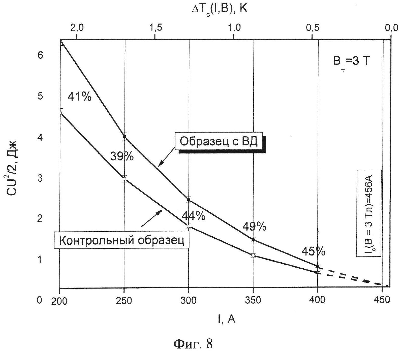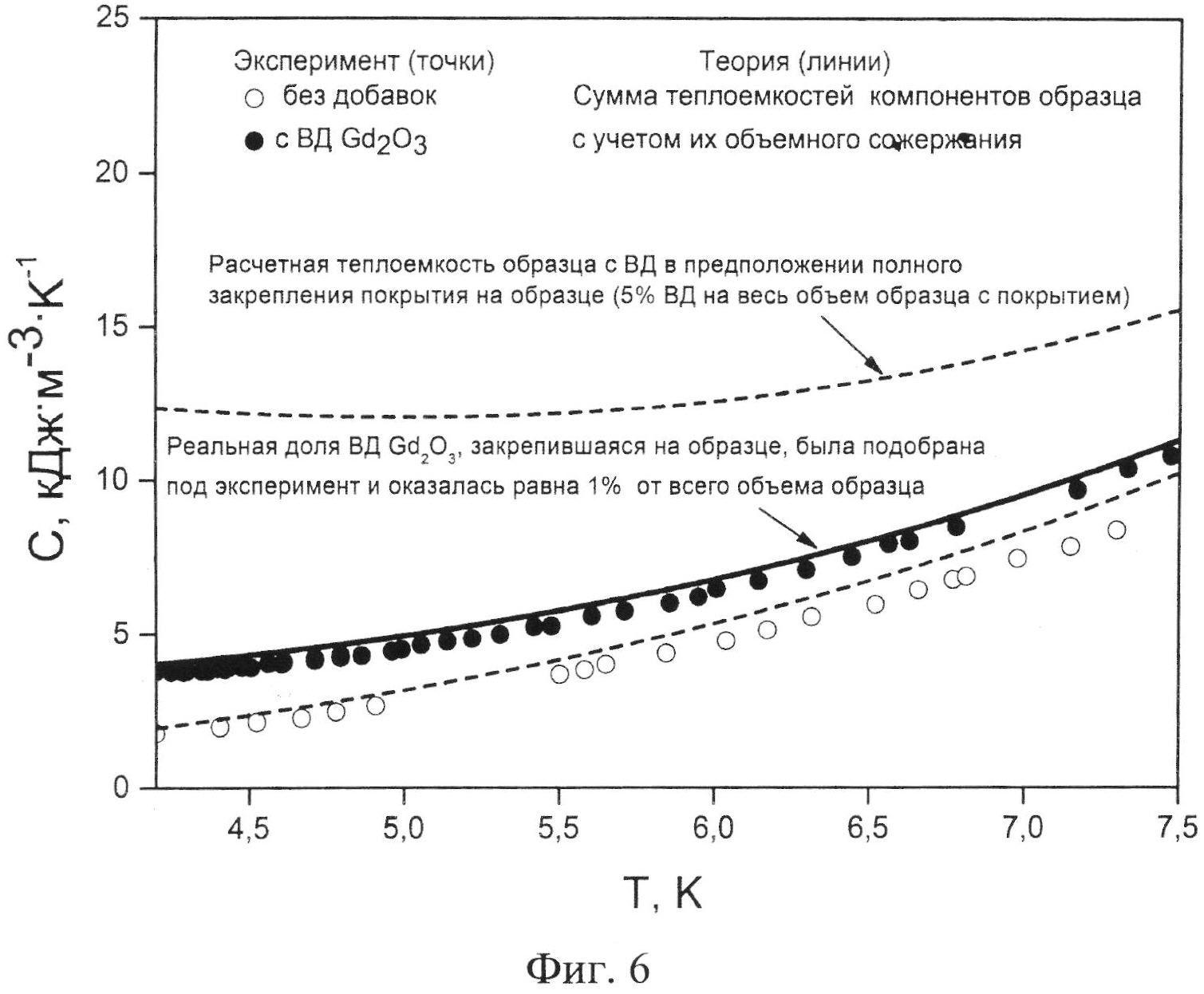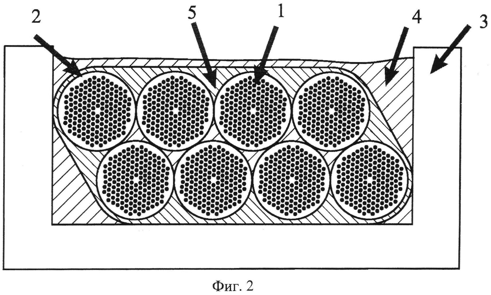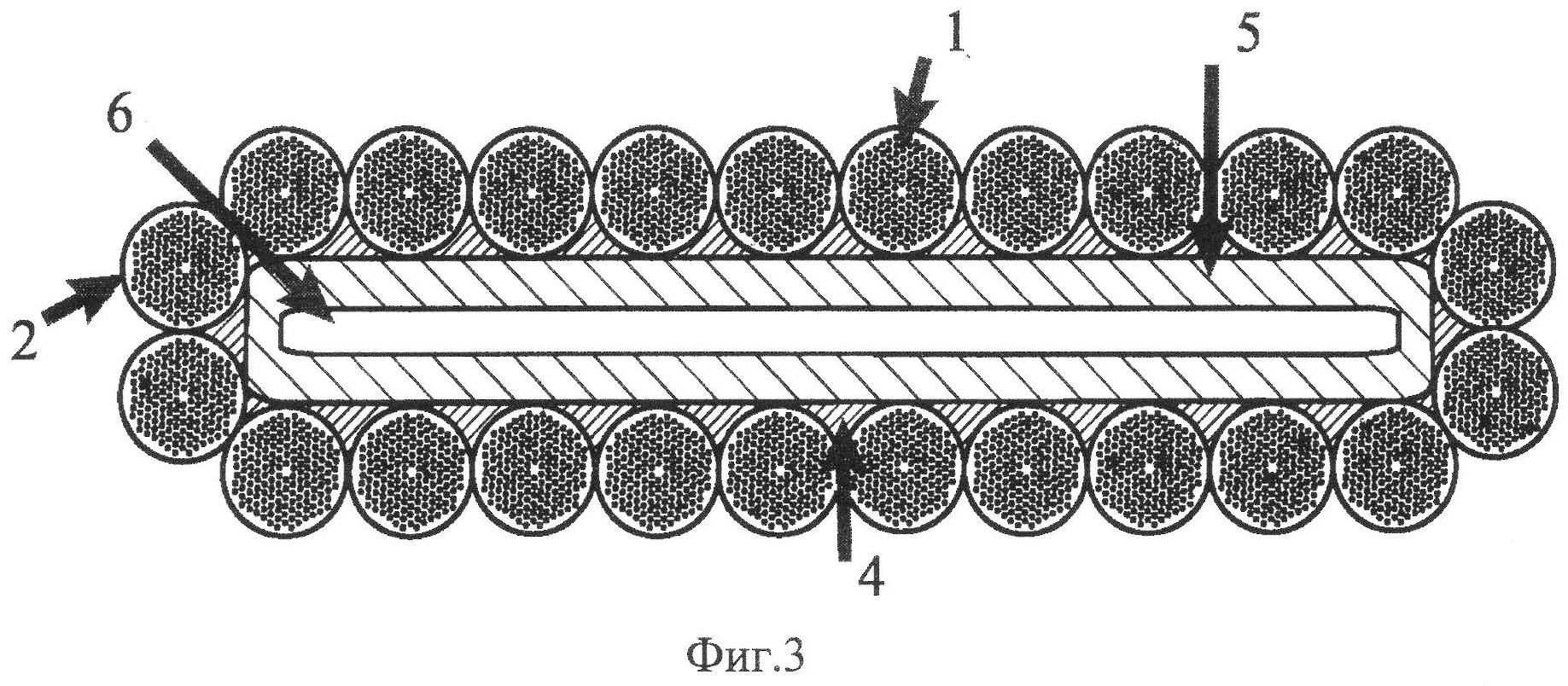 Изобретение относится к области прикладной сверхпроводимости и может быть использовано при изготовлении сильноточных сверхпроводников для работы в сильно нагруженных сверхпроводящих обмотках (механическое напряжение проводника >100 МПа), а также для сверхпроводящих обмоток и устройств, работающих в переменных режимах, например сверхпроводящих накопителей энергии, дипольных и квадрупольных магнитов для ускорителей заряженных частиц. Известен комбинированный сверхпроводник, представляющий собой сплющенную, одноповивную скрутку из нескольких проводов с волокнами из сверхпроводящего материала (плоский транспонированный кабель резерфордовского типа (резерфордовская скрутка) - по имени лаборатории, где конструкция была разработана), см. Уилсон М. Сверхпроводящие магниты. М.: Мир, 1985, с. 359-363. Недостатком известного комбинированного сверхпроводника является ограниченная способность работы в переменных режимах при скоростях изменения магнитного поля больше или порядка 1 Тл/с. Переменные магнитные поля, перпендикулярные и параллельные широкой стороне скрутки, наводят экранирующие токи между проводами в слоях и между слоями, что приводит к выделению тепла от этой составляющей электрических потерь. Это тепло должно поглощаться либо сверхпроводником за счет собственной теплоемкости, если обмотка плотная без каналов для прохода хладагента, либо хладагентом. Поскольку теплопоглощающая способность сверхпроводника ограничена нагревом до критической температуры сверхпроводника, а хладагента в каналах, соответственно, критическими явлениями в теплоотдаче на поверхности нагретого сверхпроводника, особенно в узких каналах (кризис режима кипения с резким, на десятки градусов, ростом температуры), то отсюда появляются временные ограничения на работу сверхпроводников в переменных режимах. Известен теплостабилизированный сверхпроводник, содержащий волокна из сверхпроводящего материала в матрице из металла или сплава с высокими проводящими свойствами и соединение из редкоземельных металлов с экстремально высокой теплоемкостью при низких температурах (например, CeAl3, CeCu6, HoCu2, PrB6, Gd2O3, Gd2O2S, U6Fe, UBe13, UZn17), либо в виде мелких частиц, диспергированных (распределенных) по всей матрице, либо в виде жил с существенно меньшим поперечным размером, чем сверхпроводящие волокна, причем эти жилы проходят по сверхпроводнику параллельно сверхпроводящим волокнам, либо в виде кольцевого слоя, окружающего матрицу, с одним сверхпроводящим волокном, либо в виде концентрических слоев, чередующихся с металлом матрицы, либо в виде собственно матрицы, содержащей в себе сверхпроводящие волокна [патент США №4623862, МПК P01F 7/22, 1986]. Введение соединения из редкоземельных элементов с экстремально высокой теплоемкостью (например, при температуре кипения жидкого гелия 4,2 К теплоемкость интерметаллида HoCu2 в 450 раз больше, чем у меди, а у керамики Gd2O2S соответственно в 650 раз) в состав сверхпроводников с объемной долей 3-6% в 5-10 раз повышает их среднюю объемную теплоемкость. Соответственно возрастает их теплопоглощающая способность и способность к работе в переменных режимах, а также в условиях больших механических напряжений сверхпроводника, когда необходима способность противостоять импульсным локальным тепловыделениям механического происхождения (на