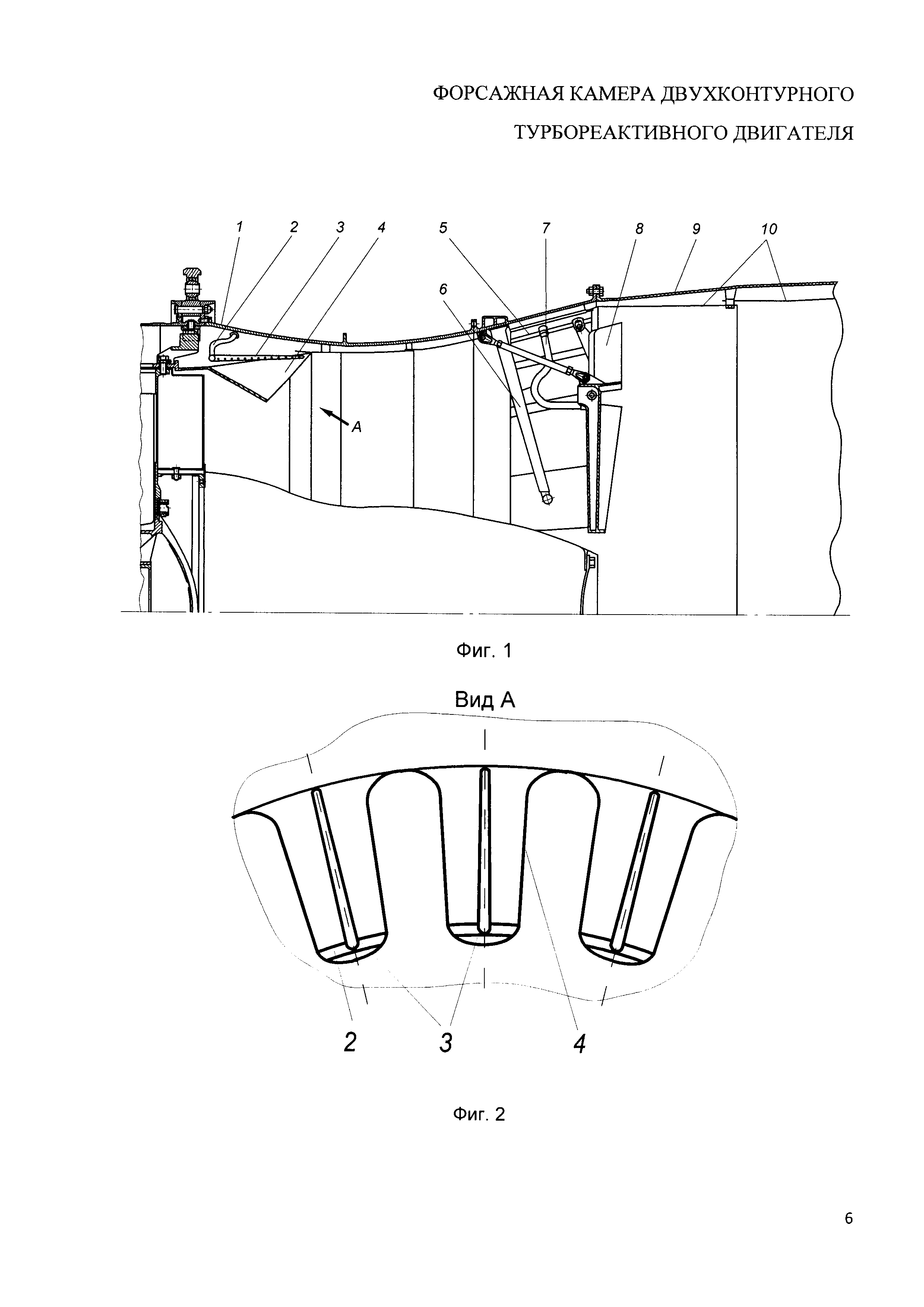 Изобретение относится к области авиационного двигателестроения, в частности к форсажным камерам авиационных турбореактивных двухконтурных двигателей со смешением потоков. Форсажная камера двухконтурного турбореактивного двигателя содержит корпус, смеситель, фронтовое устройство с распылителями форсажного топлива, стабилизаторами пламени. Перед смесителем во втором контуре установлен дополнительный коллектор с распылителями. Распылители дополнительного коллектора располагаются посередине карманов смесителя, что обеспечивает создание топливовоздушной смеси с коэффициентом избытка воздуха, равным аналогичному коэффициенту в горячем газе за турбиной. Изобретение позволяет получать газовый потока с требуемым коэффициентом избытка воздуха в любой точке сечения перед фронтовым устройством форсажной камеры, что упрощает задачу равномерного распределения форсажного топлива в поперечном сечении. 2 ил.