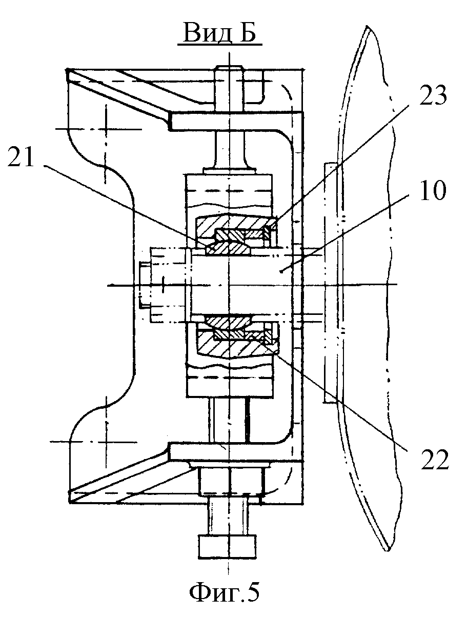 цапфе 10 выхлопной трубы 1 с помощью сферического подшипника 21, втулки 22 и стопорного кольца 23, а также гайки 24. Такое крепление обеспечивает перемещение выхлопной трубы 1 в вертикальной и