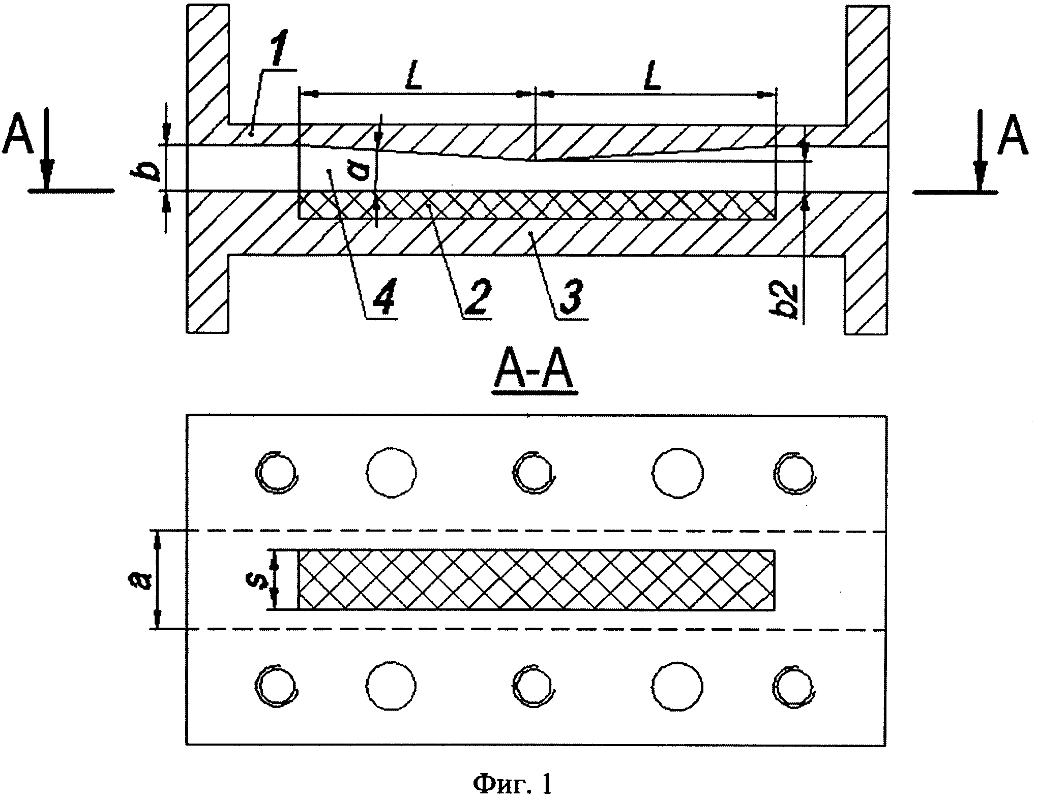 1. СВЧ-аттенюатор, содержащий металлический прямоугольный волновод, поглотитель и экран, отличающийся тем, что волновод выполнен с высотой b узкой стенки и шириной а широкой стенки, в котором образованы два сопряженных друг с другом идентичных плавных перехода длиной L переменной высоты, уменьшающейся до b2, поглощающая поверхность каждого перехода совмещена с поглощающей поверхностью поглотителя шириной s, расположенной на одной из широких стенок волновода, а отражающая поверхность перехода расположена на противоположной широкой стенке, при условии s<a, α=arctg((b-b2)/L), где α - угол наклона перехода. 2. СВЧ-аттенюатор по п. 1, отличающийся тем, что поглощающая поверхность поглотителя выполнена в виде прямоугольника, причем его ширина s находится в пределах 0.6а≤s≤0.7а. 3. СВЧ-аттенюатор по п. 1, отличающийся тем, что все стенки одного из плавных переходов металлизированы.