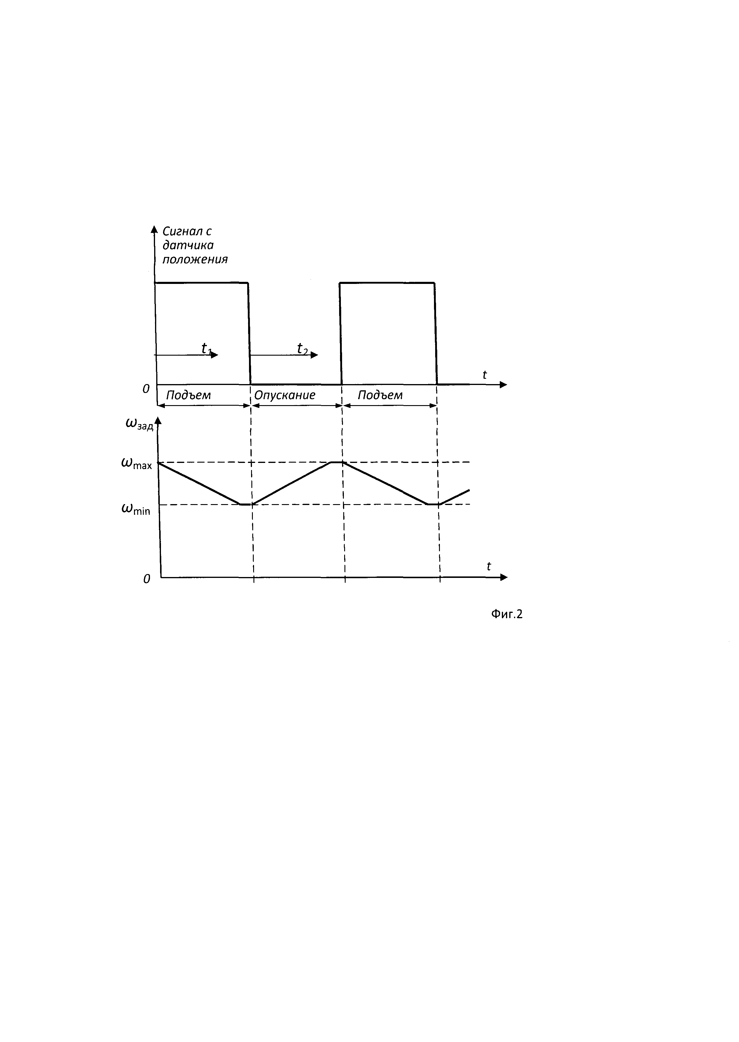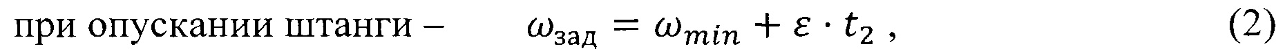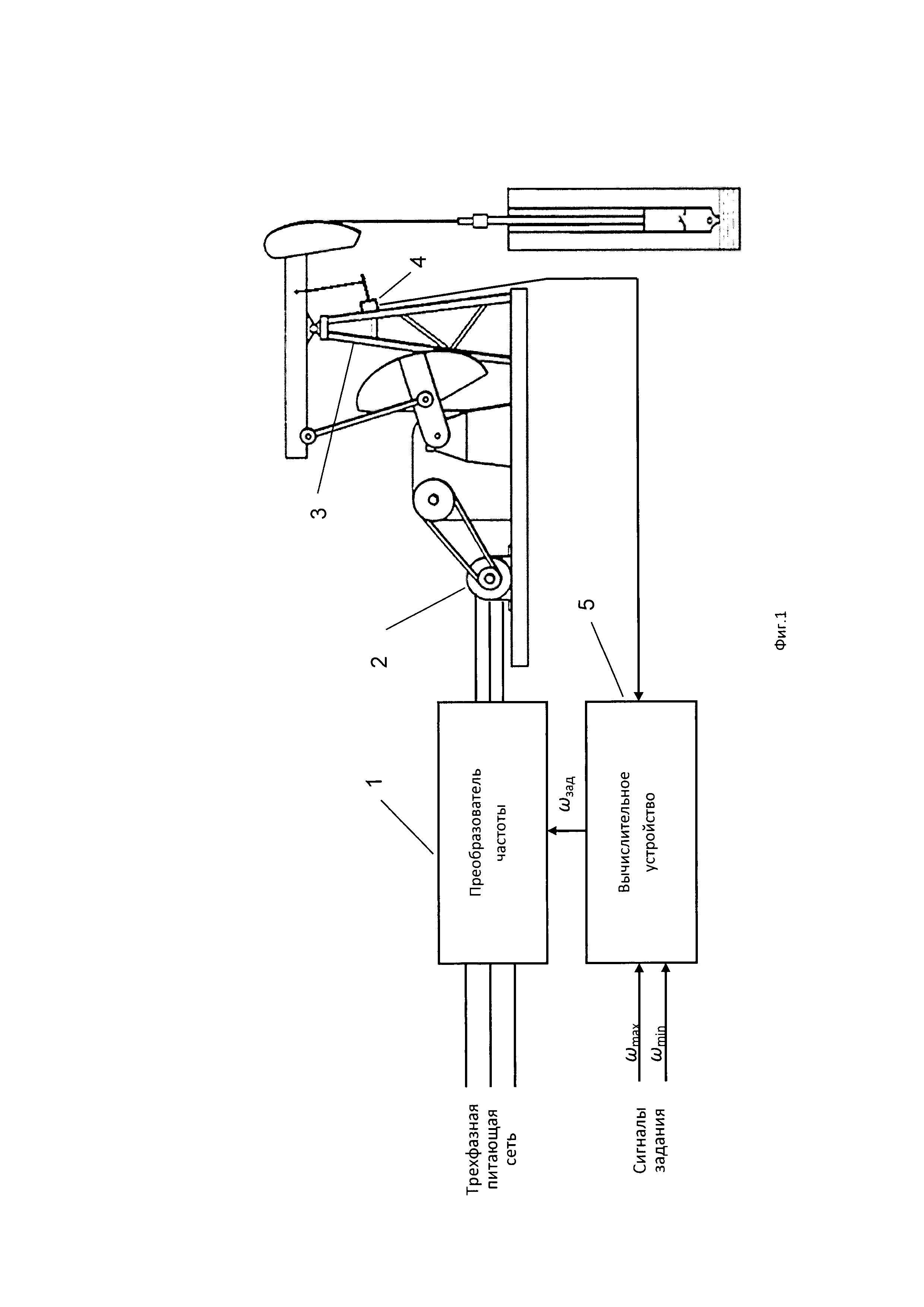 Способ управления частотно-регулируемым электроприводом штангового глубинного насоса, при котором асинхронный двигатель, получающий питание от преобразователя частоты, приводит в движение механизм штангового глубинного насоса, а для регулирования скорости асинхронного двигателя применяют вычислительное устройство, использующее сигнал с датчика положения штанги насоса и выдающее на преобразователь частоты управляющий сигнал, устанавливающий заданную скорость ωзад вращения асинхронного двигателя, отличающийся тем, что сигнал с датчика положения штанги насоса используют вычислительным устройством для определения направления движения штанги насоса, а сигнал управления скоростью, подаваемый с выхода вычислительного устройства на вход преобразователя частоты, используют для уменьшения или увеличения заданной скорости вращения двигателя при подъеме или опускании штанги согласно следующим уравнениям: при подъеме штанги - ωзад = ωmax - ε⋅t1, при опускании штанги - ωзад = ωmin + ε⋅t2, где ωmax - максимальное значение заданной скорости вращения асинхронного двигателя, устанавливаемое из технологических условий работы насоса; ωmin - минимальное значение заданной скорости вращения асинхронного двигателя, устанавливаемое с целью уменьшения мощности применяемого электропривода и допустимое из технологических условий работы насоса; t1 - время, отсчитываемое от момента начала подъема штанги, t2 - время, отсчитываемое от момента начала опускания штанги; i - передаточное число редуктора между осями двигателя и кривошипа.