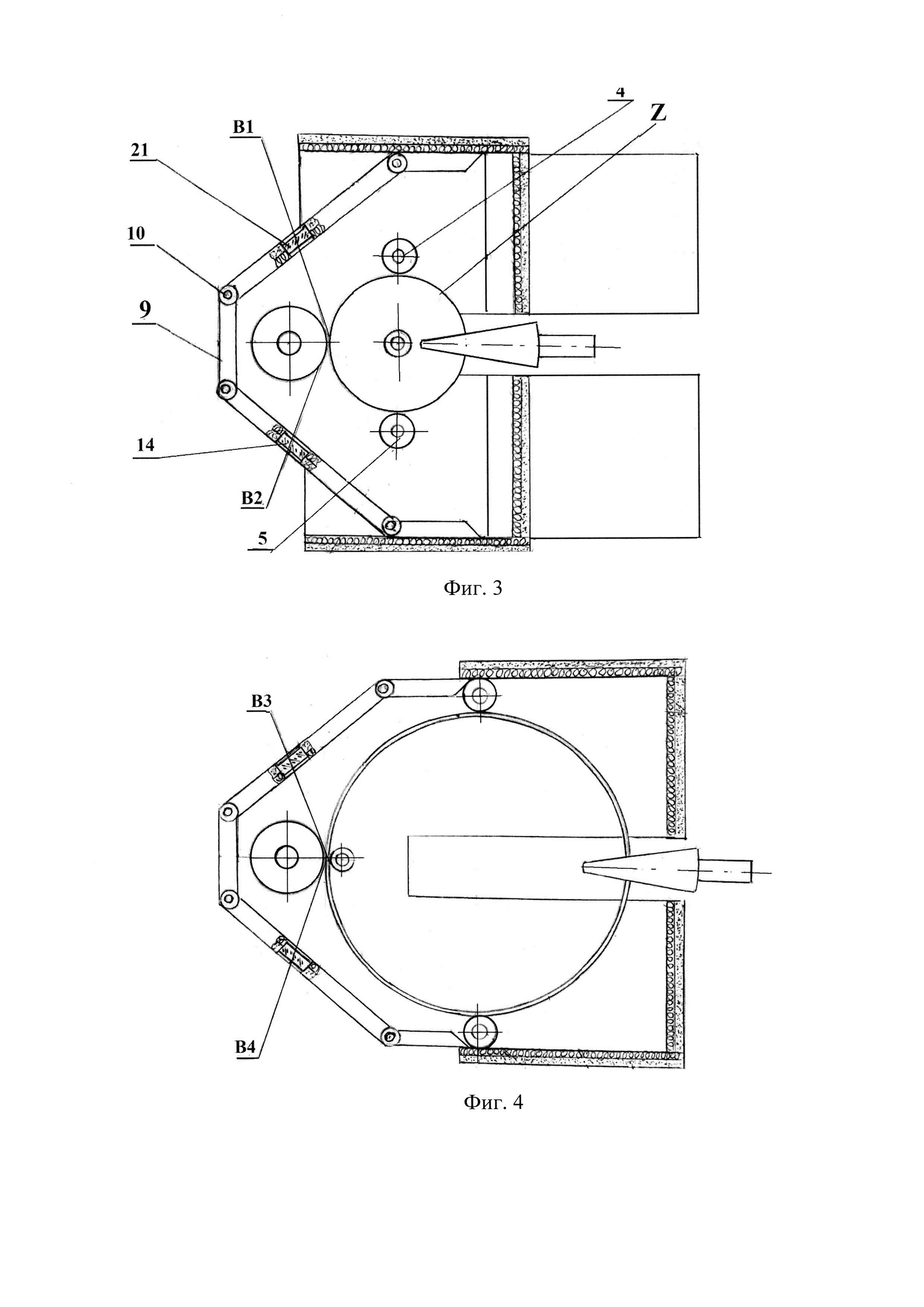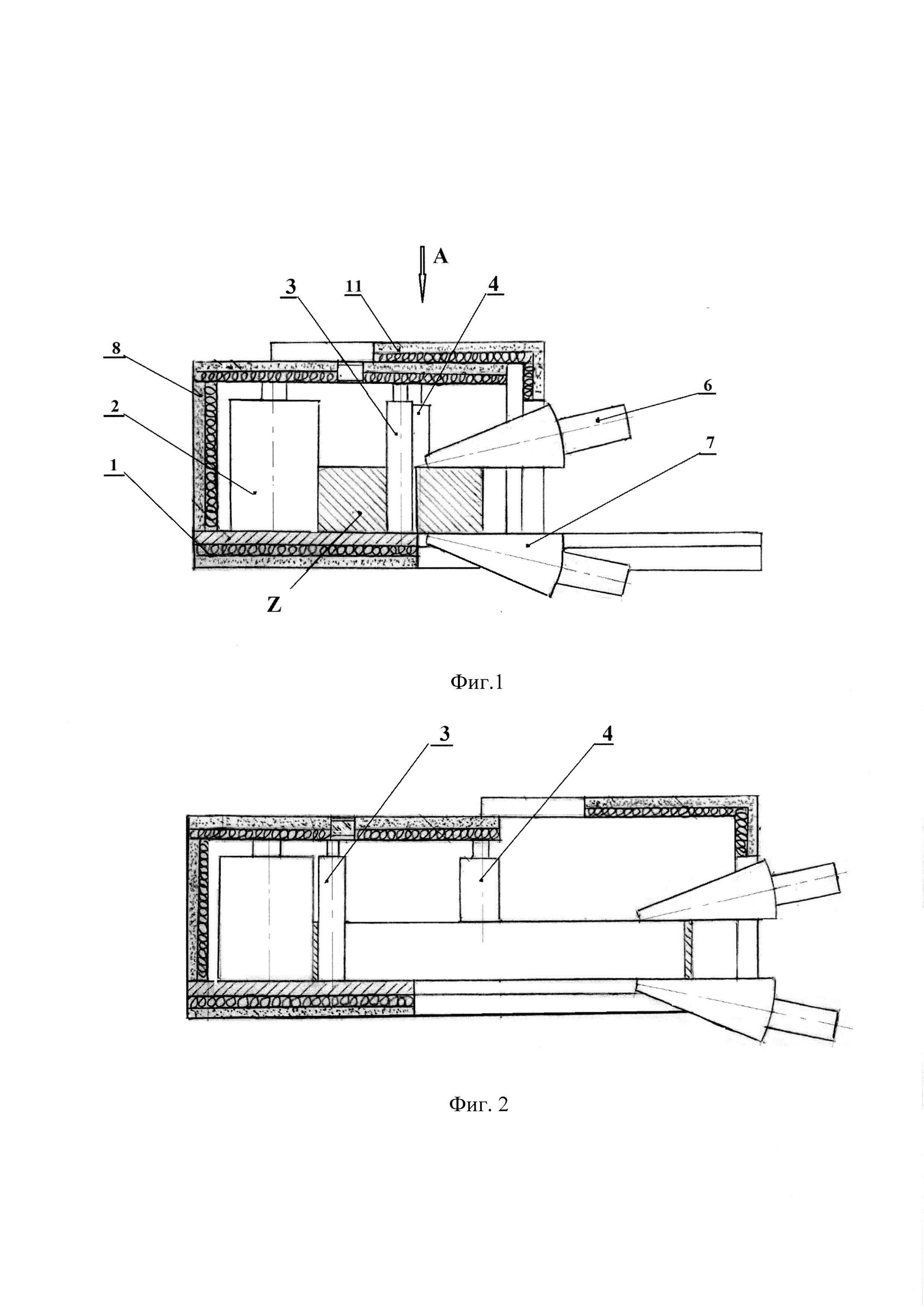Изобретение относится к устройствам обработки металлов давлением с целью получения кольцевых деталей из жаропрочных сплавов и сталей. Известен стан для раскатки колец из жаропрочных сплавов, содержащий раскатный стол, систему цилиндрических опорных и подвижных валков и подвижных конических валков, исполнительные механизмы вращения и перемещения валков, систему вращения заготовки кольца и контрольно-измерительную аппаратуру. (См. раздел «Кольцепрокатные станы» / Металлоснабжение и сбыт // - 2015, - №3, С. 48-50) Заготовка для раскатки кольца предварительно изготавливается по следующему технологическому процессу. Первоначально из прутка отрезается определенной длины первичная заготовка (предзаготовка), которая подвергается нагреву до температуры раскатки. Предзаготовка в горячем состоянии подвергается осадке на прессе (возможно за несколько операций осадки) с обязательной теплоизоляцией поверхности заготовки. В полученном диске прошивается центральное отверстие для установки на центральный валок. Заготовка кольца устанавливается на раскатном столе с помощью цилиндрических опорных волков, а раскатка кольца осуществляется посредством подвижных цилиндрических и конических валков. Раскатка производится в открытом пространстве за один нагрев заготовки. При уменьшении температуры в зоне деформации ниже допустимой величины производится подогрев кольца с помощью газовых горелок. Такой подогрев не обеспечивает постоянство температуры в зоне деформации, что не гарантирует сохранение структуры материала. Следовательно, известный кольцераскатный стан не обеспечивает возможности раскатки колец с заданной геометрией из жаропрочных сплавов, вследствие отсутствия возможности обеспечить изотермические условия в процессе всего периода раскатки, при нарушении которых в изделии могут также появиться напряжения и трещины, существенно ослабляющие материал кольца. Техническим результатом предложения является создание стана для раскатки колец из жаропрочных сплавов с заданной геометрией без ухудшения качества материала. Для этого стан для раскатки колец из жаропрочных сплавов, содержащий раскатный стол, систему цилиндрических опорных и подвижных валков и подвижных конических валков, исполнительные механизмы вращения и перемещения валков, систему вращения заготовки кольца и контрольно-измерительную аппаратуру, оснащен камерой нагрева, состоящей из неподвижного с верхней крышкой блока и подвижного блока, кинематически связанного с исполнительными механизмами вращения и перемещения валков с возможностью синхронного перемещения подвижного блока камеры нагрева с коническими валками вдоль раскатного стола при его одновременном подогреве, а контрольно-измерительная аппаратура включает инфракрасный термометр и оптическую систему для непрерывного контроля температуры в зоне раскатки, камеру контроля точности изготовления круга кольца, включающую ПЗС камеру с оптической системой и систему контроля геометрии торца кольца, состоящую из лазерного излучателя с оптической системой, полупрозрачного зеркала с оптической системой и приемной телевизионной камерой. Заявленный результат достигается наличием в устройстве камеры нагрева, содержащей подвижный блок, синхронно перемещающийся с раскатными роликами вд