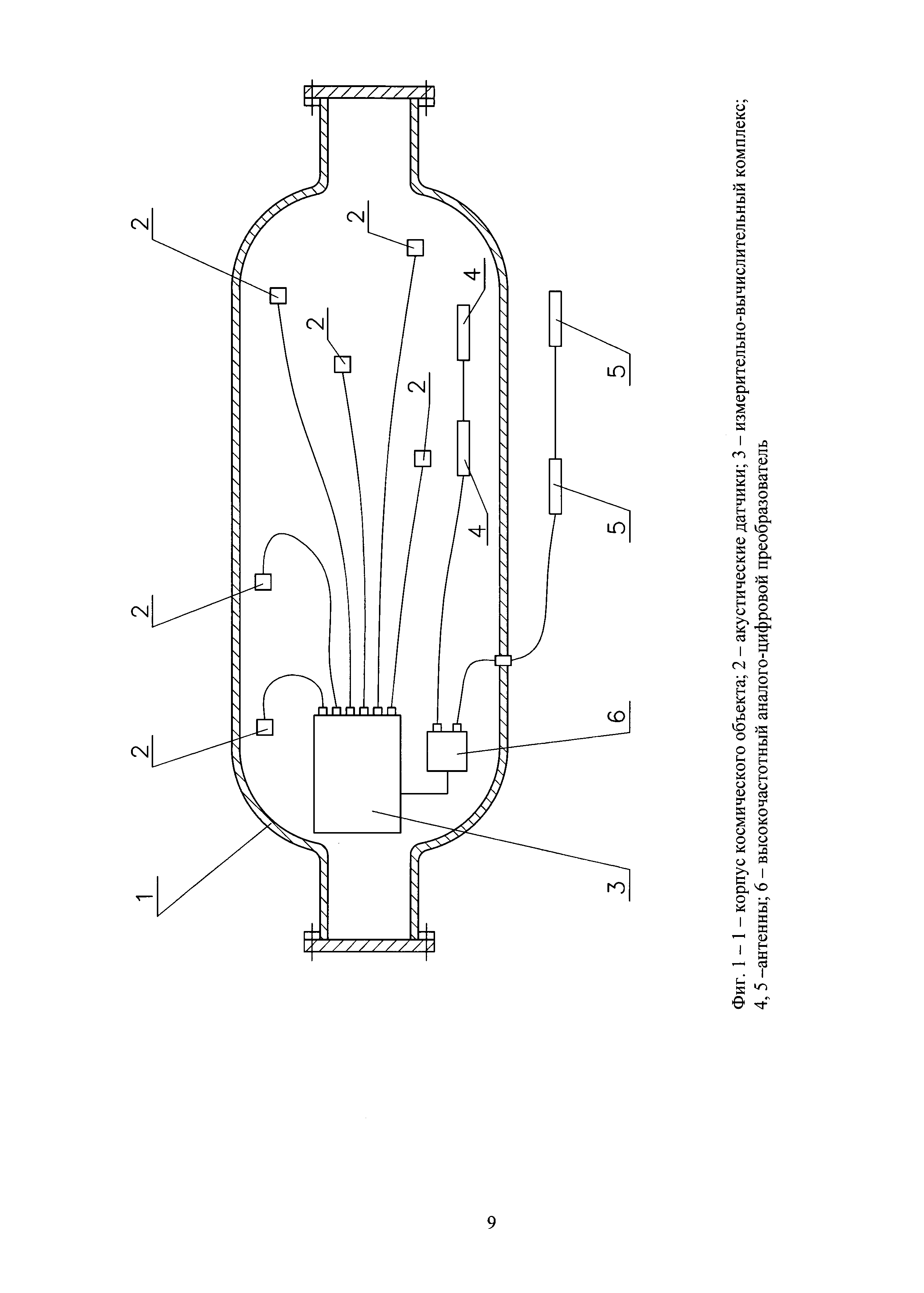 1. Способ определения координат места пробоя корпуса гермоотсека космического объекта частицей природного или техногенного происхождения, заключающийся в определении и запоминании координат акустических датчиков в заданной системе координат, отличающийся тем, что по сигналам, принимаемым высокочастотными антеннами, расположенными вблизи поверхности гермоотсека, определяют время пробоя гермоотсека, а по сигналам с акустических датчиков - момент прихода звуковой волны к каждому из них, после чего вычисляют координаты места пробоя из решения системы уравнений: 2. Устройство для реализации способа по п.1, содержащее набор акустических датчиков, размещенных в объеме гермоотсека по заданной схеме, отличающееся тем, что внутри гермоотсека и на его наружной поверхности расположены антенны, выполненные в виде соленоидов с каркасом из диэлектрического материала, обмотки которых связаны с высокочастотным аналого-цифровым преобразователем, подключенным к регистрационно-расчетному блоку, при этом антенны установлены внутри гермоотсека и на его поверхности равномерно.