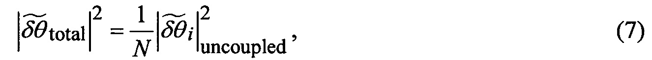 - фазовый шум отдельного генератора. Соотношение (7) справедливо и для цепочки N генераторов, ближайшие из соседей которых обладают двусторонней связью. Оно справедливо также и для другой формы записи - через спектральные плотности мощности фазовых флуктуаций отдельного и совокупного генераторов.