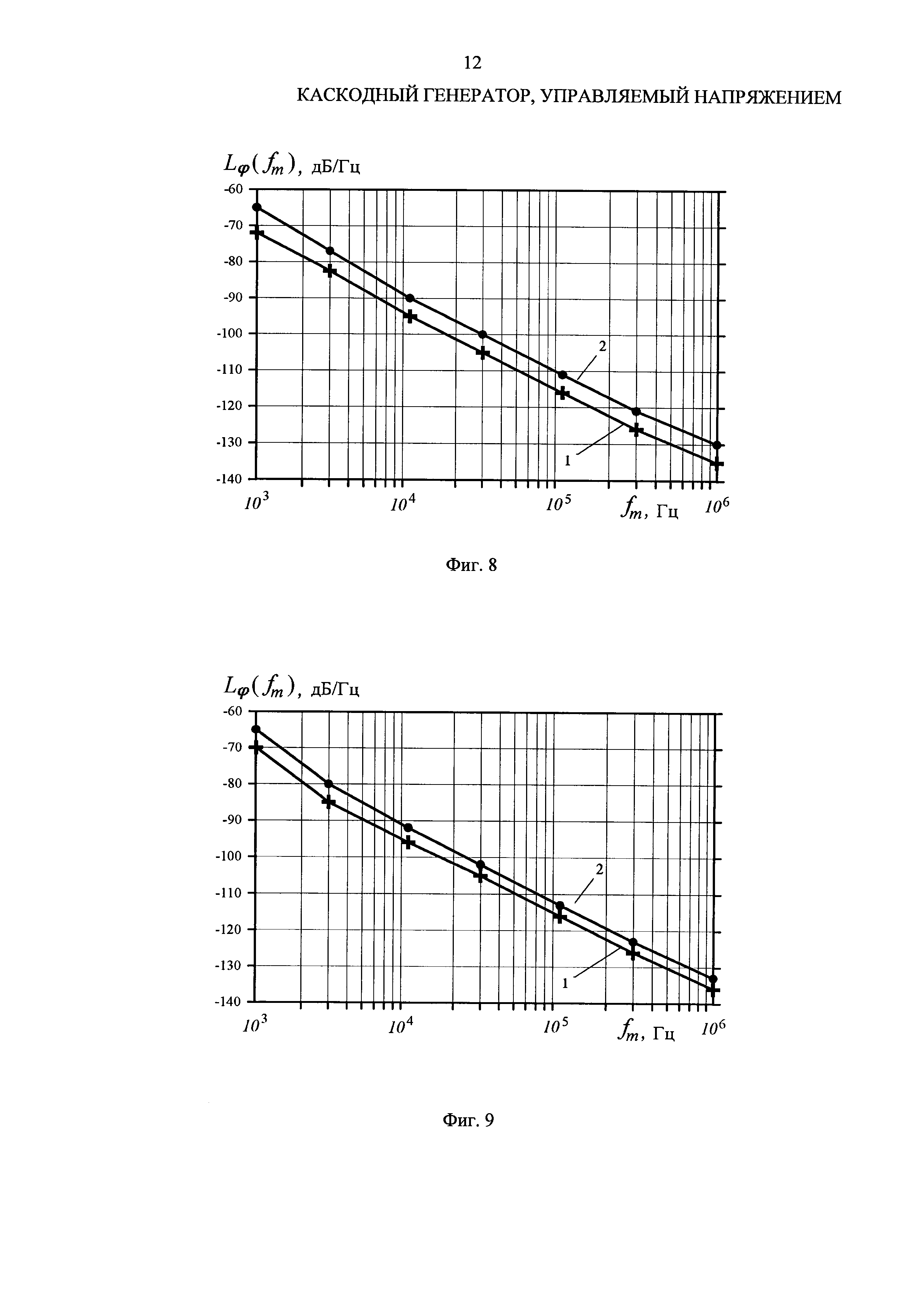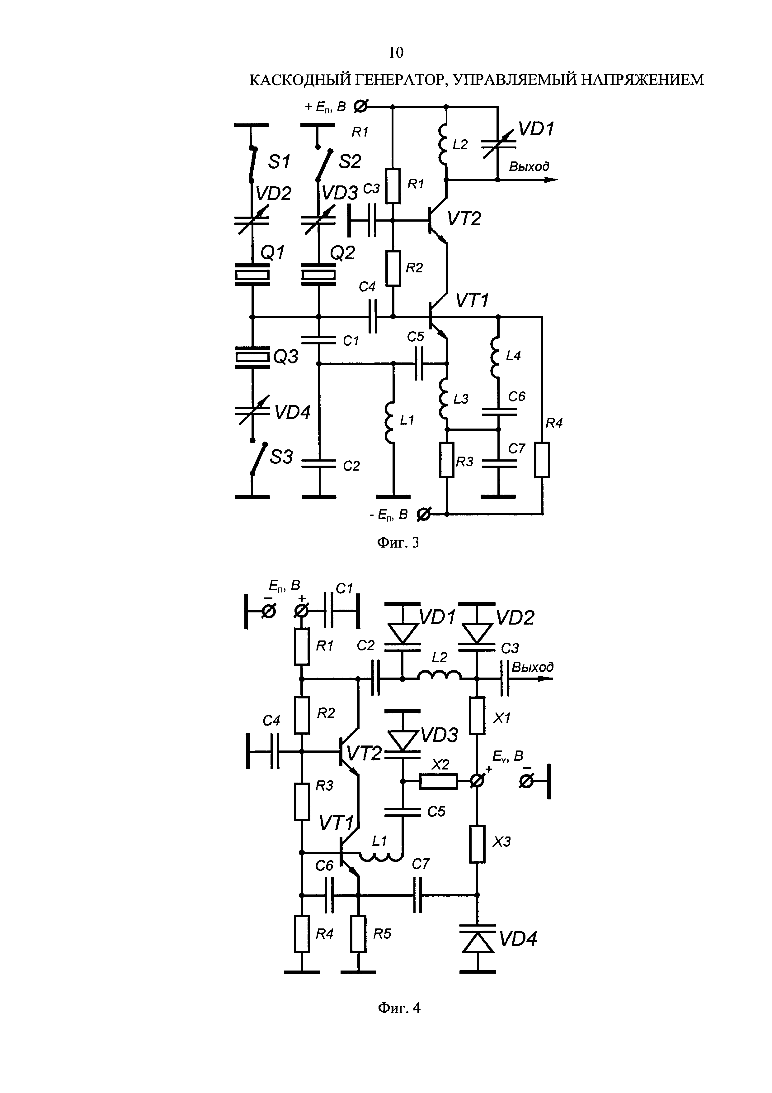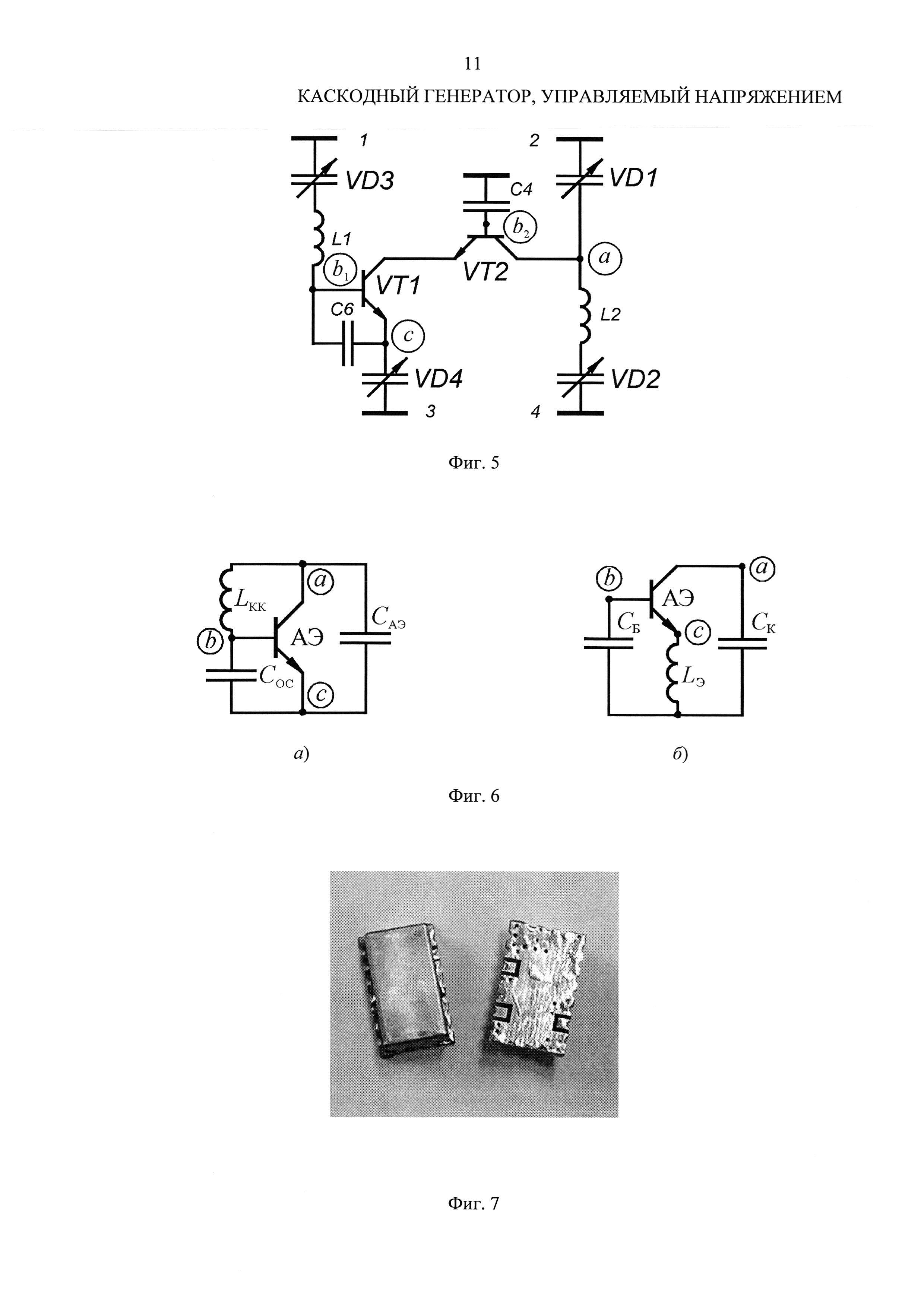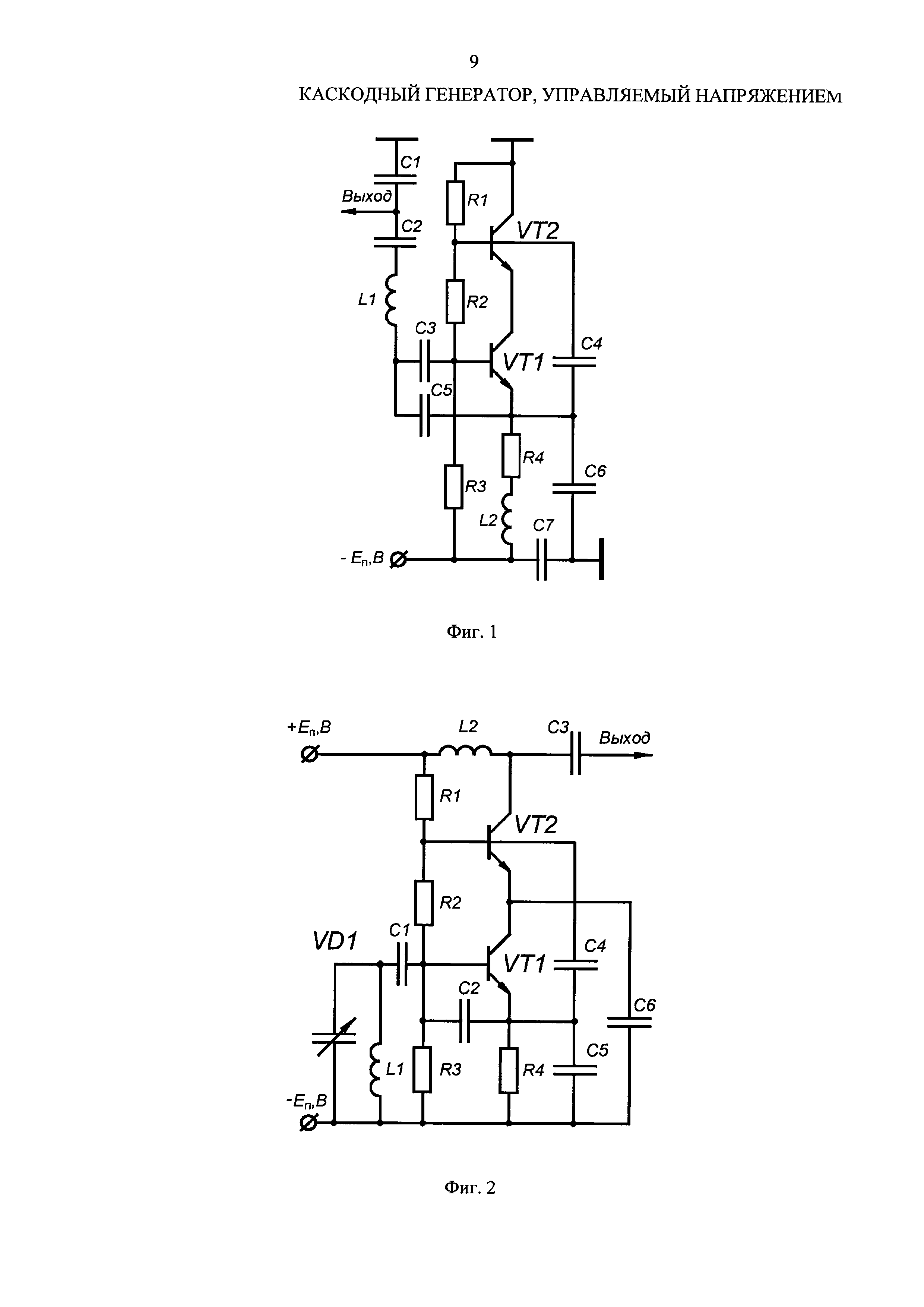 Предлагаемое устройство относится к области радиотехники и может быть использовано в синтезаторах частот, работающих вплоть до СВЧ диапазона. В частности, данное устройство относится к малошумящим генераторам, управляемым напряжением, (ГУН) на транзисторах, которые включены по каскодной схеме «общий эмиттер - общая база». Такая схема генератора обеспечивает расширение полосы перестройки частот при повышенной развязке между сопротивлениями выходной нагрузки и резонансной цепи. Известен автогенератор, использующий каскодное включение двух транзисторов по схеме «общий эмиттер - общая база» (ОЭ-ОБ) (См. Лучинин, А.С. Разработка малошумящих автогенераторов на биполярных транзисторах / А.С. Лучинин // Радиоэлектроника (Изв. высш. учеб. заведений). - 1987. - Т. 30. - №3. - С. 3-8). Автогенератор (см. фиг. 1) состоит из двух транзисторов VT1 и VT2, включенных по каскодной схеме, четырех резисторов R1-R4 с элементами L2 и С7, которые обеспечивают режим их работы по постоянному току, и элементов L1 и C1-С6, которые вместе с транзисторами образуют емкостную трехточку. В генераторах на одном транзисторе на высоких частотах обычно не удается обеспечить высокую добротность контура и их шумовые свойства получаются плохими. Включение второго транзистора по схеме с общей базой позволяет значительно увеличить выходное сопротивление активного элемента генератора без заметного ухудшения шумовых свойств, которые обеспечиваются первым транзистором. Если в данном генераторе с положительной (неэлектромагнитной) обратной связью трехточечного типа пренебречь неизохронностью, связанной с активным элементом или варикапами, то спектральная плотность мощности фазовых флуктуаций генератора Lϕ(ƒm) может быть описана с помощью простой модели [1] и выражена следующими формулами: где ƒm - частота анализа, ƒL=ƒ0/(2QН) - частота Лисона, ƒ0 - частота генерации, Lψ(ƒm) - спектральная плотность мощности фазовых шумов каскодного усилителя: Здесь ƒс - верхняя граничная частота области доминирования фликер-шума в спектральной плотности мощности шумов транзисторного усилителя (граничная фликерная частота), Lϕe(ƒm) - спектральная плотность мощности фазовых шумов усилителя, связанная с действием естественных шумов, которая находится из выражения: где Fϕe - коэффициент «естественного» фазового шума, зависящий от условий согласования транзисторного усилителя и уровня его сигнала, kТ=-174 дБм - термодинамический потенциал при 293 град K, Р В рассматриваемом автогенераторе предполагается, что ƒс<ƒm min и ƒL>fm max (ƒm min и fm max - минимальная и максимальная частоты анализа), поэтому здесь оптимизируется величина спектральной плотности мощности фазовых шумов: К сожалению, с помощью упрощенной модели [1] не всегда можно описать реальный спектр шумов генераторов, поскольку она часто приводит к неправильной оценке их уровня. Недостатком данного аналога является относительно высокий уровень спектра его фазовых шумов. Известен управляемый напряжением генератор (См. Phuc С. Pham Voltage controlled oscillator having cascaded output / Phuc C. Pham // Патент США US 5245298A. - Опубл. 14.09.1993). Устройство (см. фиг. 2) содержит каскад на транзисторе VT1, использующий для генерации колебаний технику создания отрицательного сопротивления на его входе, и буферный каскад усиления на транзисторе VT2, чтобы обеспечить развязку сопротивлений генератора и выходной нагру