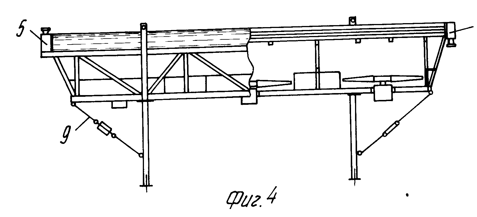 по длине тяг 9, шарнирно закрепленных на концах консольных участков каркаса 1 и стойках 2. Это средство может быть также выполнено в виде гибких тяг (расчалок) с регулировкой их длины