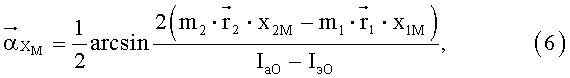 отклонения продольной главной центральной оси инерции 6 от оси симметрии образцовой меры моментов инерции Х в системе координат, связанной с этой мерой моментов инерции. Для этого приспособления для укрепления контрольных грузов с известными угловыми положениями в системе координат образцовой меры моментов инерции располагают равномерно по окружностям известных радиусов r1 и r2 вблизи торцов или на торцах 2 и 3 на расстояниях х1нач и х2нач от центра масс образцовой меры моментов инерции. Массы контрольных грузов m1 и m2, прикрепляемых соответственно вблизи торцов или к торцам 2 и 3 образцовой меры моментов инерции для моделирования (задания) требуемых значений контролируемых массо-центровочных характеристик, рассчитывают в соответствии с законами статики по формулам