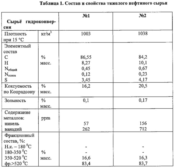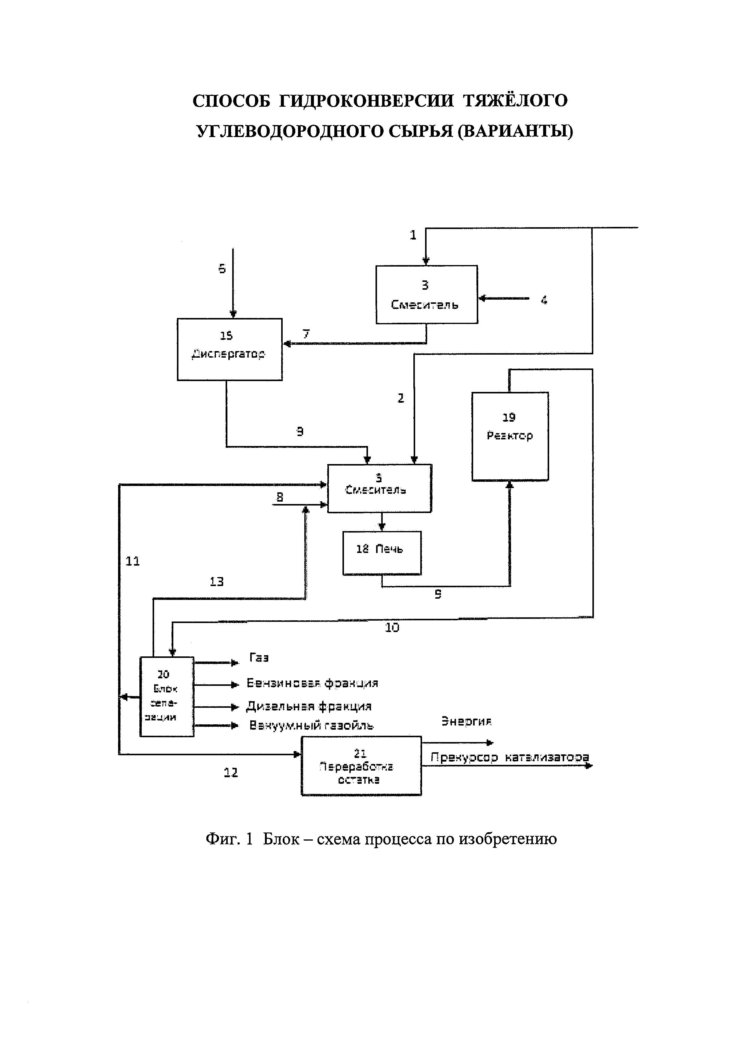 Изобретение относится к способам переработки углеводородных масел в атмосфере водорода в присутствии дисперсных, ультрадисперсных или наноразмерных катализаторов. Изобретение может быть использовано при переработке тяжелого углеводородного сырья (ТУС): тяжелых битуминозных нефтей, природных битумов, высококипящих остатков переработки нефти (остатков дистилляции, термокаталитических и других процессов переработки нефти), сланцевых смол, смол, получаемых при коксовании углей, а также смесей перечисленных продуктов, и предназначен для получения жидких углеводородных продуктов с более низкой температурой кипения, чем исходное сырье. Процесс переработки ТУС в атмосфере водорода в присутствии дисперсных, ультрадисперсных или наноразмерных катализаторов для получения жидких углеводородных продуктов с более низкой температурой кипения, чем исходное сырье, в настоящей заявке обозначается как "гидроконверсия". В отличие от традиционных легких и средних нефтей тяжелое углеводородное сырье характеризуется низким отношением Н/С, низким содержанием дистиллятных фракций, более высокими содержаниями смол, асфальтенов и металлов. Поэтому процессы прямой конверсии тяжелого сырья в дистилляты являются особенно сложными и предполагают снижение молекулярной массы компонентов сырья и увеличения отношения Н/С. В настоящее время промышленная переработка ТУС проводится преимущественно методами коксования, термического крекинга и висбрекинга. Используемые процессы не эффективны из-за невысокого выхода дистиллятных фракций и их низкого качества, а также в связи с образованием побочных продуктов - кокса, асфальтита. Каталитические процессы гидропереработки нефтяного сырья существенно более эффективны и позволяют увеличить выход дистиллятных продуктов до 90%. Однако при переработке ТУС с использованием гранулированных катализаторов в стационарном или псевдоожиженном слое последние быстро теряют активность в результате отложения металлов и кокса. Поэтому при каталитической гидропереработке ТУС с использованием гранулированных катализаторов из сырья необходимо предварительно удалить металлы, например, методом деасфальтизации, что существенно усложняет технологический процесс и снижает выход светлых продуктов. В последние годы интенсивно разрабатываются процессы гидрокрекинга (гидроконверсии) ТУС с использованием дисперсных ("ультрадисперсных", "наноразмерных") катализаторов, равномерно распределенных в сырье в форме суспензии каталитических частиц металлов молибдена, никеля, кобальта, вольфрама с размерами 50-500 нм. Подобные процессы гидроконверсии запатентованы в России и за рубежом (ИНХС РАН, HCat компании Neste Oil, UOP UNIFLEX PROCESS, Exxon Со - процесс, Eni Slurry Technology). Формирование катализатора происходит непосредственно в реакционной зоне (in situ) из предварительно введенного в сырье предшественника (прекурсора) катализатора. Известны способы гидроконверсии ТУС, основанные на использовании в качестве прекурсоров маслорастворимых органических производных молибдена, никеля, кобальта. В способе по патенту RU 2049788 C1, C07F 11/00, опубл. 10.12.1995, в качестве прекурсора используют специально синтезированное олеофильное соединение молибдена, предназначенное для использования при гидроконверсии углеводородов и изображаемое нижеследую