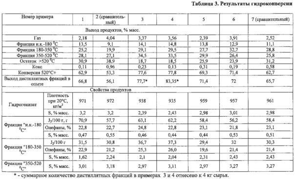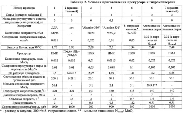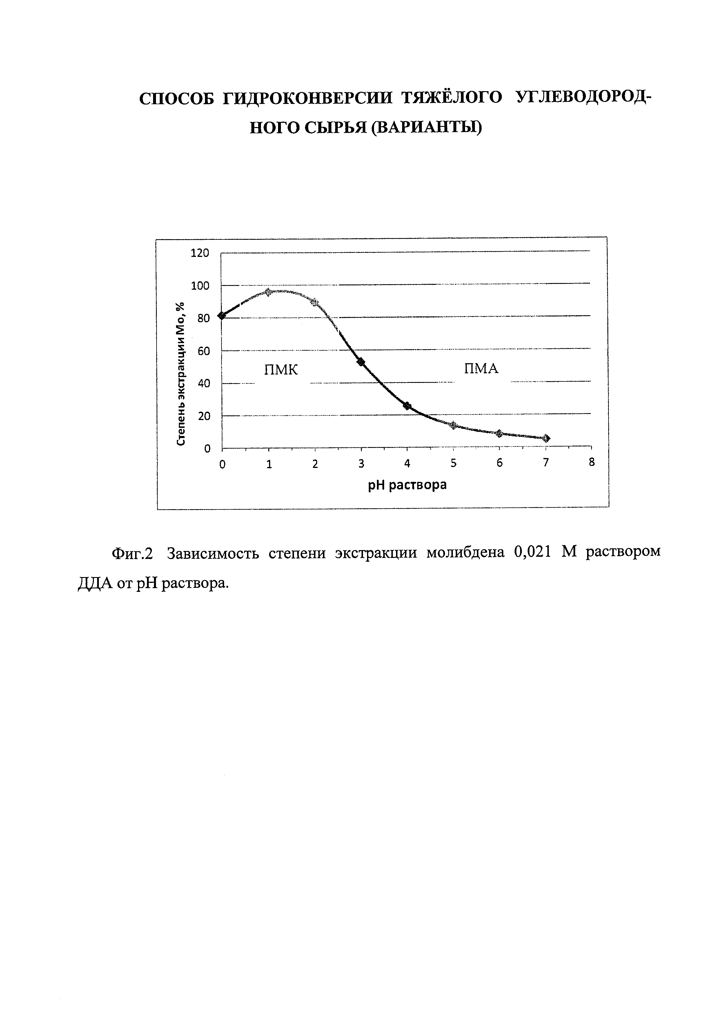 Изобретение относится к способам гидроконверсии тяжелого углеводородного сырья (ТУС) в присутствии дисперсных, ультрадисперсных или наноразмерных катализаторов. Указанный способ может быть использован при гидроконверсии тяжелых битуминозных нефтей, природных битумов, высококипящих остатков переработки нефти и предназначен для получения жидких углеводородных продуктов с более низкой температурой кипения, чем исходное сырье. Способ гидроконверсии тяжелого углеводородного сырья включает приготовление водного раствора прекурсора катализатора - полимолибденовой кислоты Hn[H2+2kMo1+mO4+3m+k], где m>7, k>2, n=1-5, имеющего значение pH от 0,5 до 3 (предпочтительно 1-2,5), эмульгирование этого раствора в сырье или его части, смешение подготовленного сырья, содержащего эмульгированный прекурсор катализатора, с водородсодержащим газом, нагрев полученной газожидкостной смеси до сульфидирования прекурсора катализатора, гидроконверсию в восходящем потоке сырья при давлении 5-9 МПа в присутствии образующегося из прекурсора катализатора с размерами частиц менее 100 нм, разделение полученных продуктов в системе сепараторов и рециркуляцию водородсодержащего газа на стадию смешения. В одном варианте перед эмульгированием в сырье вводят экстрагент прекурсора катализатора, выбранный из первичных, вторичных и третичных аминов с числом атомов углерода в алкильных заместителях не менее 8, органических соединений, включающих пиридиновые, хинолиновые или пиррольные группы, и промышленных азотсодержащих экстрагентов. Мольное отношение введенного экстрагента и прекурсора (в пересчете на моль MoO3) - от 2:1 до 20:1, соотношение объемов органической и водной фаз при эмульгировании - от 20:1 до 200:1, предпочтительно от 25:1 до 100:1. В другом варианте углеводородное сырье содержит азотистые основания, являющиеся экстрагентом по отношению к прекурсору катализатора при атомном отношении содержания основного азота в сырье Νоснов к содержанию молибдена, входящего в состав прекурсора, от 20:1 до 100:1 (предпочтительно 40:1-80:1) и содержании Nоснов в углеводородном сырье не менее 0.3%. Вязкость сырья, содержащего экстрагент, при температуре эмульгирования 50-90°С - от 0,5 до 2,5 Па⋅сек. Перед смешением водородсодержащий газ подогревают до 420-450°С. Гидроконверсию осуществляют при 420-450°С, соотношении водород:сырье = (500-1500):1 нл/л, длительности пребывания сырья в реакционной зоне 0,33-2 ч. Предпочтительно часть непревращенного остатка гидроконверсии рециркулируют на стадию смешения, а другую часть используют для регенерации прекурсора катализатора, который рециркулируют на стадию эмульгирования. Технический результат - повышение активности катализатора, конверсии, выхода дистиллятных продуктов, снижение коксообразования. 2 н. и 15 з.п. ф-лы, 2 ил., 3 табл., 7 пр.