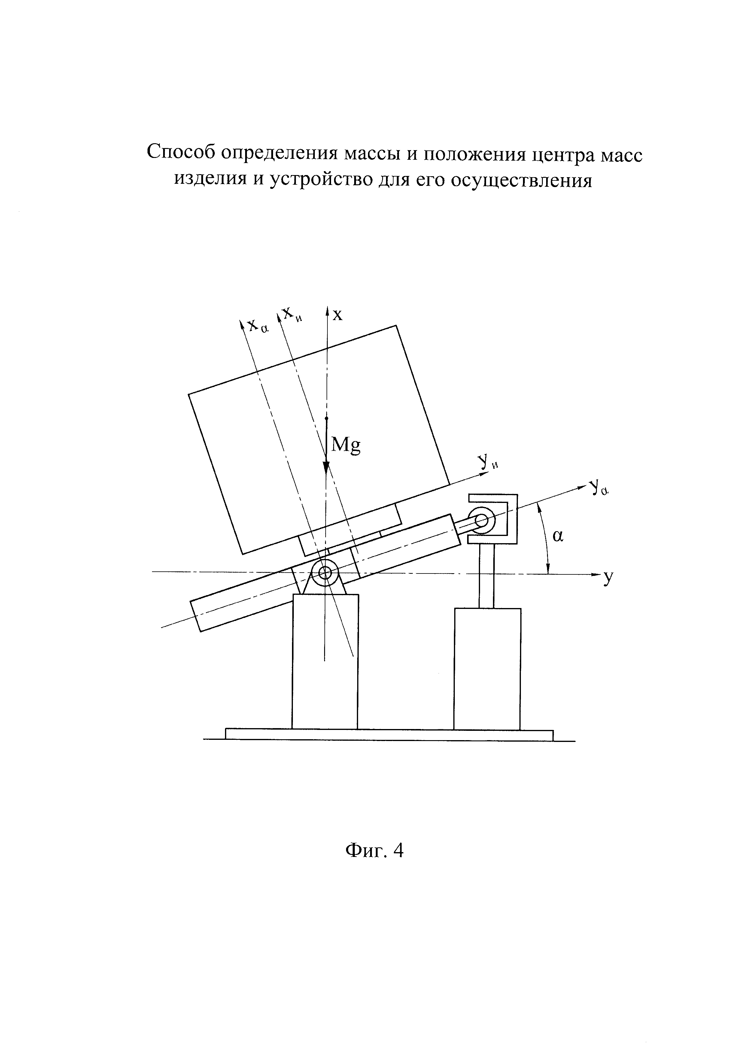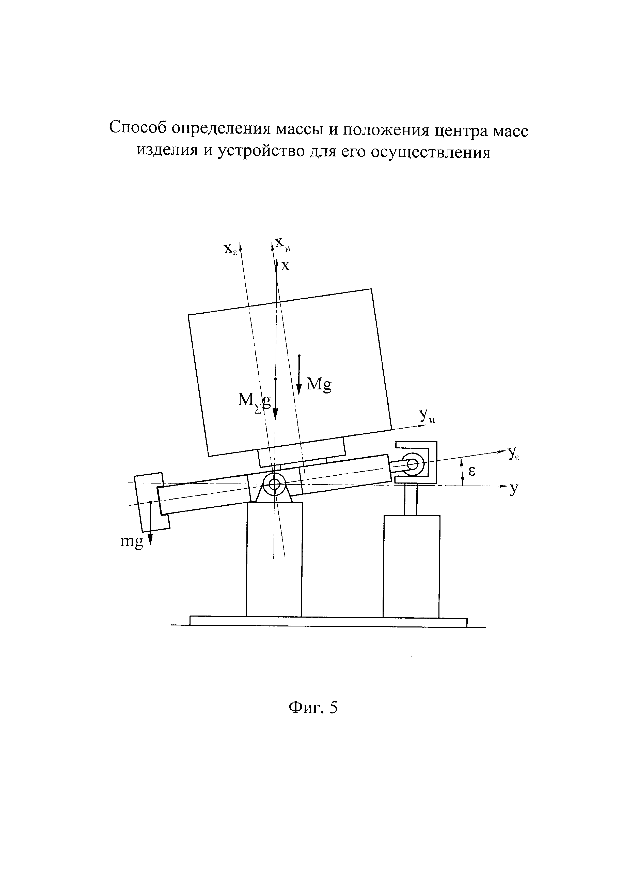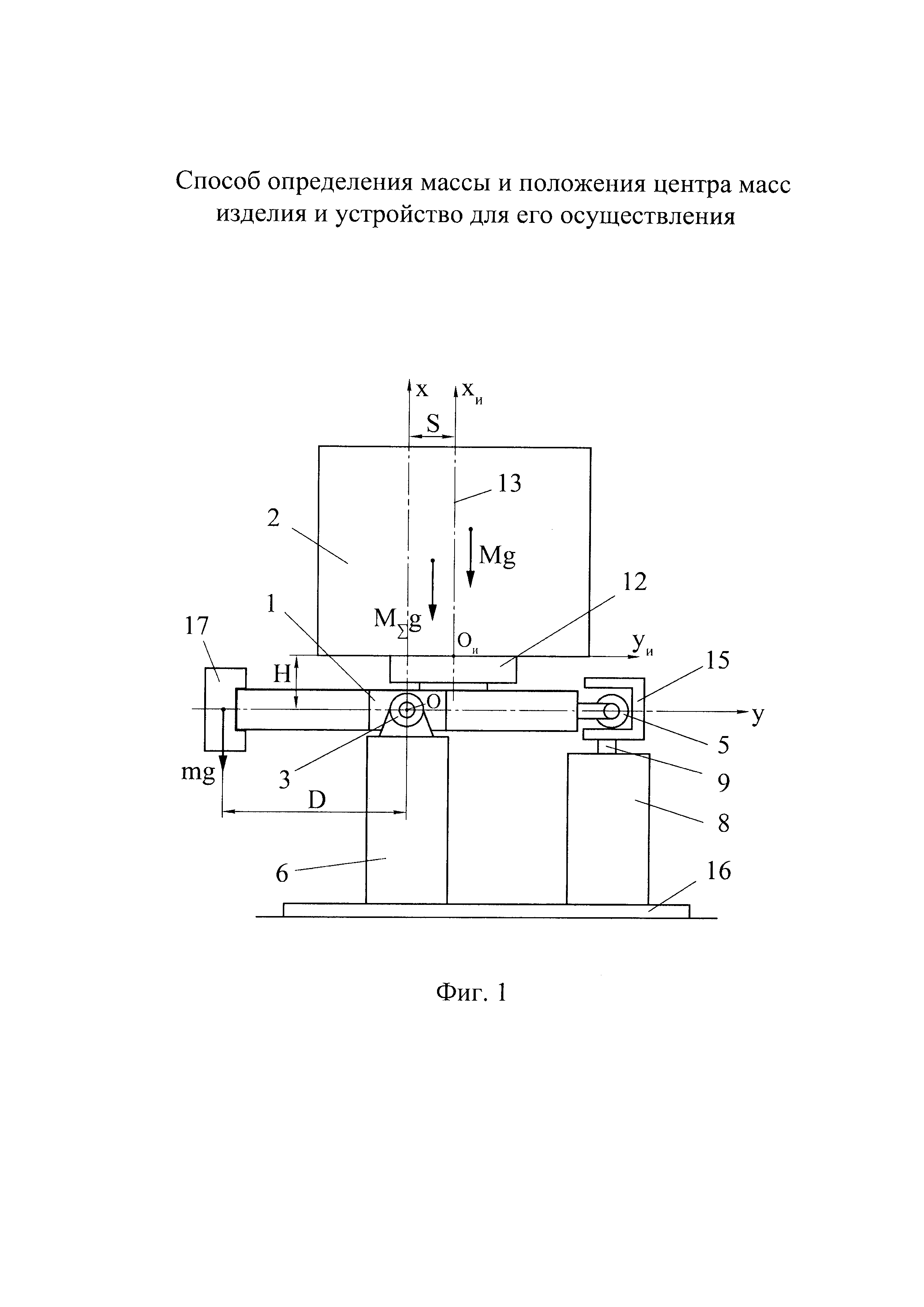 Группа изобретений относится к машиностроению и может быть использована для определения массы и/или положения центра масс преимущественно крупногабаритных изделий. Известен способ определения массы и положения центра масс изделия, заключающийся в том, что изделие устанавливают на переходник, шарнирно установленный на трех опорах, и уравновешивают изделие с переходником путем приведения в состояние неустойчивого равновесия относительно оси наклона, проходящей через шарниры первых двух опор, установку изделия на переходник производят с заведомым смещением от оси наклона, а уравновешивание изделия с переходником производят путем наклона переходника с изделием с помощью привода третьей опоры при различных положениях изделия относительно оси наклона, при достижении состояния неустойчивого равновесия измеряют угол наклона переходника (см. патент РФ 2485466, кл. G01M 1/12, 2011) - наиболее близкий аналог для способа. В результате анализа известного способа необходимо отметить, что его недостатком является сравнительно малый диапазон измерений. Это связано с тем, что силоизмерительные датчики в составе первых двух опор, с помощью которых производят измерение массы изделия, воспринимают нагрузку не только от изделия, но и от переходника. Обеспечение достаточной жесткости переходника, необходимой для удержания в наклоне крупногабаритных изделий при измерениях, приводит к увеличению массы переходника. Соответственно уменьшается диапазон измеряемых масс изделий, так как, с одной стороны, имеется ограничение по максимальной грузоподъемности датчиков, а с другой стороны - уменьшение массы измеряемых изделий приводит к увеличению относительной погрешности измерений массы. Известно устройство для определения массы и положения центра масс изделия, содержащее переходник для установки изделия, шарнирно соединенный с тремя опорами, одна из которых имеет подвижную часть, выполненную с возможностью вертикального перемещения посредством привода, датчик наклона переходника относительно оси, проходящей через шарниры первых двух опор, поворотную платформу на переходнике, ось поворота которой является скрещивающейся с осью наклона и отстоящей от нее на заданном расстоянии (см. патент РФ 2485466, кл. G01M 1/12, 2011) - наиболее близкий аналог для устройства. В результате анализа выполнения известного устройства необходимо отметить, что его недостатком является недостаточная точность измерения массы изделий, обусловленная необходимостью использования для измерения массы встроенных в опоры устройства силоизмерительных датчиков. Ограничения точностных возможностей, присущие любым видам силоизмерительных датчиков, связанные с особенностями их устройства и функционирования, накладывают соответствующие ограничения на точность измерений массы изделия в известном аналоге. Техническим результатом заявленной группы технических решений является расширение диапазона измерений массы изделия и положения его центра масс и повышение точности измерений. Указанный технический результат обеспечивается за счет того, что в способе определения массы и положения центра масс изделия, заключающемся в том, что изделие устанавливают на переходник, шарнирно установленный на трех опорах, и уравновешивают изделие с переходником путем приведения в сос