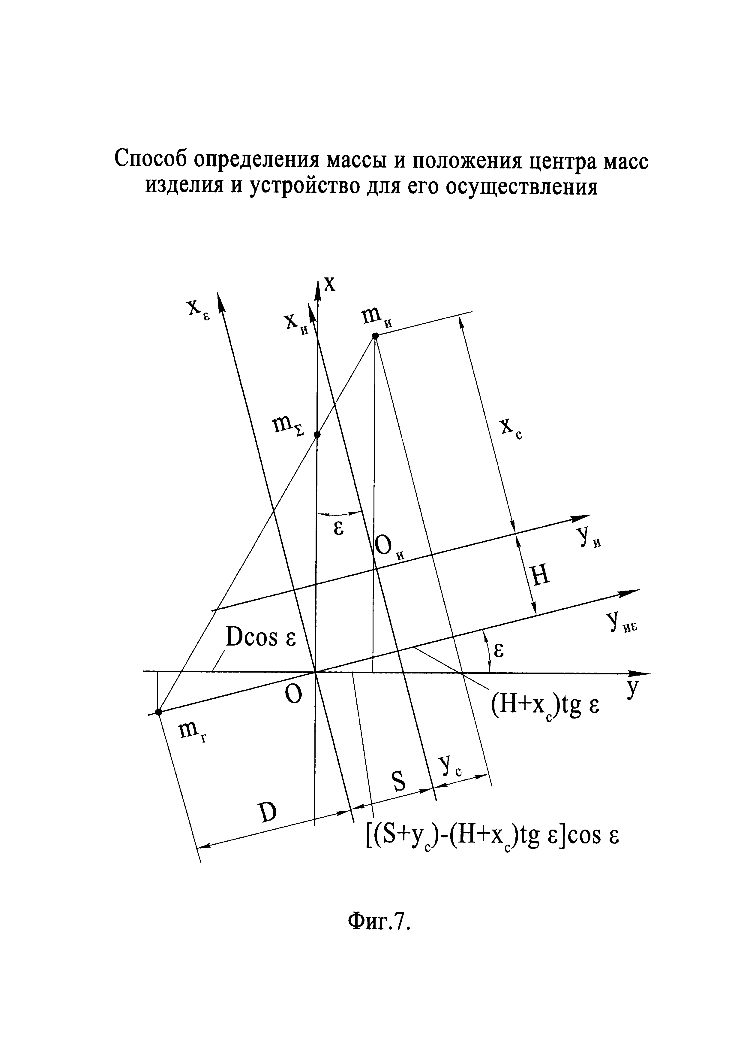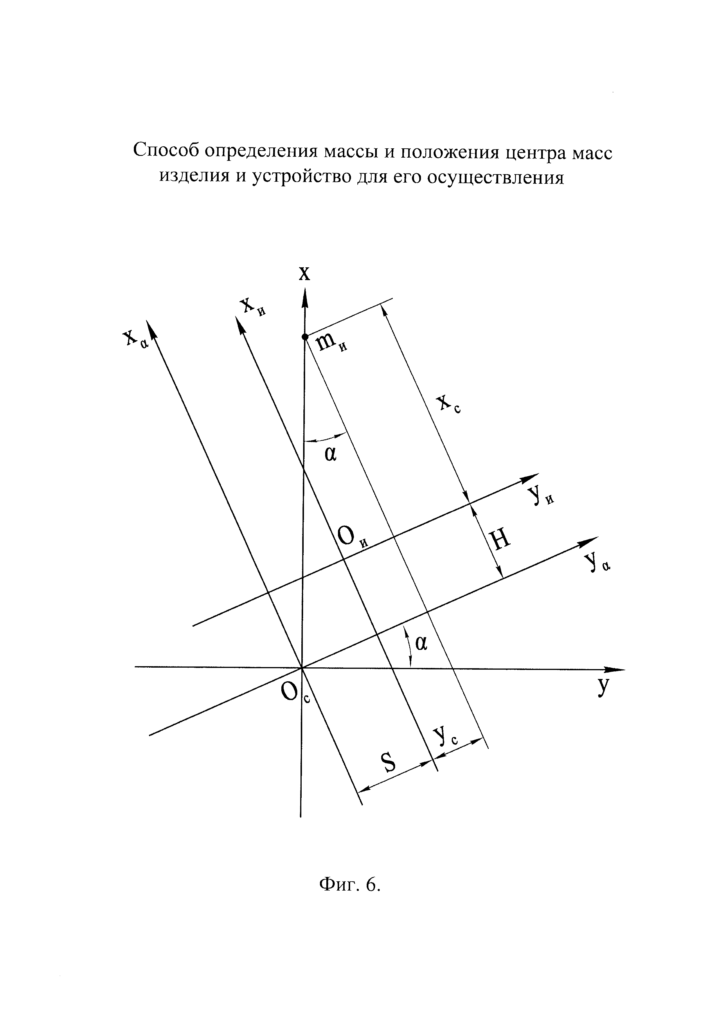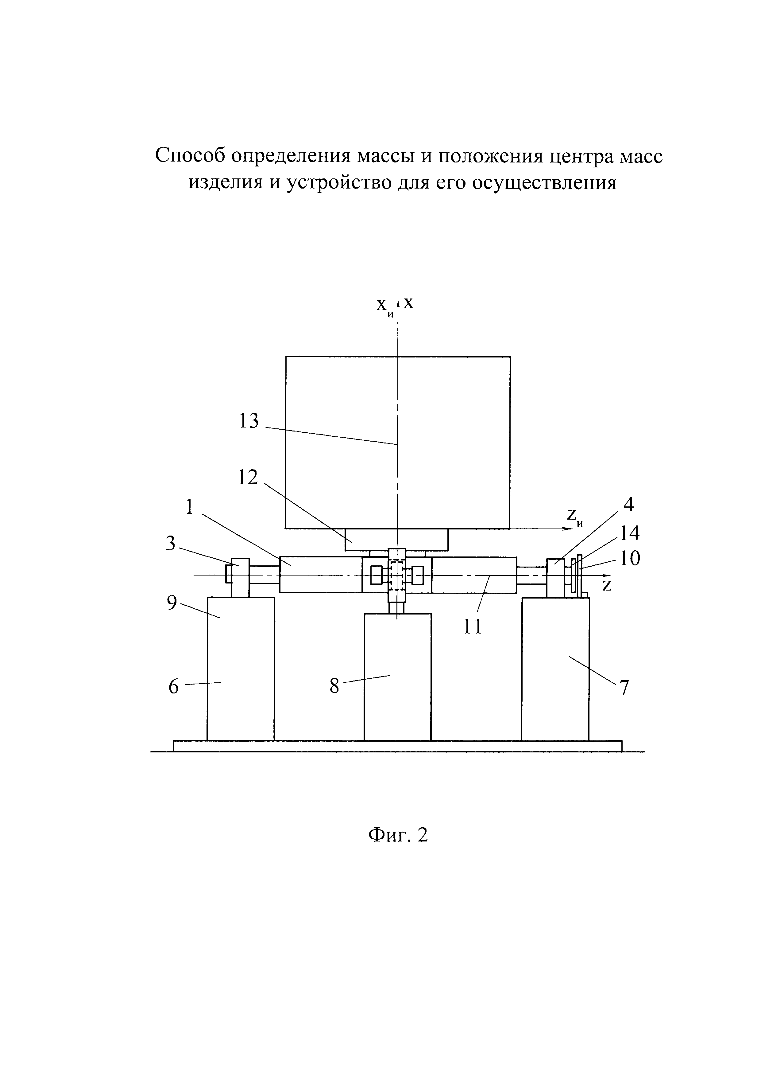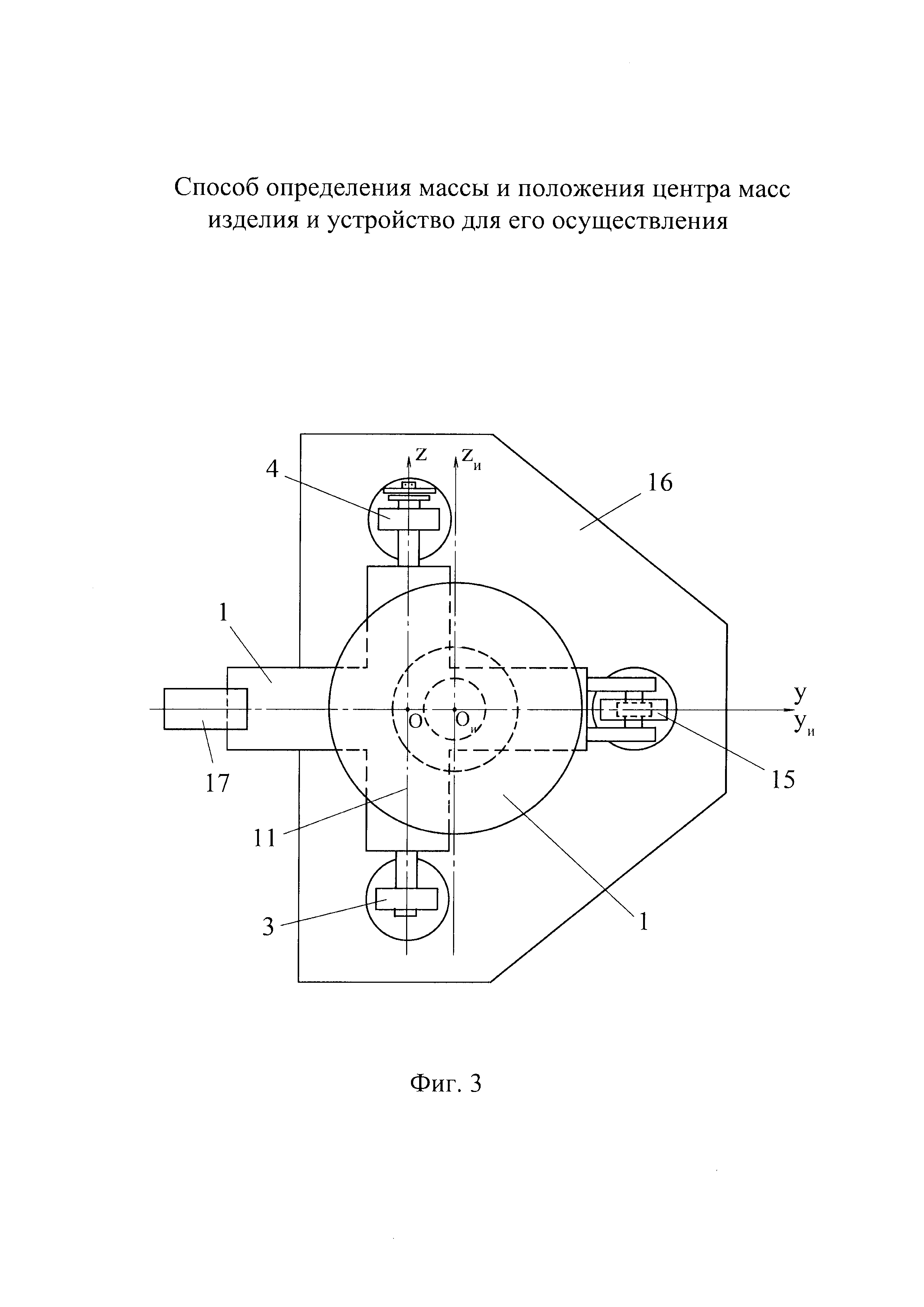 Группа изобретений относится к машиностроению и может быть использована для определения массы и/или положения центра масс преимущественно крупногабаритных изделий. Известен способ определения массы и положения центра масс изделия, заключающийся в том, что изделие устанавливают на переходник, шарнирно установленный на трех опорах, и уравновешивают изделие с переходником путем приведения в состояние неустойчивого равновесия относительно оси наклона, проходящей через шарниры первых двух опор, установку изделия на переходник производят с заведомым смещением от оси наклона, а уравновешивание изделия с переходником производят путем наклона переходника с изделием с помощью привода третьей опоры при различных положениях изделия относительно оси наклона, при достижении состояния неустойчивого равновесия измеряют угол наклона переходника (см. патент РФ 2485466, кл. G01M 1/12, 2011) - наиболее близкий аналог для способа. В результате анализа известного способа необходимо отметить, что его недостатком является сравнительно малый диапазон измерений. Это связано с тем, что силоизмерительные датчики в составе первых двух опор, с помощью которых производят измерение массы изделия, воспринимают нагрузку не только от изделия, но и от переходника. Обеспечение достаточной жесткости переходника, необходимой для удержания в наклоне крупногабаритных изделий при измерениях, приводит к увеличению массы переходника. Соответственно уменьшается диапазон измеряемых масс изделий, так как, с одной стороны, имеется ограничение по максимальной грузоподъемности датчиков, а с другой стороны - уменьшение массы измеряемых изделий приводит к увеличению относительной погрешности измерений массы. Известно устройство для определения массы и положения центра масс изделия, содержащее переходник для установки изделия, шарнирно соединенный с тремя опорами, одна из которых имеет подвижную часть, выполненную с возможностью вертикального перемещения посредством привода, датчик наклона переходника относительно оси, проходящей через шарниры первых двух опор, поворотную платформу на переходнике, ось поворота которой является скрещивающейся с осью наклона и отстоящей от нее на заданном расстоянии (см. патент РФ 2485466, кл. G01M 1/12, 2011) - наиболее близкий аналог для устройства. В результате анализа выполнения известного устройства необходимо отметить, что его недостатком является недостаточная точность измерения массы изделий, обусловленная необходимостью использования для измерения массы встроенных в опоры устройства силоизмерительных датчиков. Ограничения точностных возможностей, присущие любым видам силоизмерительных датчиков, связанные с особенностями их устройства и функционирования, накладывают соответствующие ограничения на точность измерений массы изделия в известном аналоге. Техническим результатом заявленной группы технических решений является расширение диапазона измерений массы изделия и положения его центра масс и повышение точности измерений. Указанный технический результат обеспечивается за счет того, что в способе определения массы и положения центра масс изделия, заключающемся в том, что изделие устанавливают на переходник, шарнирно установленный на трех опорах, и уравновешивают изделие с переходником путем приведения в сос