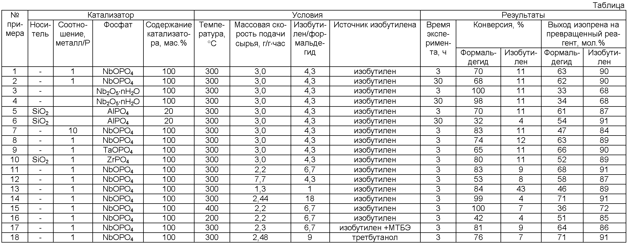 1. Одностадийный способ газофазного получения изопрена, включающий взаимодействие формальдегида с изобутиленом, или изобутилен содержащим сырьем, или производными изобутилена в присутствии катализатора, отличающийся тем, что взаимодействие проводят в присутствии твердофазного катализатора, содержащего фосфаты, выбранные из ряда фосфатов циркония, ниобия или тантала. 2. Способ по п.1, отличающийся тем, что используют фосфаты, нанесенные на носитель. 3. Способ по п.1, отличающийся тем, что фосфаты используют в композиции с оксидами этих же элементов, при этом отношение металла к фосфору в используемом катализаторе составляет от 10:1 до 1:1. 4. Способ по п.1, отличающийся тем, что процесс осуществляют в условиях газофазной конденсации при 200-400°С, при атмосферном давлении, при скорости подачи сырья 0.5-15 г/г·ч и массовом отношении изобутилена к формальдегиду, равном (1-20):1. 5. Способ по п.1, отличающийся тем, что процесс проводят в условиях непрерывного потока в реакторе с неподвижным слоем катализатора. 6. Способ по п.1, отличающийся тем, что в качестве производных изобутилена используют третбутиловый спирт, метилтретбутиловый эфир, этилтретбутиловый эфир или их смеси с изобутиленом.