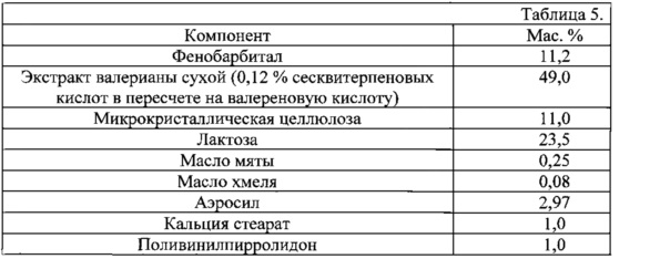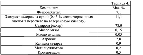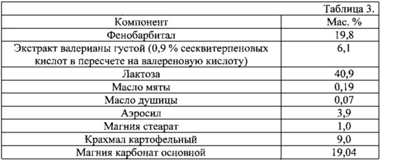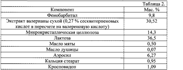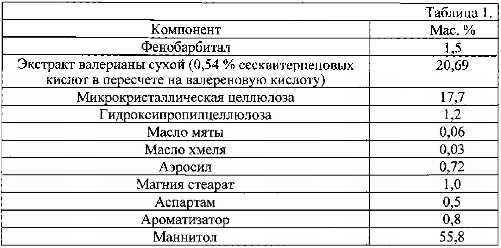 Настоящее изобретение относится к области медицины, а именно к фармацевтическим композициям, содержащим органические активные компоненты и ингредиенты из растений, в частности к средству седативного и спазмолитического действия и способу его получения. Предлагаемое средство обладает мягким снотворным эффектом и может быть использовано в качестве успокаивающего и сосудорасширяющего средства при функциональных расстройствах сердечно-сосудистой системы, неврозоподобных состояниях, сопровождающихся повышенной раздражительностью, нарушенном засыпании, тахикардии, состоянии возбуждения с выраженными вегетативными проявлениями, в качестве спазмолитического средства - при спазмах кишечника. Широко известны лекарственные средства седативного и спазмолитического действия в виде капель для приема внутрь: «Валокордин», содержащий на 1 мл препарата: 18,4 мг фенобарбитала, 18,4 мг этилбромизовалерианата, вспомогательные вещества - 1,29 мг масла мяты, 0,18 мг хмелевого масла, этанол 96% - 469,75 мг; вода очищенная - 411,97 мг, «Корвалол», содержащий: 1,96 г фенобарбитала, 2,15 г этилбромизовалерианата (этиловый эфир α-бромизовалериановой кислоты), мяты перечной масла - 0,15 г, натрия гидроксида (натра едкого) - 0,34 г; спирта этилового ректификованного 96% (этанола) - 50,30 г; воды очищенной - до 100,00 г, «Валосердин», содержащий на 100 г: активные вещества: 2,0 г фенобарбитала, 2,0 г этилбромизовалерианата (этиловый эфир α-бромизовалериановой кислоты), вспомогательные вещества: мяты перечной масло - 0,14 г, испанское хмелевое масло (душицы масло) - 0,02 г; этанол (этиловый спирт) 95% - 52,8 г; вода очищенная - 43,04 г. Эти жидкие лекарственные средства содержат в своем составе действующие вещества, обладающие седативным и спазмолитическим действием. Однако использование капель не обеспечивает точную дозировку препарата, вызывает неудобство при использовании в дороге. Кроме того, наличие этилового спирта может привести к высушиванию слизистых оболочек рта и глотки и ограничивает его применение водителями. Известны лекарственные средства седативного и спазмолитического действия в виде таблеток: таблетки с экстрактом валерианы густым (например, таблетки, покрытые оболочкой «Валерианы экстракт» ОАО «Биосинтез», содержащие на 1 таблетку 20 мг экстракта валерианы густого), таблетки с фенобарбиталом (например, таблетки «Фенобарбитал» ОАО «Татхимфармапрепараты», содержащие на 1 таблетку 100 мг фенобарбитала). Эти монопрепараты не дают того эффекта, который дают комбинированные препараты. Кроме того, таблетки фенобарбитала относятся к препаратам рецептурного отпуска, что вызывает определенную сложность в его приобретении. Известно лекарственное средство седативного и спазмолитического действия и способ его изготовления (RU 2349334). Указанное лекарственное средство содержит в мас. %: этиловый эфир α-бромизовалериановой кислоты 1,37-8,2, фенобарбитал 1,25-7,5, масло мяты перечной 0,16-0,58, микрокристаллическую целлюлозу 2-15, вспомогательные вещества для создания твердой лекарственной формы - остальное. Способ изготовления лекарственного средства заключается в смешении этилового эфира α-бромизовалериановой кислоты с маслом мяты перечной, добавлении смеси к увлажненному β-циклодекстрину, смешивании с порошками фенобарбитала, микрокристаллической целлюлозы, вспомогательными вещества