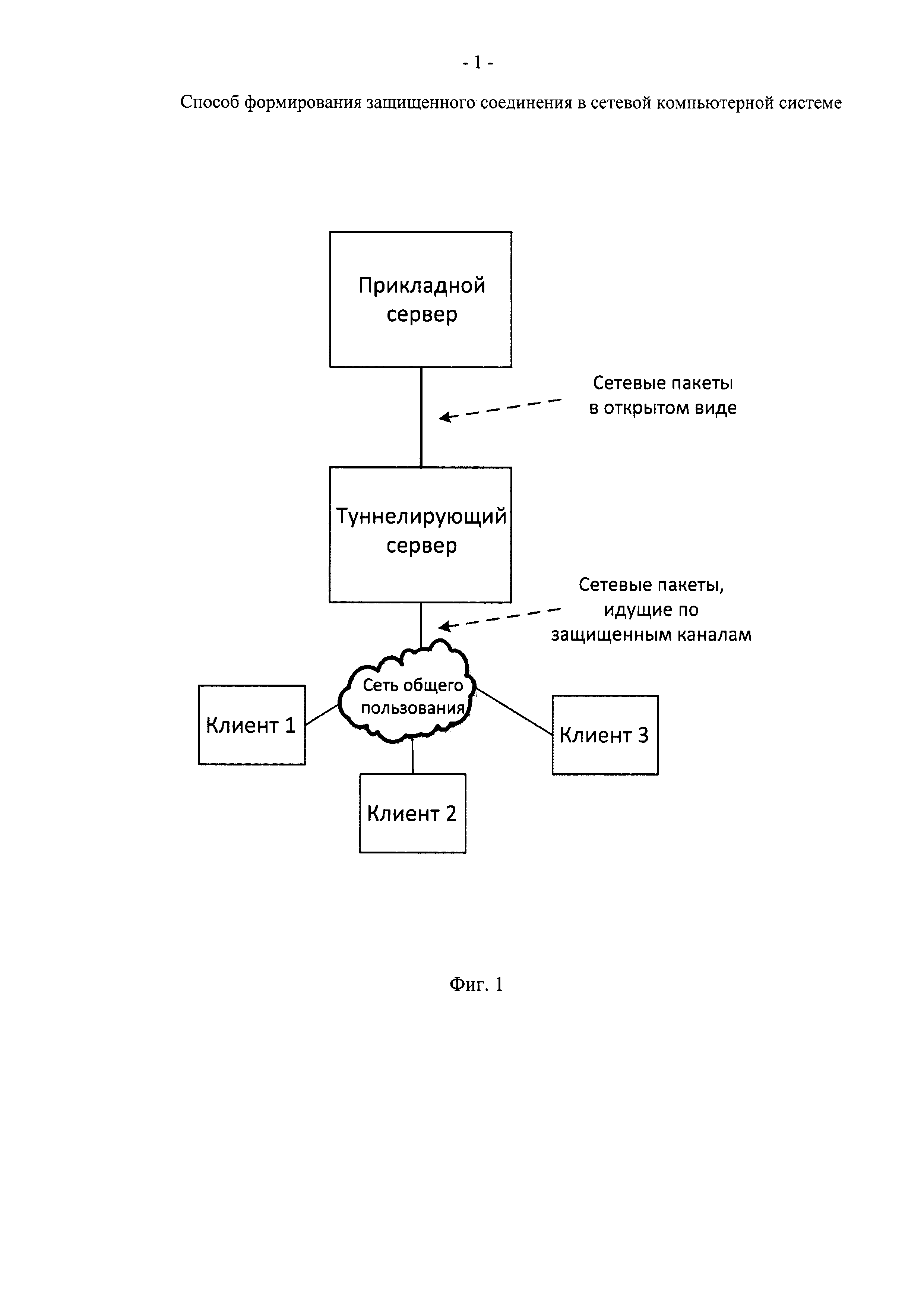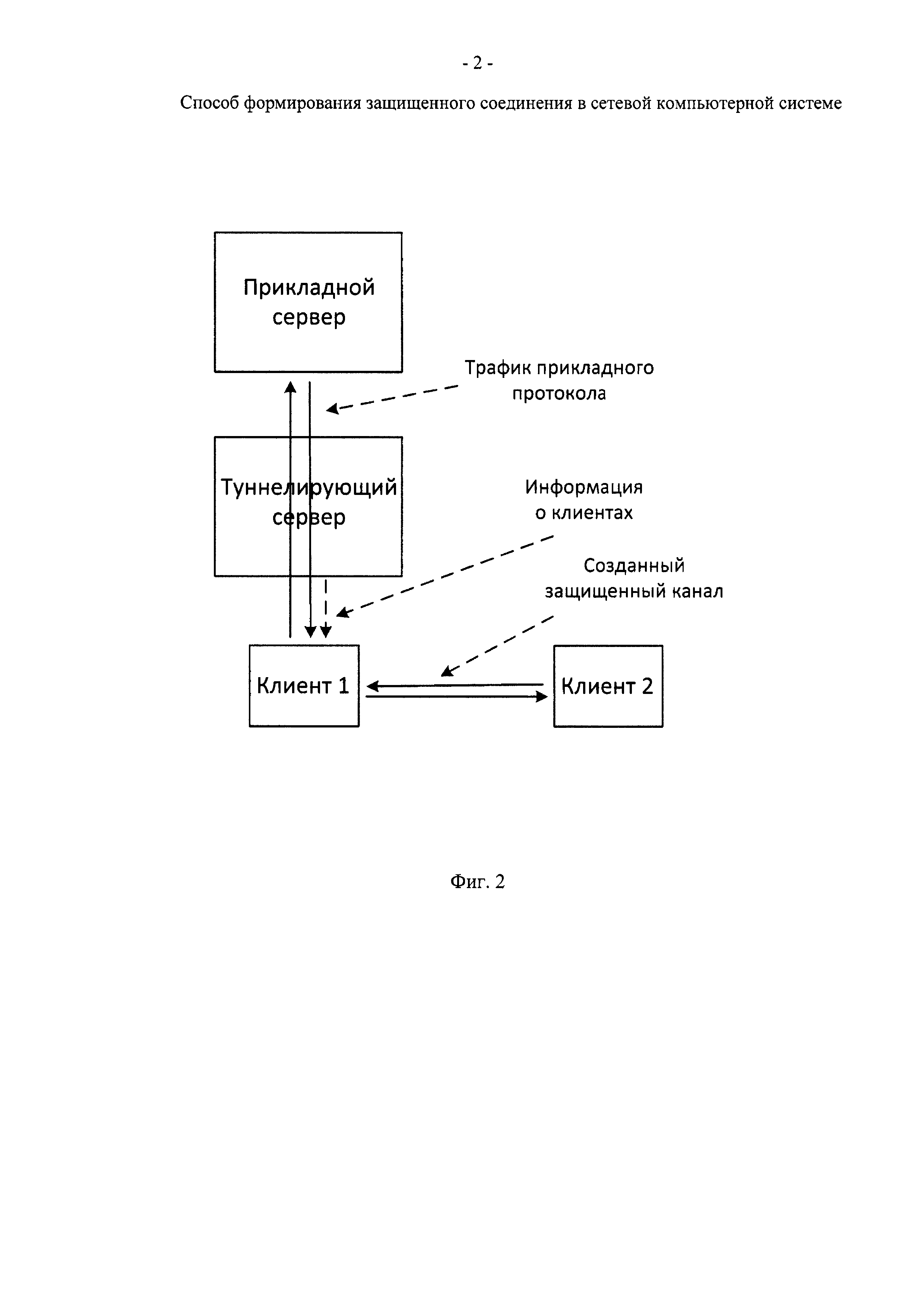 Изобретение относится к способам обеспечения безопасности в сетях передачи данных. Технический результат заключается в повышении защищенности соединения между компьютерами-клиентами. Указанный результат достигается за счет применения способа формирования защищенного соединения в сетевой компьютерной системе. Система включает прикладной сервер, осуществляющий прием и обработку запросов по прикладному протоколу от компьютеров-клиентов по сети через туннелирующий сервер. Компьютеры-клиенты выполнены с возможностью осуществлять взаимодействие между собой и с прикладным сервером по прикладному протоколу. Посылают запрос из первого компьютера-клиента в прикладной сервер для осуществления взаимодействия со вторым компьютером-клиентом; анализируют в туннелирующем сервере ответ из прикладного сервера первому компьютеру-клиенту; если в ответе присутствует сетевой адрес второго компьютера-клиента, то передают из туннелирующего сервера первому компьютеру-клиенту вместе с сообщением прикладного протокола информацию, необходимую для установки защищенного соединения со вторым компьютером-клиентом; формируют защищенное соединение между первым компьютером-клиентом и вторым компьютером-клиентом. 2 ил.