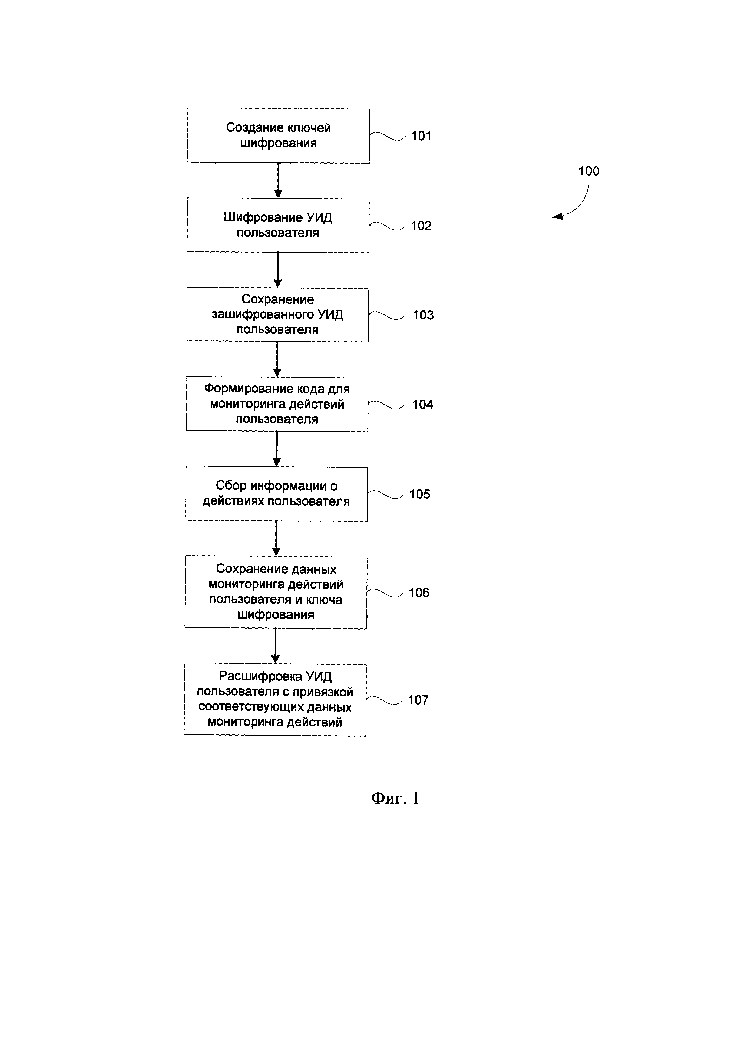 формируют по меньшей мере один код на странице веб-ресурса или программного приложения с встроенным зашифрованным уникальным идентификатором пользователя;