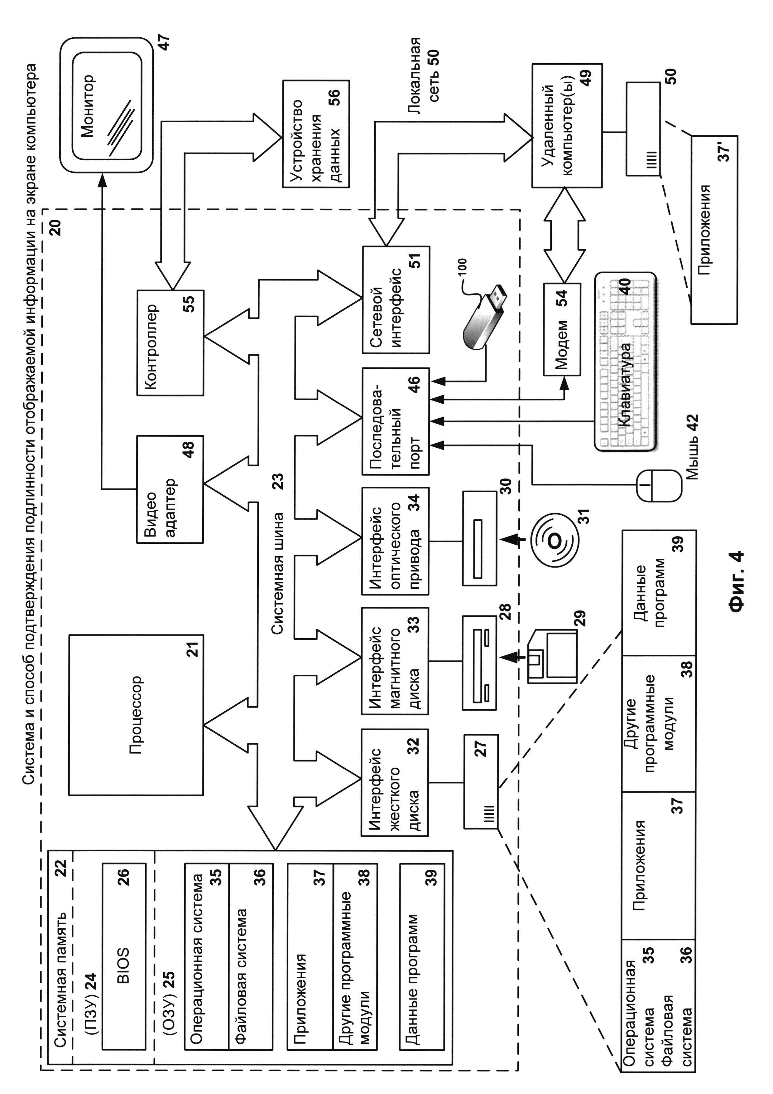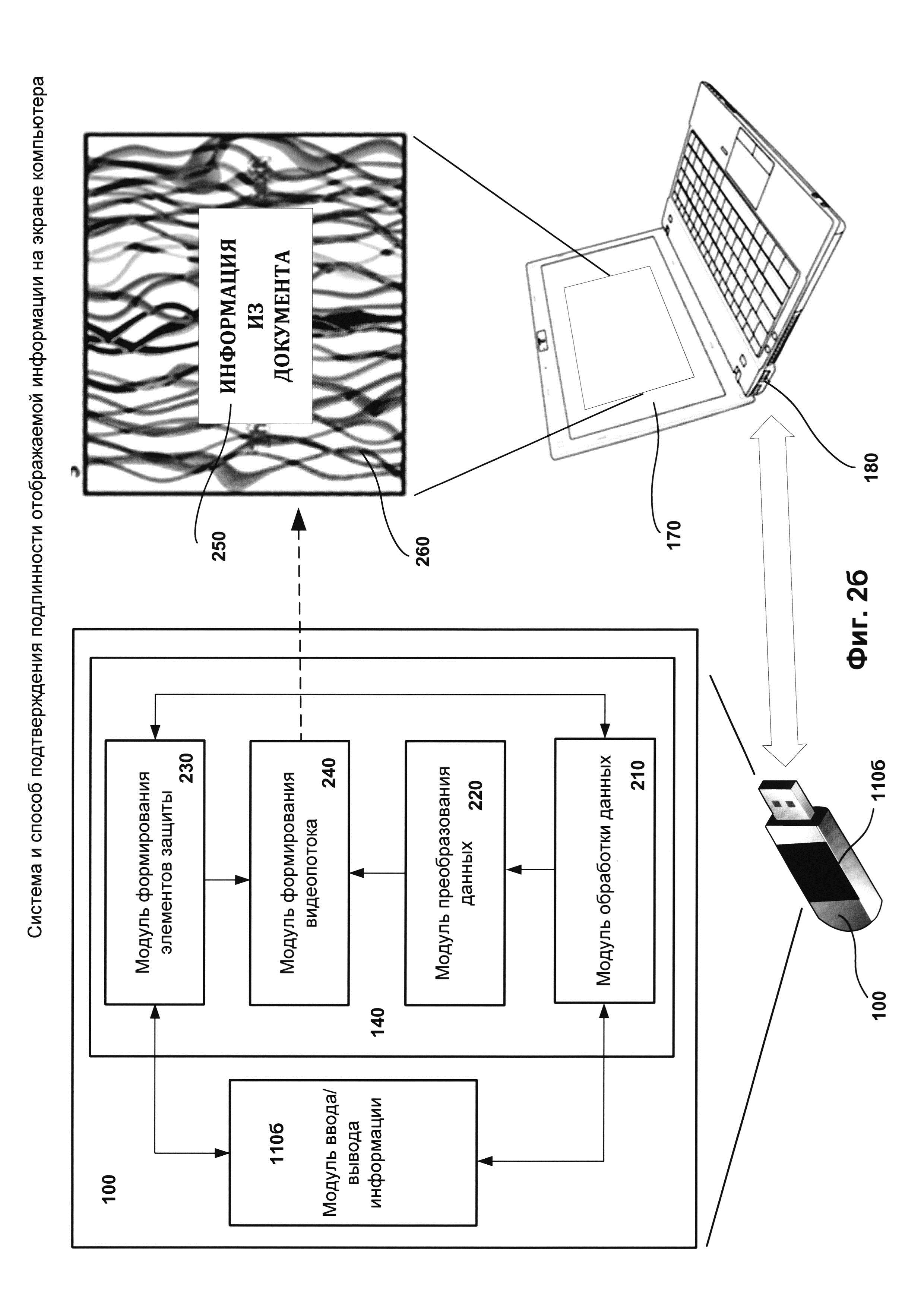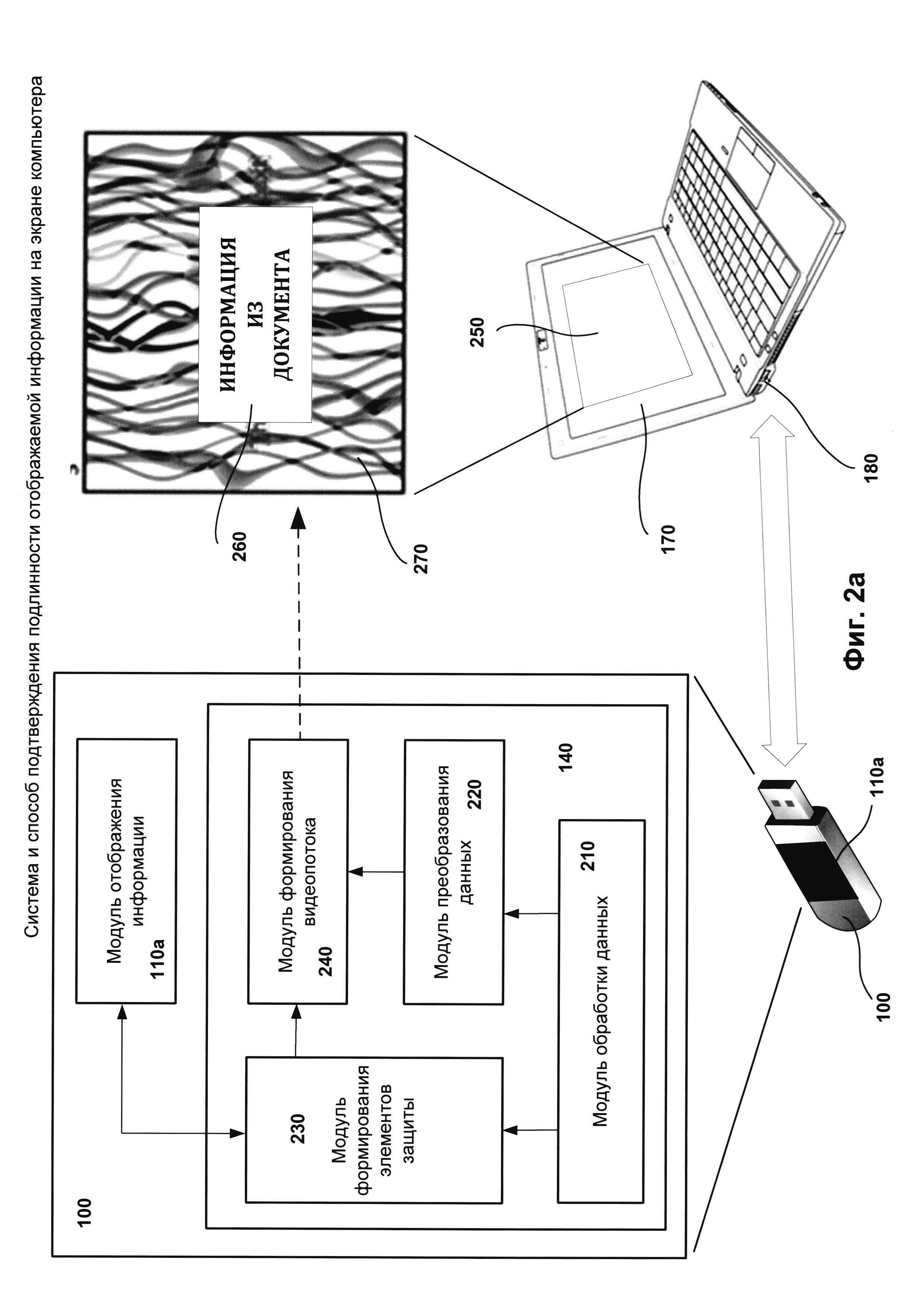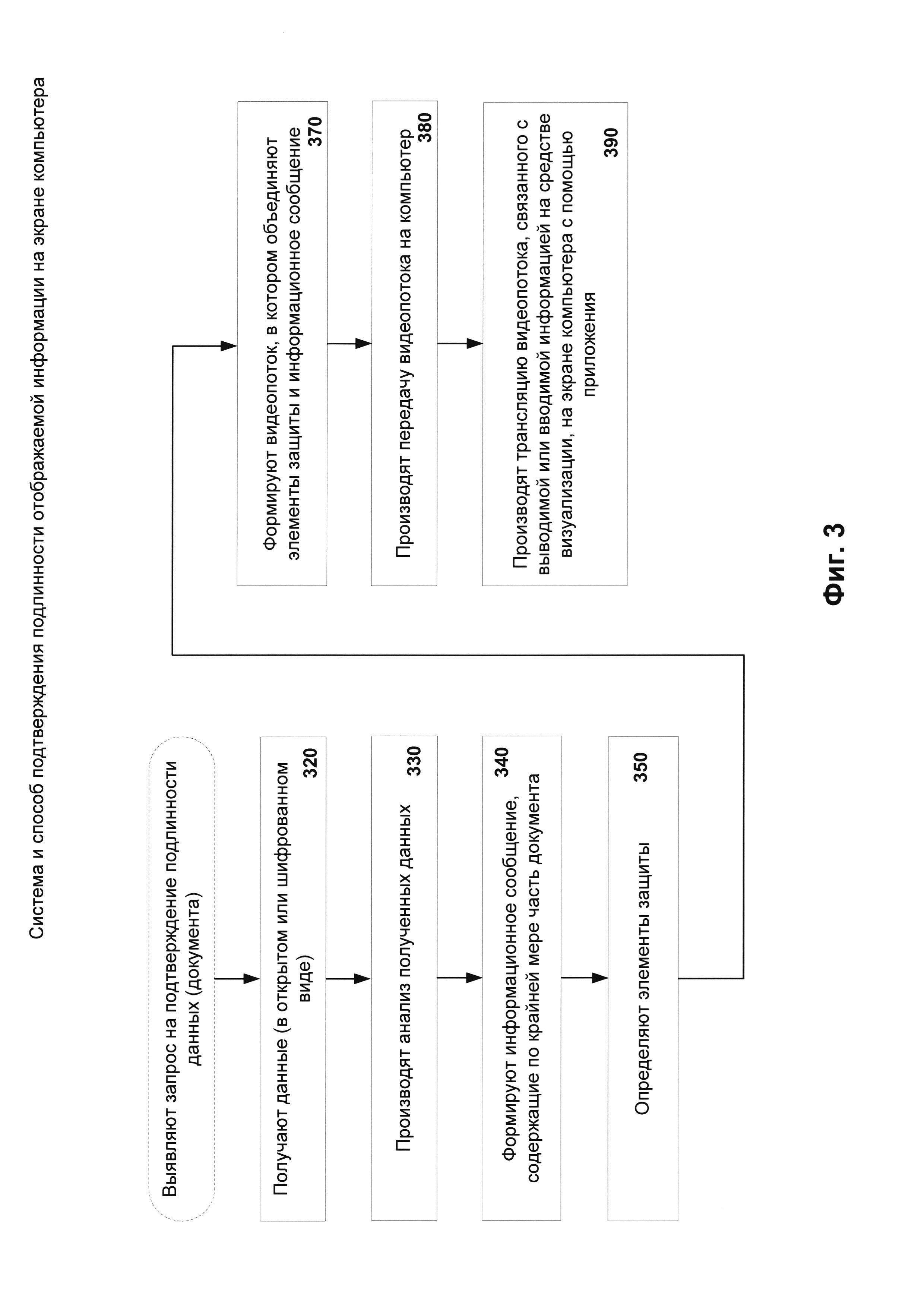 1. Система синхронизации информации, отображаемой на экране компьютера и на модуле отображения информации внешнего по отношению к компьютеру портативного вычислительного устройства, с помощью приложения в реальном времени для подтверждения подлинности информации, отображаемой на экране компьютера, при этом упомянутая система включает: а) модуль обработки данных, предназначенный для: содержат сообщение, которое предназначено для пользователя; б) модуль преобразования данных, предназначенный для формирования информационного сообщения, содержащего полученную информацию от модуля обработки данных, и передачи сформированного информационного сообщения модулю формирования видеопотока; в) модуль формирования элементов защиты, предназначенный для: г) модуль формирования видеопотока, предназначенный для формирования видеопотока, в котором совмещает полученные элементы защиты и информационное сообщение, и передачи сформированного видеопотока приложению для трансляции на компьютере пользователя; д) модуль отображения информации, предназначенный для синхронного вывода элементов защиты с выводимой информаций в транслируемом на экране компьютера видеопотоке, содержащем отображаемую информацию и элементы защиты. 2. Система по п. 1, в которой модуль формирования элементов защиты при определении элементов защиты учитывает функциональные возможности модуля отображения информации. 3. Система по п. 1, в которой под сообщением понимается по крайней мере файл и данные банковской транзакции. 4. Система по п. 1, в которой под отображаемой информацией по крайней мере понимается информация из электронного документа и данные банковской транзакции. 5. Система по п. 1, в которой выводимые элементы защиты в модуле отображения информации и на экране компьютера похожи друг другу. 6. Система по п. 1, в которой модулем отображения информации являются по крайней мере сенсорный экран, сенсорная панель или по крайней мере один светодиод. 7. Система по п. 6, в которой сенсорный экран может быть как монохромным, так и цветным. 8. Система по п. 1, в которой модуль обработки данных перед упомянутым анализом производит расшифровку полученных данных. 9. Система по п. 1, в которой модуль обработки данных перед упомянутым анализом производит проверку целостности упомянутых данных. 10. Система по п. 1, в которой правила отображения элементов защиты регулируют отображения элементов защиты как в модуле отображения информации, так и в видеопотоке. 11. Система по п. 1, в которой в качестве элементов защиты содержится по крайней мере один из следующих: 12. Способ синхронизации информации, отображаемой на экране компьютера и на модуле отображения информации внешнего по отношению к компьютеру портативного вычислительного устройства, для подтверждения подлинности отображаемого информации на экране компьютера, при этом способ содержит этапы, на которых: а) получают данные, где данные содержат сообщение, которое предназначается для пользователя; б) проводят анализ полученных данных, во время которого определяют содержащееся сообщение, параметры сообщения и информацию, идентифицирующую сообщение; в) формируют информационное сообщение, содержащее информацию, однозначно идентифицирующую упомянутое сообщение; г) определяют элементы защиты согласно параметрам сообщен