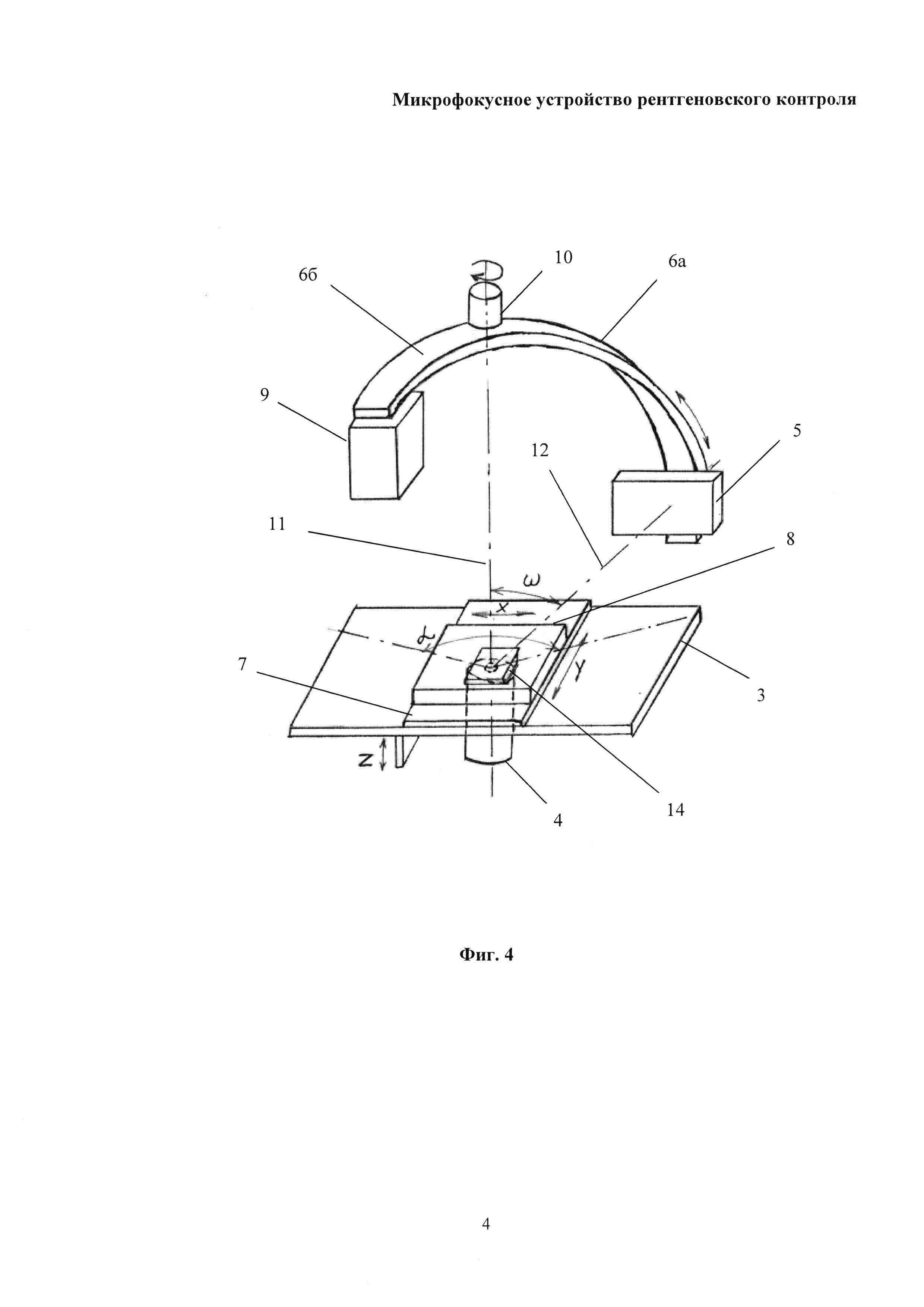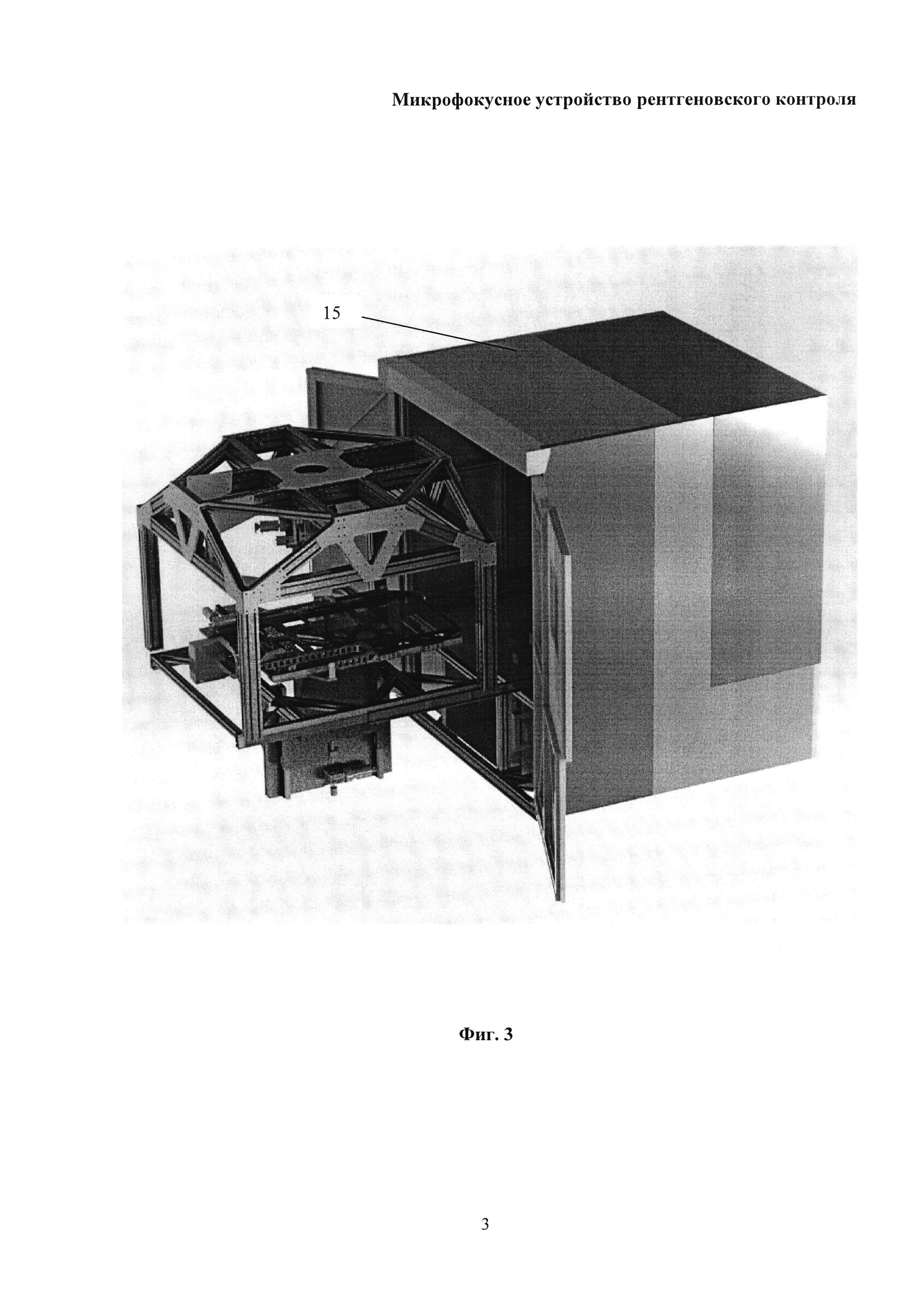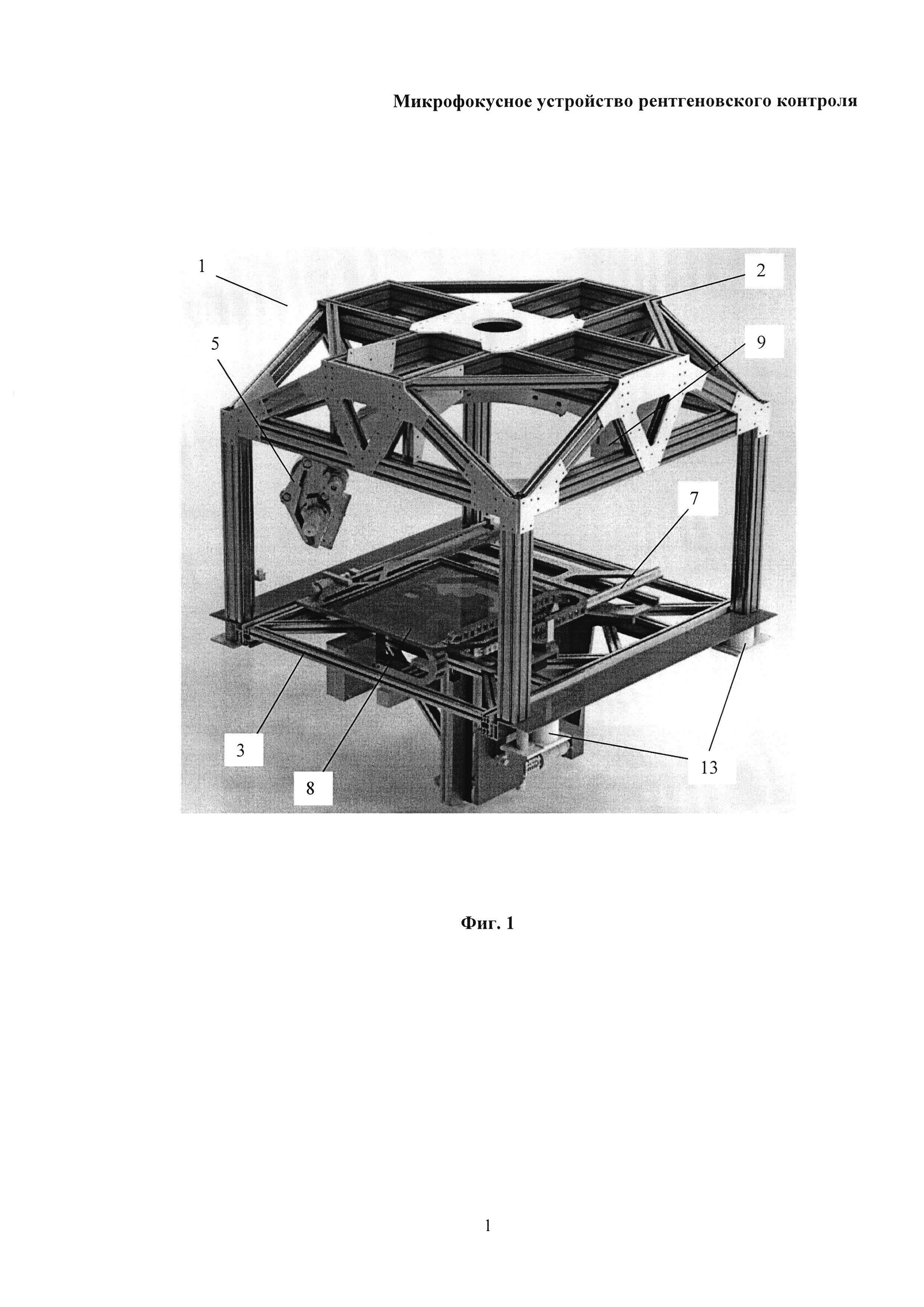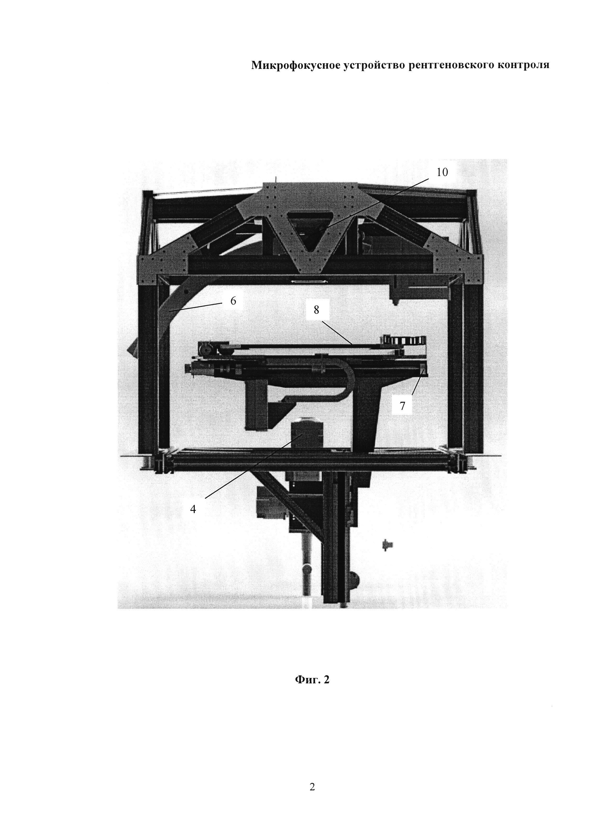 Изобретение относится к средствам неразрушающего контроля и анализа широкого спектра изделий, таких как печатные платы, узлы, электронные компоненты, микросборки и модули и т.д. Устройство включает конструкцию, установленную и закрепленную внутри каркаса, состоящего из жестко соединенных направляющих, и содержит опорную раму, под которой установлена неподвижно и центросимметрично относительно указанной рамы рентгеновская трубка, и блок детектирования, оптически связанный с указанной трубкой. Между указанными трубкой и блоком смонтирован на опорной раме координатный стол с расположенным на нем поддоном для размещения объекта контроля и выполненный с возможностью перемещения по координатным осям X, Y и Z. Ось рабочего пучка рентгеновского излучения трубки направлена по нормали к плоскости опорной рамы. Блок детектирования находится над опорной рамой и размещен на дугообразной балке с возможностью перемещения по ней на требуемый угол раствора рабочего пучка рентгеновского излучения трубки. Дугообразная балка соединена с верхней направляющей каркаса с помощью средства крепления, неподвижно установленного напротив рентгеновской трубки и обеспечивающего вращение балки вокруг оси рабочего пучка рентгеновского излучения. Балка имеет рабочий и нерабочий участки, где рабочий участок предназначен для перемещения блока детектирования, Технический результат заключается в расширении арсенала технических средств микрофокусных устройств рентгеновского контроля с высокой эксплуатационной надежностью, а также уменьшении массогабаритных показателей устройства без ухудшения его технических характеристик. 6 з.п. ф-лы, 4 ил.