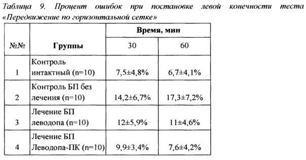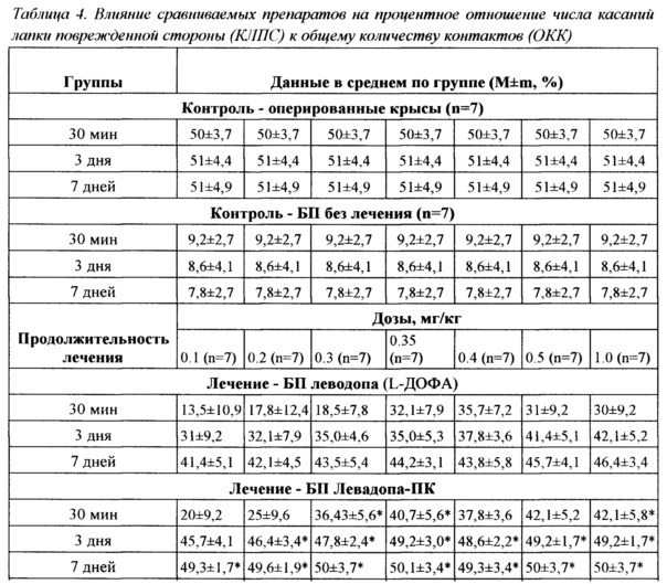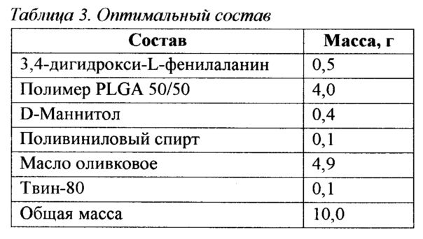 Настоящее изобретение к фармацевтической промышленности, а именно: к фармацевтической композиции для лечения болезни Паркинсона. Фармацевтическая композиция для лечения болезни Паркинсона в виде назальных капель содержит 3,4 дигидрокси-L-фенилаланин (L-ДОФА), биодеградируемый сополимер молочной/гликолевой кислоты полилактидгликолид 50/50 (PLGA 50/50), криопротектор D-маннитол, поливиниловый спирт (ПВС), масло оливковое, Твин 80, взятые в определенных количествах. Способ получения фармацевтической композиции включает получение раствора ПВС насыщенного L-ДОФА; получение суспензии L-ДОФА в растворе сополимера PLGA 50/50 в дихлорметане; получение эмульсии путем добавления к раствору ПВС, насыщенному L-ДОФА, суспензии L-ДОФА в растворе сополимера PLGA 50/50 в дихлорметане; проведение второго эмульгирования – гомогенизацию; полученную суспензионную композицию L-ДОФА с сополимером PLGA 50/50 смешивают с криопротектором D-маннитолом; добавляют к Твин 80 масло оливковое; далее к полученной смеси добавляют лиофилизированные полимерные частицы L-ДОФА в сополимере PLGA 50/50 и перемешивают до образования однородной массы при определенных условиях. Применение фармацевтической композиции для лечения болезни Паркинсона. Предложенная фармацевтическая композиция является биодоступной и эффективной для лечения болезни Паркинсона. 3 н.п. ф-лы, 9 табл., 12 пр.