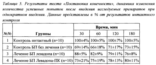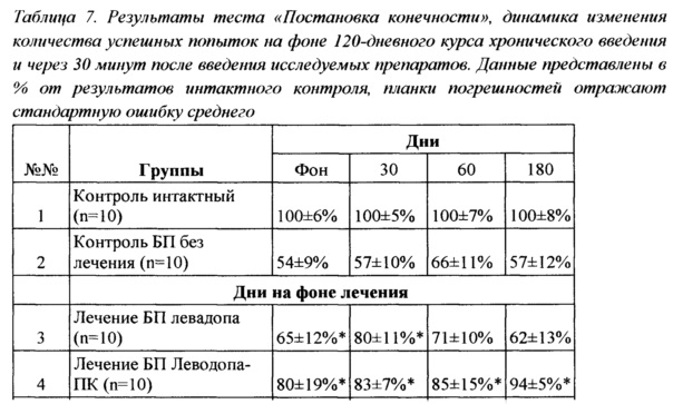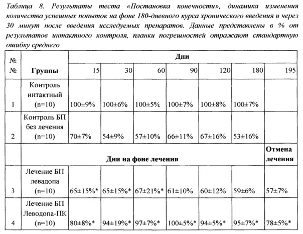 Изобретение относится к медицине, в частности к фармакологии и фармацевтике, и касается назальной формы новой фармацевтической композиции в виде капель, содержащей в качестве действующего вещества 3.4 - дигидрокси - L - фенилаланин (леводопа), распределенной в полимерной матрице на основе биодеградируемого сополимера молочной/гликолевой кислот (полилактидгликолид, PLGA 50/50) для применения при нейродегенеративных заболеваниях, в частности болезни Паркинсона (БП). БП - это хроническое неуклонно прогрессирующее нейродегенеративное заболевание с широким диапазоном моторных и немоторных нарушений. БП неминуемо инвалидизирует пациентов, значительно снижая качество жизни больных и их близких. Через 10-20 лет 40-75% пациентов умирают, а около 50% выживших требуют постоянного ухода (Hely. М.A. The Sydney multicenter of Parkinson's disease: The inevitability of dementia at 20 years / M.A. Hely, W.G J. Reid, M.A. Adena, G.A. Halliday, J.G.L. Morris // Mov. Disord. 2008. - V. 23. - №6. - P. 837-844). Общая распространенность заболевания в Европе среди людей старше 65 лет составляет 1,6-1,8 случаев на 100 человек. Из-за старения населения ожидается, что значение паркинсонизма как проблемы здравоохранения будет возрастать (Литвиненко И.В. Болезнь Паркинсона. М.: «Миклош», 2010. 216 с.; Handbook of Parkinson's disease / edited by Rajesh Pahwa, Kelly E. Lyons. - 4th ed. - 2007. - P. 501). Прогрессирование заболевания и ухудшение качества жизни пациентов, а также недостаточно эффективное лечение создают серьезную социальную проблему. До настоящего времени стандартным лекарственным средством при БП остается леводопа. Однако для леводопы характерен короткий период полувыведения из плазмы крови, что даже в лучших условиях современной терапии приводит лишь к пульсирующей стимуляции дофаминэргических нейронов. Следовательно, длительная терапия осложнена двигательными отклонениями и дискинезией, являющихся источником существенных ограничений для некоторых пациентов. Терапевтическая стратегия, которая позволит в конечном итоге доставлять леводопу/дофамин в головной мозг более непрерывным и физиологичным образом, обеспечит преимущества по отношению к стандартной форме, уменьшив двигательные осложнения, что является крайне необходимым для пациентов, страдающих сопутствующими неврологическими или двигательными расстройствами (Olanow CW; Mov. Dis. 2008, 23 (Suppl. 3): S613-S622). В настоящее время разработаны пероральные формы леводопы с замедленным высвобождением действующего вещества. Использование же липосомальных лекарственных форм обеспечивает пролонгированность действия препаратов и снижение их токсичности. В работе During M.J. и др. было показано, что липосомы с включенным ДОФА, имплантированные в частично денервируемый стриатум крыс, проявляли длительный эффект в течение 40 дней. Малые одноламеллярные везикулы были получены озвучиванием липосомальной дисперсии. Результаты этих исследований свидетельствовали о частичном восстановлении дефицита дофамина у животных с апоморфин-индуцированной моделью БП (During M.J., Freese A., Deutch A.Y., Kibat P.G., Sabel В.A., Langer R., Roth R.H. Biochemical and behavioral recovery in a rodent model of Parkinson's disease following stereotactic implantation of dopamine-contatining liposomes // Exper. Neurol. 1992. V115. P. 193-199). К существенным недостаткам липосомальных препаратов следует отнести высокую стоимость используемых фосфолипидов, а также их низкую стабильность при хранении. Попытки непрерывного введения леводопы интрадуоденально или с помощью инфузии были о
