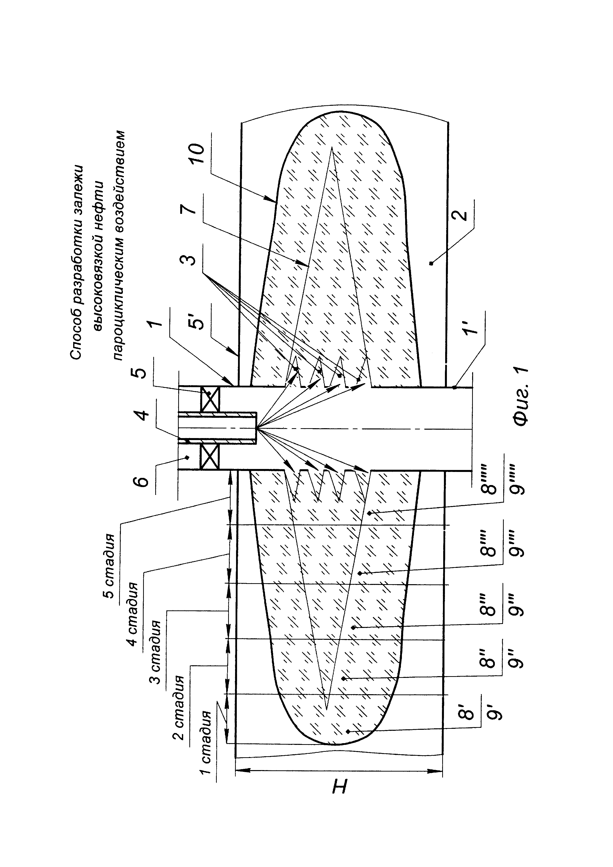 Изобретение относится к области разработки нефтяных месторождений. Технический результат - увеличение охвата залежи, повышение эффективности паротеплового воздействия на продуктивный пласт, увеличение отбора разогретой высоковязкой нефти после пароциклического воздействия, исключение перегрева верхней части продуктивного пласта, сокращение тепловых потерь по стволу скважины. Способ разработки залежи высоковязкой нефти пароциклическим воздействием включает бурение вертикальной скважины в залежи высоковязкой нефти, крепление вертикальной скважины обсадной колонной, перфорацию обсадной колонны в интервале продуктивного пласта, закачку через скважину в продуктивный пласт парогазового теплоносителя, спуск в скважину колонны труб с насосом и отбор разогретой продукции из скважины. Перфорацию в интервале продуктивного пласта, сложенного карбонатными породами, производят гидропескоструйным перфоратором с образованием перфорационных отверстий диаметром 20 мм. После осуществляют проппантный пенокислотный гидроразрыв пласта с образованием трещины разрыва закачкой гелированной жидкости разрыва с последующим ее развитием и креплением в пять стадий чередующимися порциями пенокислоты в равных объемах и пенокислоты с добавлением проппантной смеси массой по 2 т в каждой стадии, состоящей из проппанта крупной фракции 12/18 меш и цилиндрического проппанта фракции 12/16 меш в процентном соотношении 60/40, причем на каждой последующей стадии концентрацию проппантной смеси повышают ступенчато от 200 до 600 кг/мс шагом 100 кг/м, причем концентрация кислоты в пене составляет не менее 16%. Для снижения потерь тепла в начале пароциклического воздействия прогревают скважину циркуляцией пара до прекращения выхода конденсата из обратной линии, причем в скважину спускают колонну труб, оснащенную снизу вверх обратным клапаном, замковой опорой вставного штангового насоса, перепускным клапаном, пакером, размещают колонну труб в скважине так, чтобы пакер находился напротив кровли верхней части продуктивного пласта, затем в колонну труб на колонне штанг спускают вставной штанговый насос и фиксируют его в замковой опоре. После чего скважину в течение 14 сут закачивают пар в объеме 40 т/сут, после чего скважину закрывают и выдерживают в течение 14 сут на пропитку, затем отбирают разогретую высоковязкую нефть. После снижения дебита до рентабельно обоснованной величины для данной скважины циклы закачки пара и отбора разогретой высоковязкой нефти повторяют. 3 ил., 1 табл.