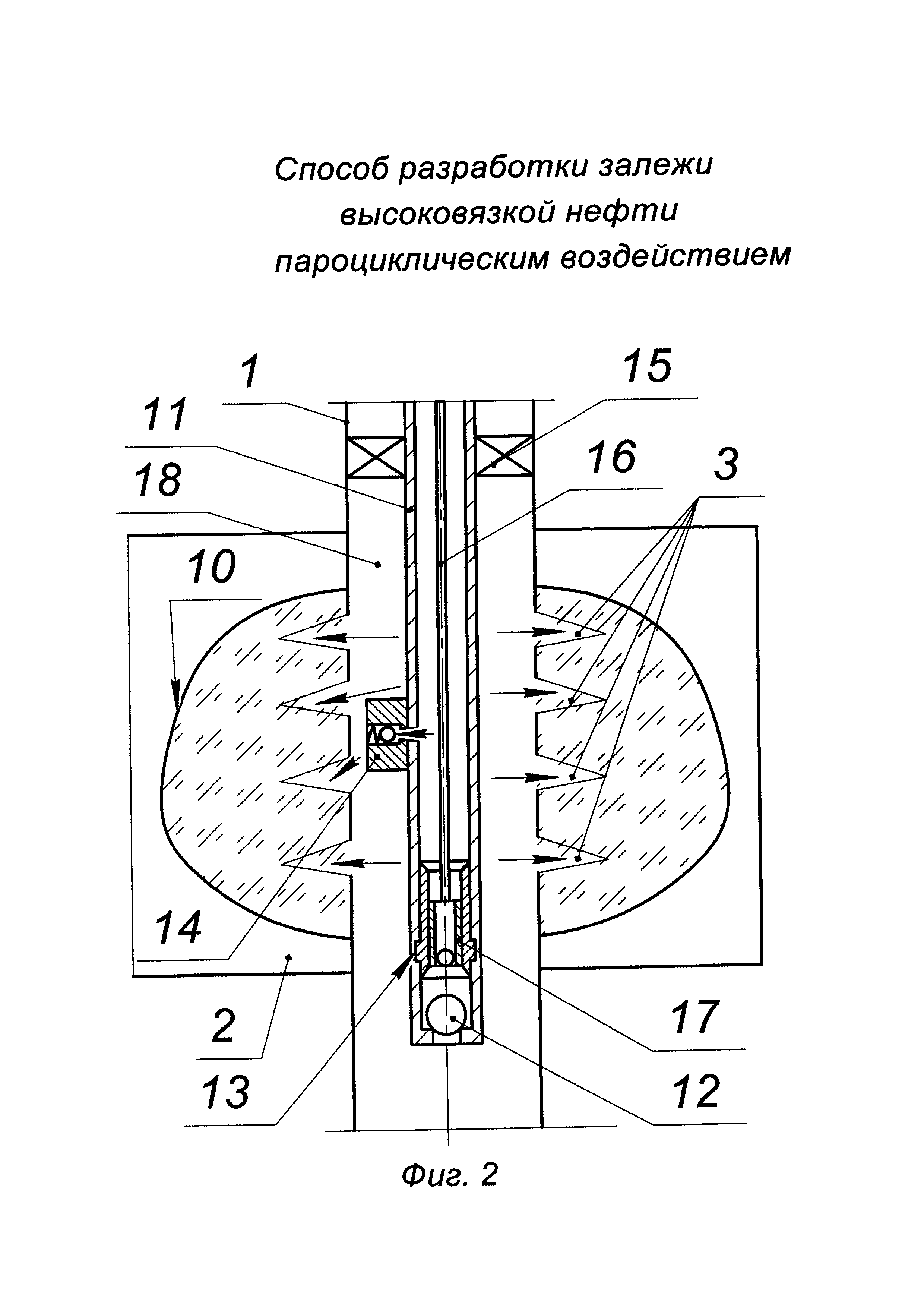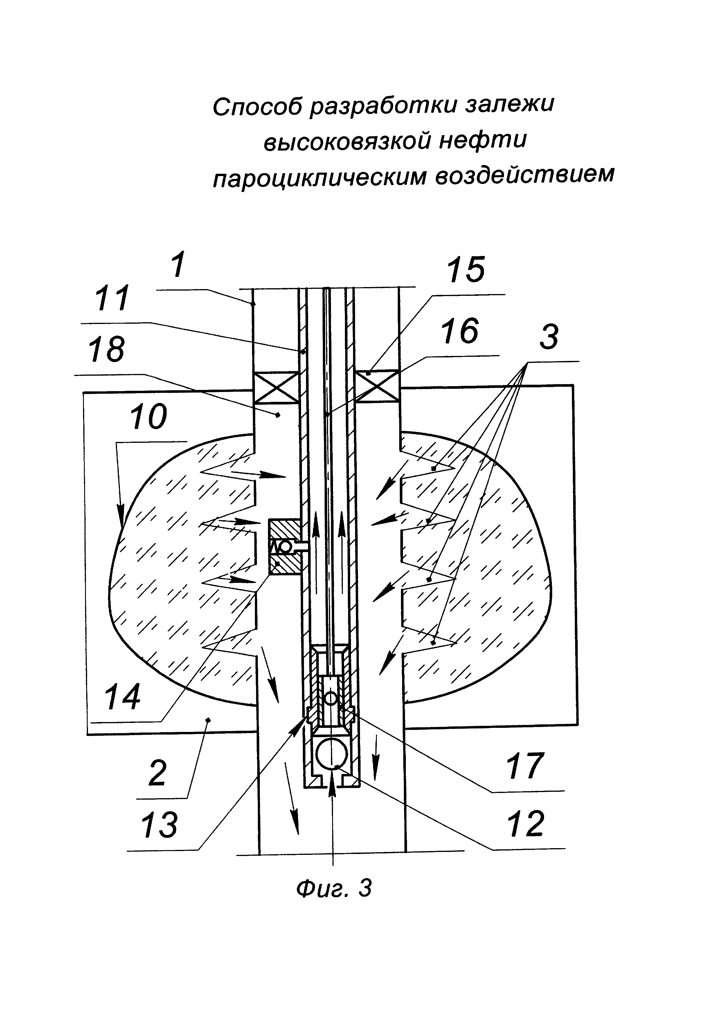 Изобретение относится к области разработки нефтяных месторождений и может быть использовано для добычи высоковязкой нефти при пароциклическом воздействии на продуктивный пласт, сложенный карбонатными породами. Известен способ разработки залежей высоковязких нефтей путем паротеплового воздействия (патент RU №2361074, МПК Е21В 43/24, опубл. 10.07.2009 г., бюл. №19), включающий закачку чередующимися оторочками раствора реагента, под действием температуры разлагающегося с выделением углекислого газа, и пара. В качестве указанного реагента используют карбамид, закачку указанного раствора осуществляют через пароциклическую добывающую скважину не менее чем двумя оторочками, после закачки последней оторочки пара осуществляют закачку оторочки нефти, выдерживают указанную скважину для пропитки, затем пускают в эксплуатацию, при этом указанный раствор дополнительно содержит аммиачную селитру, аммоний роданистый, комплексное поверхностно-активное вещество (ПАВ) Нефтенол ВВД, или смесь неионогенного ПАВ - АФ9-12, или NP-40, или NP-50 и анионактивного ПАВ - волгоната или сульфонола, или NPS-6. Недостатки способа: - во-первых, низкая эффективность паротеплового воздействия на пласт, поскольку при реализации способа не определено допустимое давление нагнетания пара в скважину в зависимости от карбонатных или терригенных пород. Допустимое давление закачки пара в зависимости от типа породы имеет наиважнейшее значение при разработке залежи высоковязкой нефти путем пароциклического воздействия, поэтому при реализации данного способа высока вероятность прорыва покрышки (кровли) пласта под действием давления нагнетания пара, и, как следствие, ухода пара в другой горизонт, с другой стороны, при недостаточном давлении пара пласт не будет полностью охвачен паротепловым воздействием, что также снижает объем паровой камеры; - во-вторых, низкое качество паротеплового воздействия на пласт с высоковязкой нефтью раствором реагента, в качестве которого применяют карбамид, оказывающий корродирующее действие в скважине, кроме того, его растворение в воде (конденсате пара) является эндотермической реакцией, которая сопровождается снижением температуры в пласте. Кроме того, химические реагенты закачиваются в пласт раздельно без смешивания на устье, что может привести к неконтролируемой химической реакции в пласте высоковязкой нефти; - в-третьих, снижение коллекторских свойств пласта, так как вместе с закачкой пара поочередно закачивается большое количество химических реагентов: карбамида, аммиачной селитры, аммония роданистого, комплексного ПАВ и т.д.; - в-четвертых, высокие тепловые потери, так как теплоноситель (пар с химическими реагентами) закачивается в пласт с высоковязкой нефтью по межтрубному пространству и разогретый пласт быстро остывает ввиду отсутствия герметизации при реализации способа. В результате температура в пласте быстро уменьшается до исходной, а вязкость нефти возрастает. Наиболее близким по технической сущности и достигаемому результату является способ циклического воздействия парогазовым теплоносителем на призабойную зону пласта с вязкой нефтью (патент RU №2164289, МПК Е21В 43/24, опубл. 20.03.2001 г., бюл. №8), включающий бурение вертикальной скважины в залежи высоковязкой нефти с вскрытием продуктивного пласта, крепление вертикальных