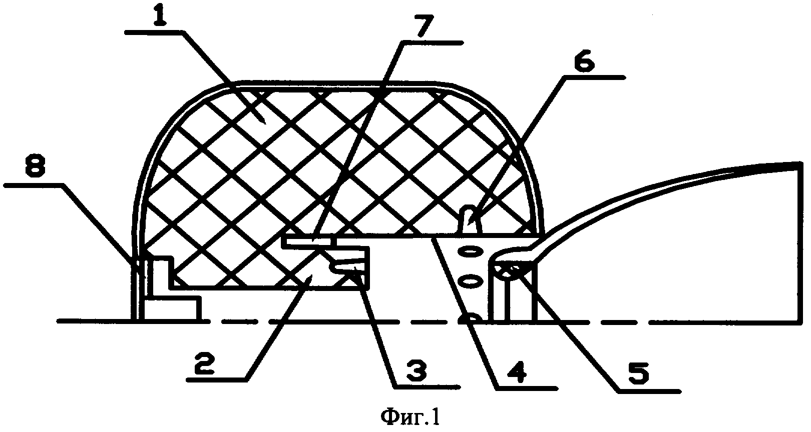 общий вид ЗСК в составе РДТТ с разгорающимся соплом 5. Заряд из твердого топлива 1 скреплен с корпусом типа «кокон», облицованным изнутри теплозащитным покрытием 8. Топливный элемент (ТЭ) 2