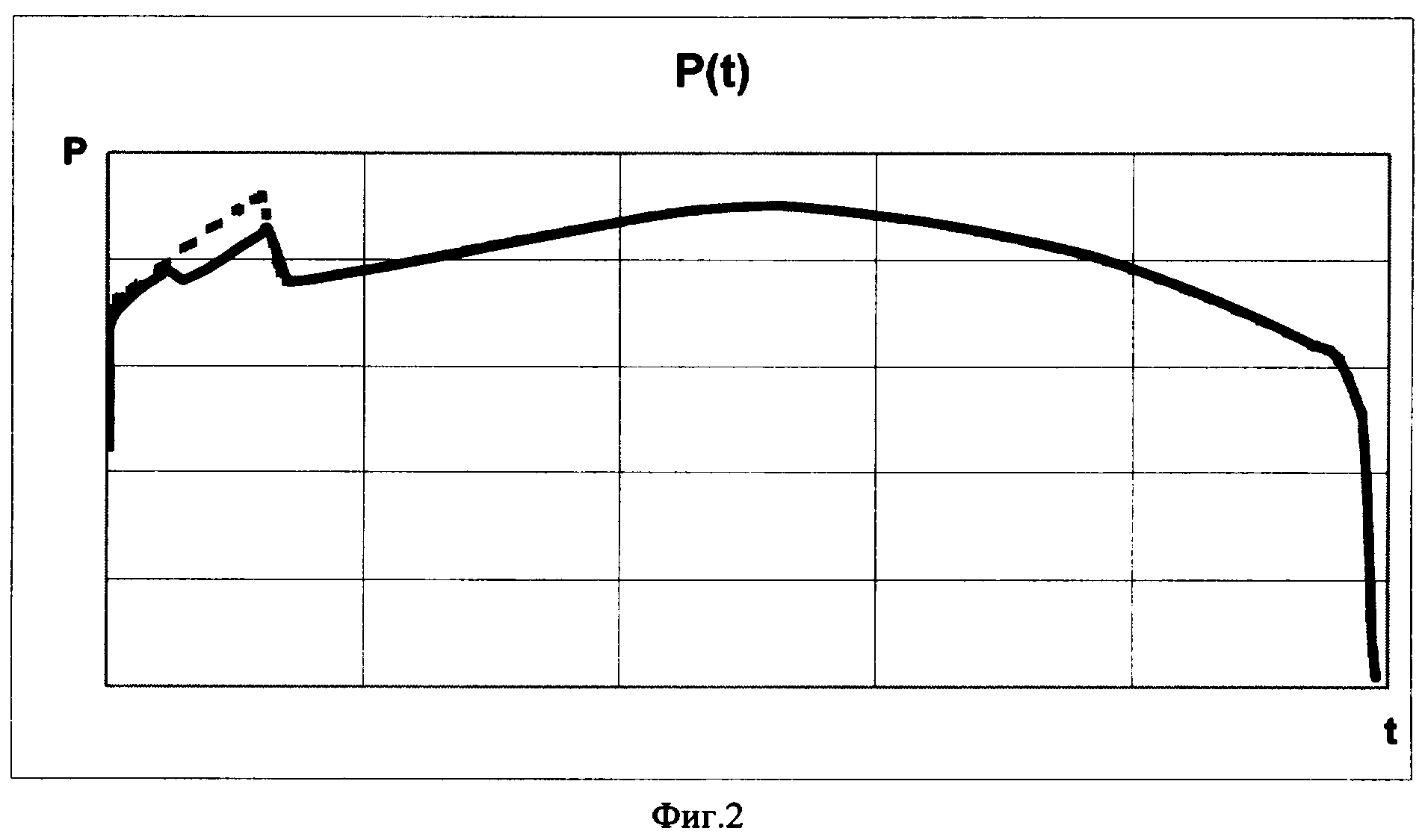 работы. ЗСК работает следующим образом. После срабатывания воспламенителя заряд загорается и его поверхность горения начинает увеличиваться. На Фиг.2 показаны графики изменений тяги P(t) при работе