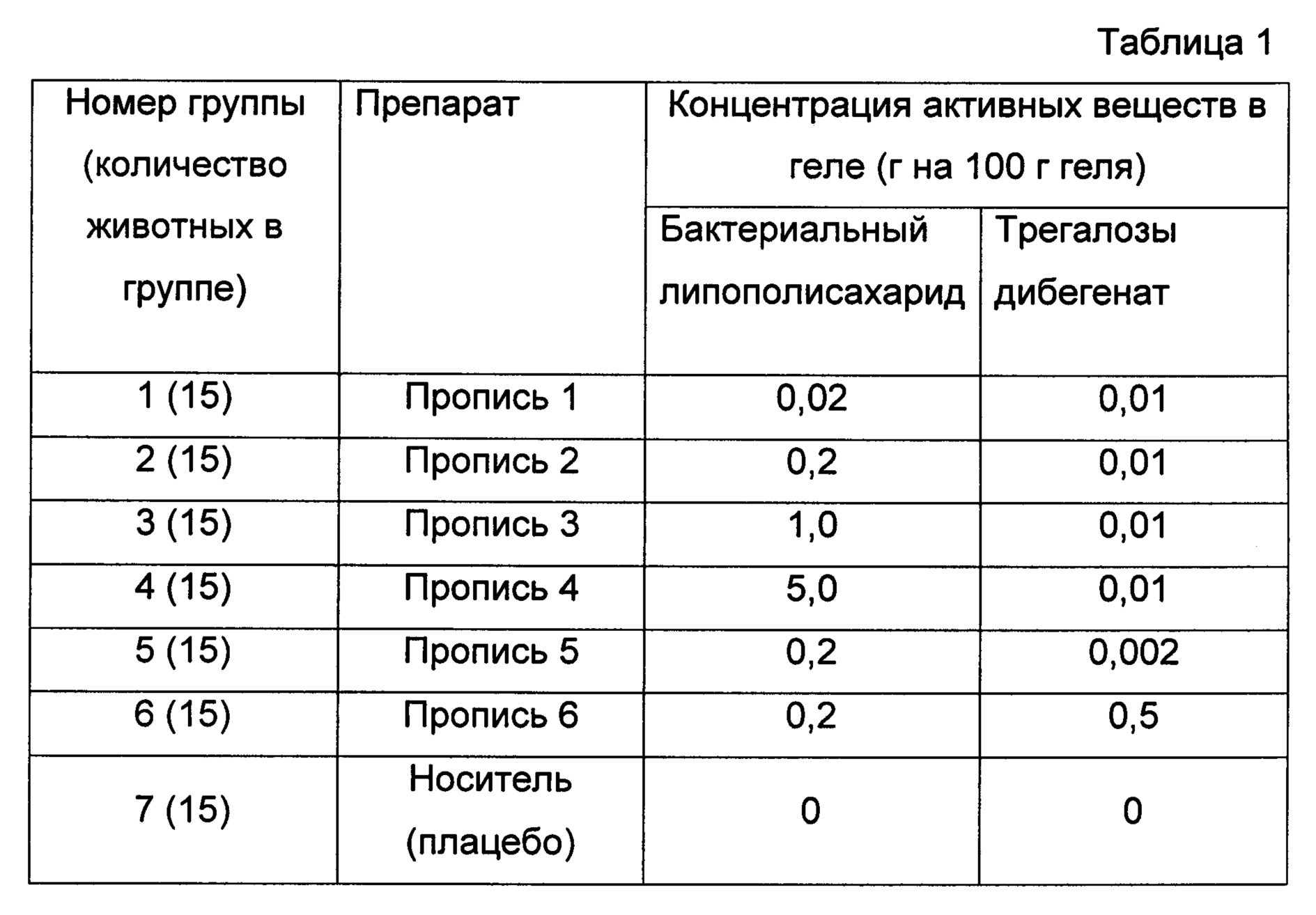 Область техники Изобретение относится к медицине и фармакологии, а именно к лекарственным средствам для терапии хронических ран и язв кожи, обладающим многофакторным воздействием на процессы регенерации и воспаления, и может быть использовано в хирургии. Уровень техники Известен способ профилактики и лечения инфекций роговицы глаз с использованием липополисахаридов Pseudomonas aeruginosa (Патент США №6984622). Недостатком указанного способа является ограниченная область применения (офтальмология). Кроме того, к недостаткам данного способа можно отнести недостаточную эффективность, связанную с особенностями химической структуры липополисахаридов Pseudomonas aeruginosa. Известно лекарственное средство «Пирогенал», содержащее бактериальный липополисахариды Salmonella typhi, предназначенное для системного введения и выпускаемое в виде растворов для инъекций, а также в виде ректальных свечей, применяемое для терапии хронических заболеваний печени, хронических простатитов и уретритов, воспалительных процессов придатков матки, бесплодия, спаечной болезни брюшной полости, псориаза и других заболеваний (патент РФ 2139043). Механизм действия препарата связан с активацией врожденного иммунного ответа, что сопровождается пирогенным эффектом (гипертермией, повышением температуры тела). При терапии раневых дефектов кожи и/или слизистых оболочек системный способ введения не является целесообразным, т.к. невозможно при системном введении, учитывая высокую скорость метаболизма данного соединения, обеспечить достижение терапевтических концентраций липополисахаридов в области раневого дефекта. К недостаткам также относится наличие пирогенного эффекта. Известно лекарственное средство, предназначенное для стимуляции регенерации раневых дефектов кожи и слизистых оболочек в форме геля, содержащая в качестве активного компонента бактериальные липополисахариды, а также, в качестве вспомогательных веществ водорастворимое производное целлюлозы, многоатомный спирт, консерванты и воду очищенную (Патент РФ 2447082). Недостатком изобретения является то, что данный препарат селективно таргетирует только один рецептор системы врожденного иммунного ответа, а именно, Толл-подобный рецептор 4 (TLR4), что исключает возникновения эффекта синергизма, наблюдаемого при одновременной активации нескольких рецепторов врожденного иммунного ответа. Раскрытие изобретения Задачей изобретения является повышение эффективности терапии хронических ран, в том числе трофических язв различной локализации, путем использования высокоэффективного с точки зрения биологической доступности лекарственного средства, способного одновременно таргетировать два рецептора системы врожденного иммунного ответа, а именно, рецепторы TLR4 и Mincle (CLEC4E). Указанная задача решается за счет того, что лекарственное средство для терапии хронических ран содержит бактериальный липополисахарид, трегалозу дибегенат, водорастворимое производное целлюлозы, многоатомный спирт, консерванты и воду очищенную в эффективных соотношениях. При этом лекарственное средство выполнено в виде геля при следующем соотношении компонентов в граммах на 100 г геля: В качестве водорастворимого производного целлюлозы используют натриевую соль карбоксиметилцеллюлозы, в качестве многоатомного спирта используют гли