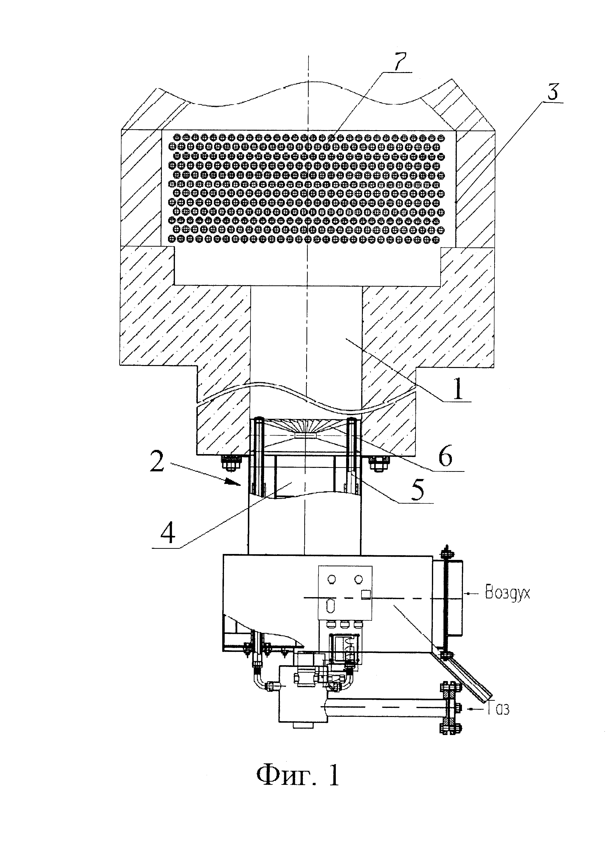 1. Трубчатая печь, содержащая камеру сгорания с горелкой, сообщенную с камерой теплообмена, в которой размещены продуктовые трубы, отличающаяся тем, что горелка включает газовые стволы и воздуховод, при этом концы газовых стволов размещены в камере сгорания вокруг выходного отверстия воздуховода, в камере сгорания установлен завихритель воздушного потока, продуктовые трубы представляют собой трубчатый теплообменник с поперечно обтекаемым пучком труб, а в коллекторах трубчатого теплообменника установлены перегородки с образованием последовательно-параллельной схемы соединения труб. 2. Печь по п. 1, отличающаяся тем, что камера сгорания имеет цилиндрическую форму, а камера теплообмена в поперечном сечении имеет прямоугольную форму. 3. Печь по п. 2, отличающаяся тем, что оси газовых стволов параллельны оси воздуховода и камеры сгорания. 4. Печь по п. 1, отличающаяся тем, что завихритель представляет собой лопаточный завихритель, между лопатками которого расположены концы газовых стволов.