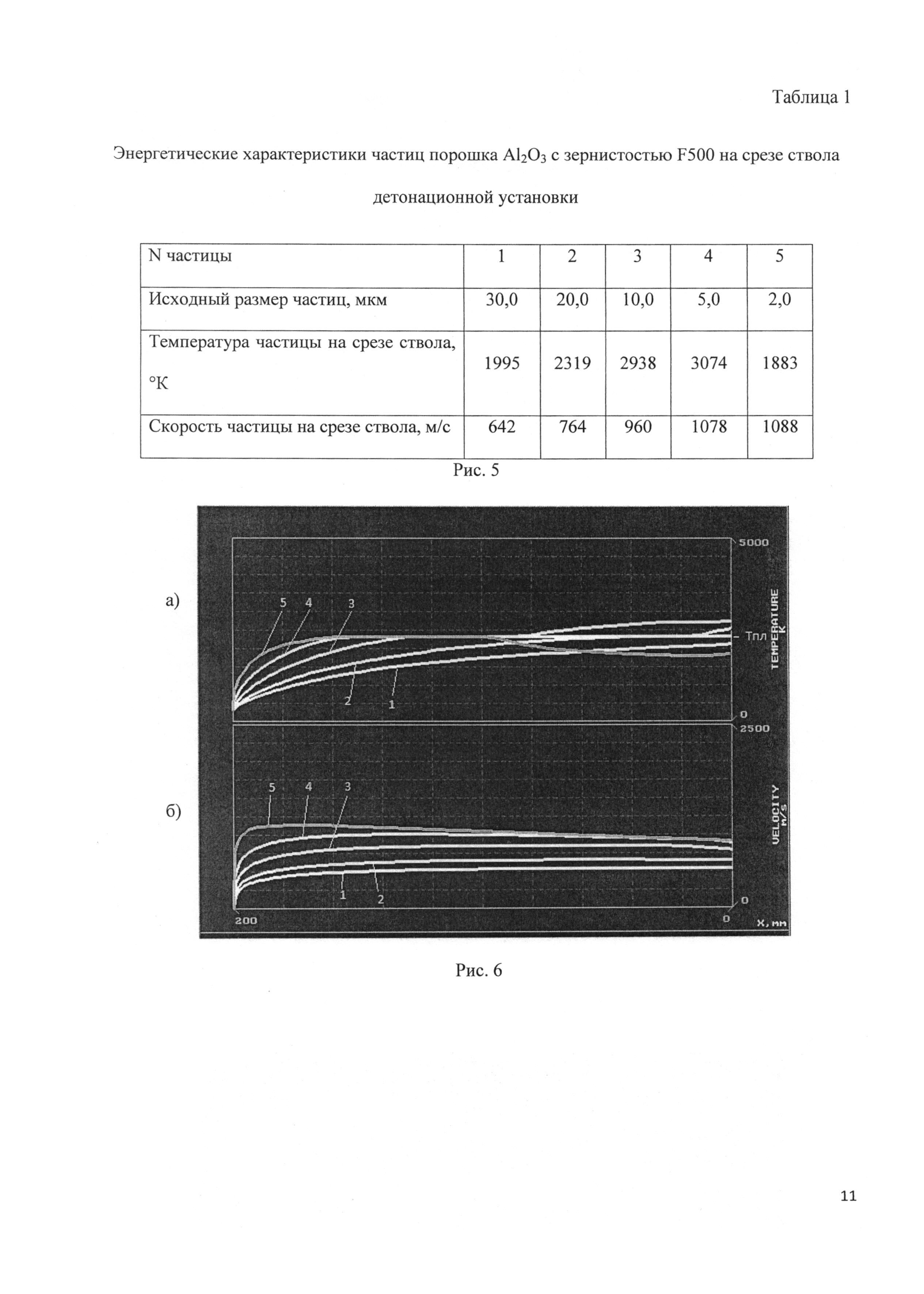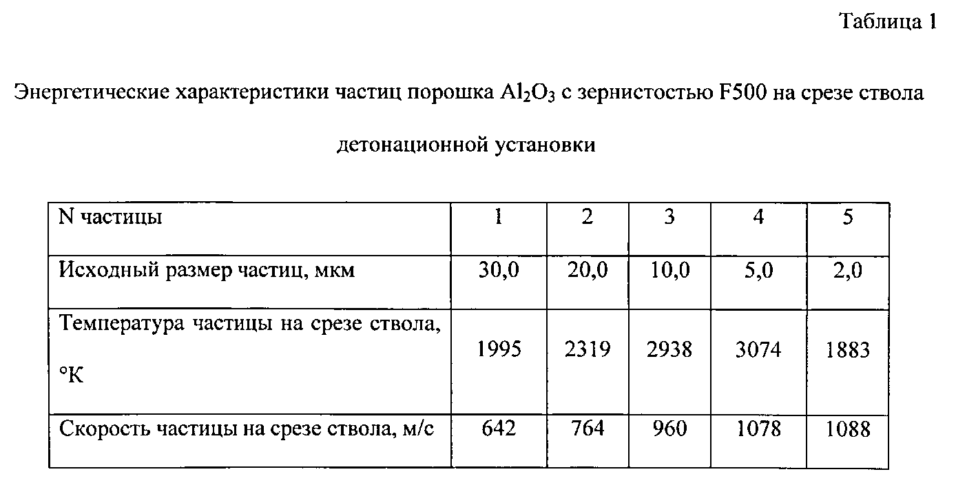 Изобретение относится к области газотермического напыления покрытий, а именно к технологии нанесения покрытий детонационным методом. Известен способ газодинамического напыления покрытий, в котором поверхность изделия подвергается совместному воздействию потока абразивных и напыляемых частиц, описанный в патенте РФ №2183695, кл. С23С 24/04, заявл. 25.08.2000 г., опубл. 20.06.2002 г. Данный способ заключается в том, что абразивные частицы с помощью сжатого воздуха активируют поверхность изделия, создавая необходимый микрорельеф, а напыляемые частицы, попадая на практически ювенильную поверхность, одновременно формируют слой покрытия. Данный способ имеет следующие недостатки. Указанный способ применим только при нанесении покрытий из пластичных металлов и сплавов. Нанесение покрытий из керамики, в том числе из Al2О3, невозможно из-за низкой температуры ускоряемых воздухом частиц. В связи с непрерывным характером процесса скорость абразивных и напыляемых частиц невелика, что не позволяет достичь высоких эксплуатационных характеристик покрытий. Более близким к описываемому изобретению по достигаемому результату является способ нанесения детонационного покрытия, включающий воздействие на поверхность потока частиц корунда, формируемого с помощью установки детонационного напыления, описанный в книге Бартенев С.С., Федько Ю.Л., Григоров А.И. «Детонационные покрытия в машиностроении», Машиностроение, 1982 г., стр. 133, прототип. Указанный способ заключается в том, что подготовка поверхности изделия проводится непосредственно перед нанесением покрытия частицами корунда, ускоренными в самой детонационной установке. При этом подготовка поверхности осуществляется частицами порошка, которые в дальнейшем используются для напыления покрытия. Однако режимы работы детонационной установки подбираются такие, чтобы частицы порошка при выходе из ствола не достигали температуры плавления и сохраняли необходимую твердость для получения требуемого микрорельефа. После завершения этапа подготовки поверхности установку перенастраивают на режимы работы, при которых температура частиц порошка при выходе из ствола достигает температуры плавления, и начинают процесс собственно напыления покрытия. Основными недостатками данного способа является следующее. Остановка работы детонационной установки для ее перенастройки с режима подготовки поверхности на режим напыления покрытия требует времени, достаточного для значительного снижения степени активации за счет перехода поверхности в равновесное состояние. Выделение этапа подготовки поверхности детали в отдельный переход приводит к снижению производительности процесса в целом. В связи с разделением этапов подготовки поверхности и напыления расход дорогостоящего порошкового материала оказывается повышенным. Желаемым техническим результатом изобретения является повышение производительности процесса и качества подготовки поверхности за счет устранения отдельного этапа подготовки напыляемой поверхности. Желаемый технический результат достигается тем, что в известном способе детонационного нанесения покрытия из оксида алюминия на металлическую поверхность изделия абразивную обработку поверхности и напыление покрытия проводят одновременно на одних и тех же режимах работы детонаци