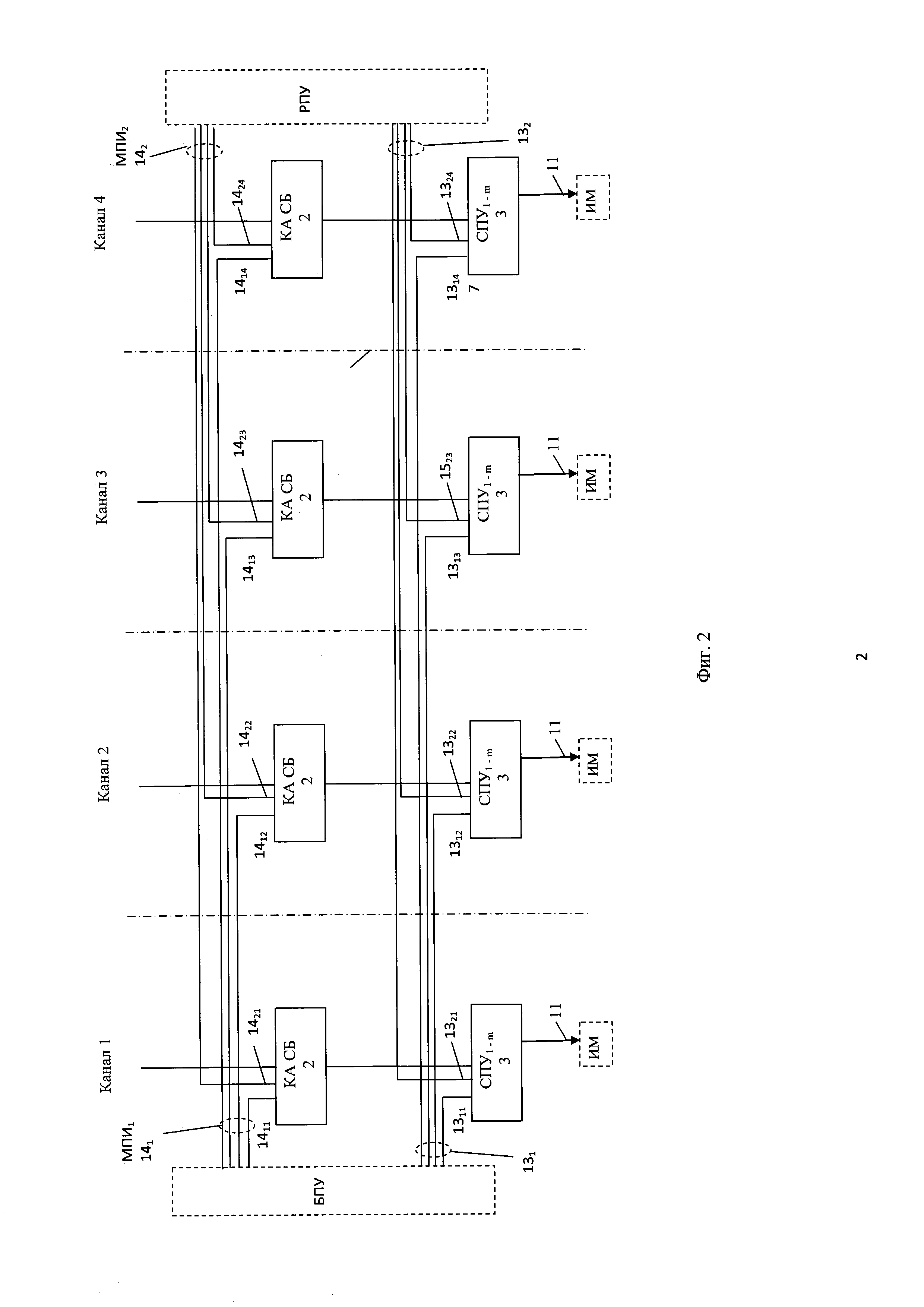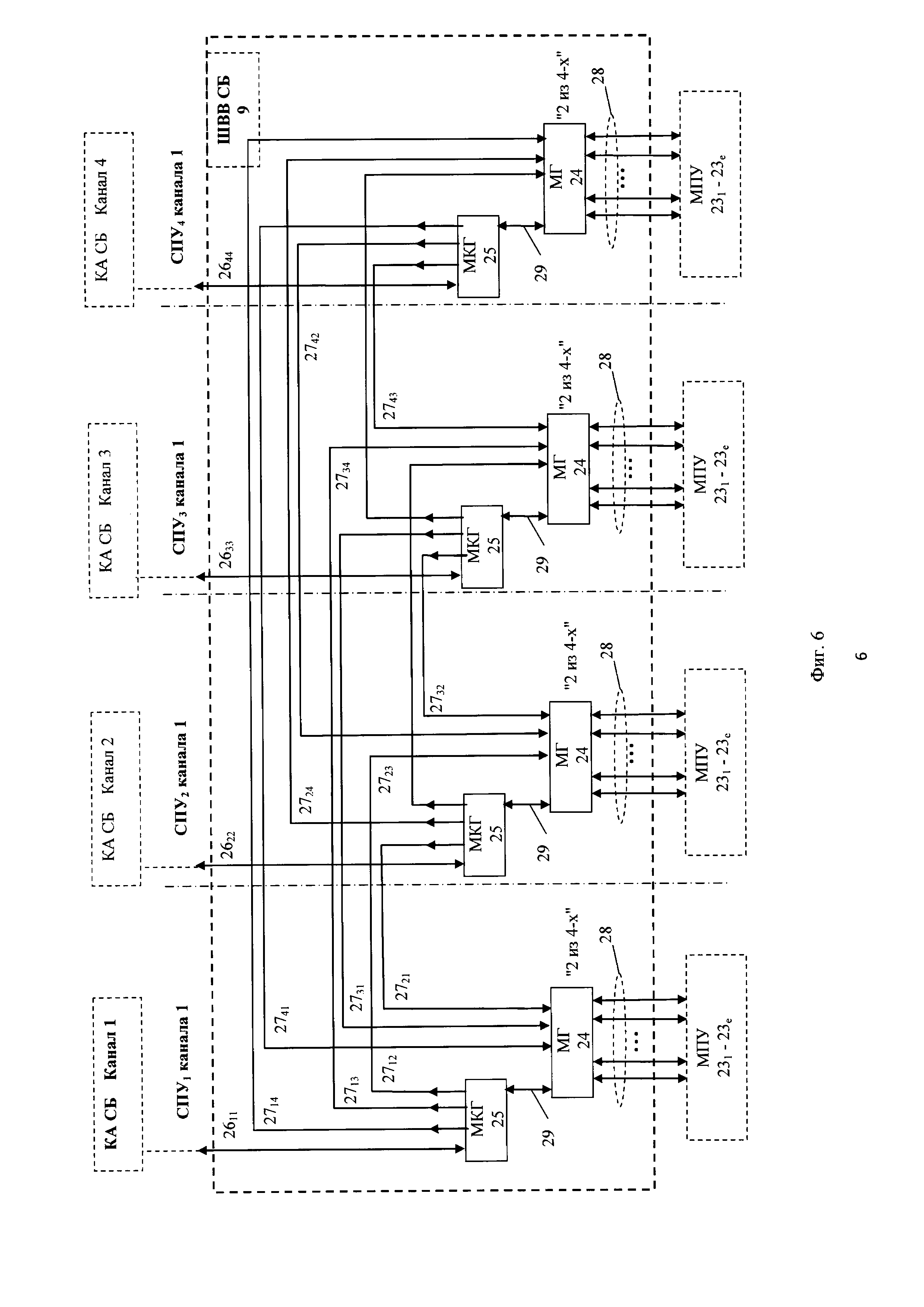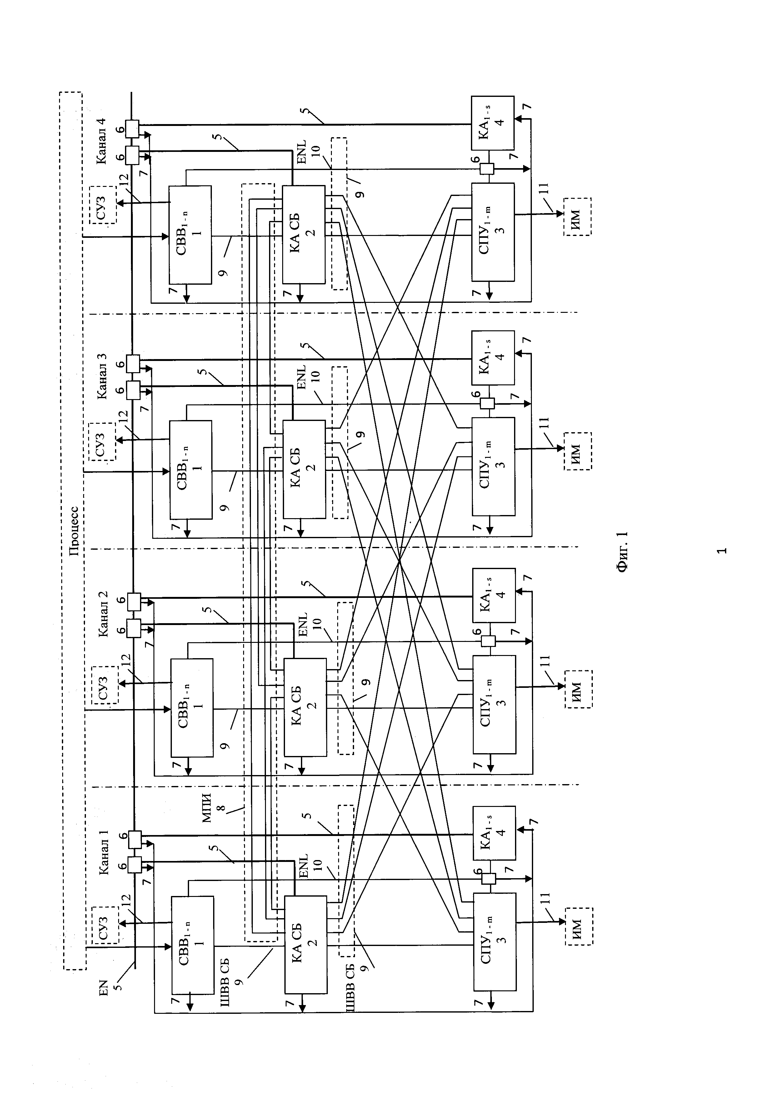 Изобретение относится к автоматике и вычислительной технике и может быть использовано в системах автоматизированного контроля и управления атомными станциями (АЭС) для построения управляющих систем безопасности (УСБ) АЭС. Известна цифровая система защиты атомной станции (патент США №6049578 МПК G21C 7/36, опубл. 11.04.2000, аналог) состоящая из четырех идентичных каналов обработки и управления, обеспечивающих распознавание аварийной ситуации на объекте путем сравнения цифровых значений измеряемых параметров с заданными уставками и выполнения заданных пользователем защитных действий в случае выхода параметров за границы уставок. Каналы безопасности, физически отделенные друг от друга, перекрестно соединены по оптоволоконным линиям связи. Каждый канал состоит из аналоговых и дискретных датчиков, связанных с этим каналом; аналогово-цифровых преобразователей, обеспечивающих на выходе цифровое представление измеряемых аналоговых сигналов; бистабильного процессора; логического процессора соответствия и логического процессора инициирования исполнительных механизмов и средств автоматической защиты реактора. Бистабильный процессор принимает цифровые значения измеренных сигналов собственного канала, преобразует их в технологические параметры, проверяет измеренные параметры на отклонение за установленные границы, формирует по каждому параметру двоичный признак отклонения, передает эти признаки по оптоволоконным линиям в другие каналы обработки и управления. Логический процессор соответствия получает от бистабильного процессора своего канала двоичные признаки отклонения параметров сигналов данного канала и принимает по оптоволоконным линиям от других каналов двоичные признаки отклонения по соответствующим параметрам. По каждому параметру логический процессор соответствия проверяет поступление признаков выхода за допустимые границы 2-х из 4-х каналов. Если процессор соответствия обнаруживает отклонение от допустимых значений параметров по 2-м из 4-х каналов, то логический процессор инициирования формирует необходимые сигналы для остановки реактора и приведения в действие цифровых технических средств безопасности. Система защиты имеет следующие недостатки. Отсутствует возможность доступа со стороны системы нормальной эксплуатации к датчикам и исполнительным механизмам системы безопасности, что требует дополнительных затрат для мониторинга состояния и управления общим оборудованием АЭС системами нормальной эксплуатации и безопасности. Аппаратура системы защиты не имеет средств самоконтроля с внешним мониторингом его результатов, что затрудняет локализацию неисправностей и увеличивает время восстановления. Каналы безопасности построены на одних и тех же цифровых аппаратных средствах обработки и управления, базовом и системном программном обеспечении. Это может привести к отказам УСБ по общей причине, вызываемых скрытыми неисправностями в программируемой аппаратуре и скрытыми ошибками в базовом и системном программном обеспечении. Известна управляющая цифровая система безопасности (УЦСБ) атомной электростанции и способ обеспечения параметров безопасности (патент РФ №2356111, МПК G21C 7/36, публикация 2009 г., прототип) состоящая из трех отдельных идентичных каналов безопасности, выполняющих оценку 