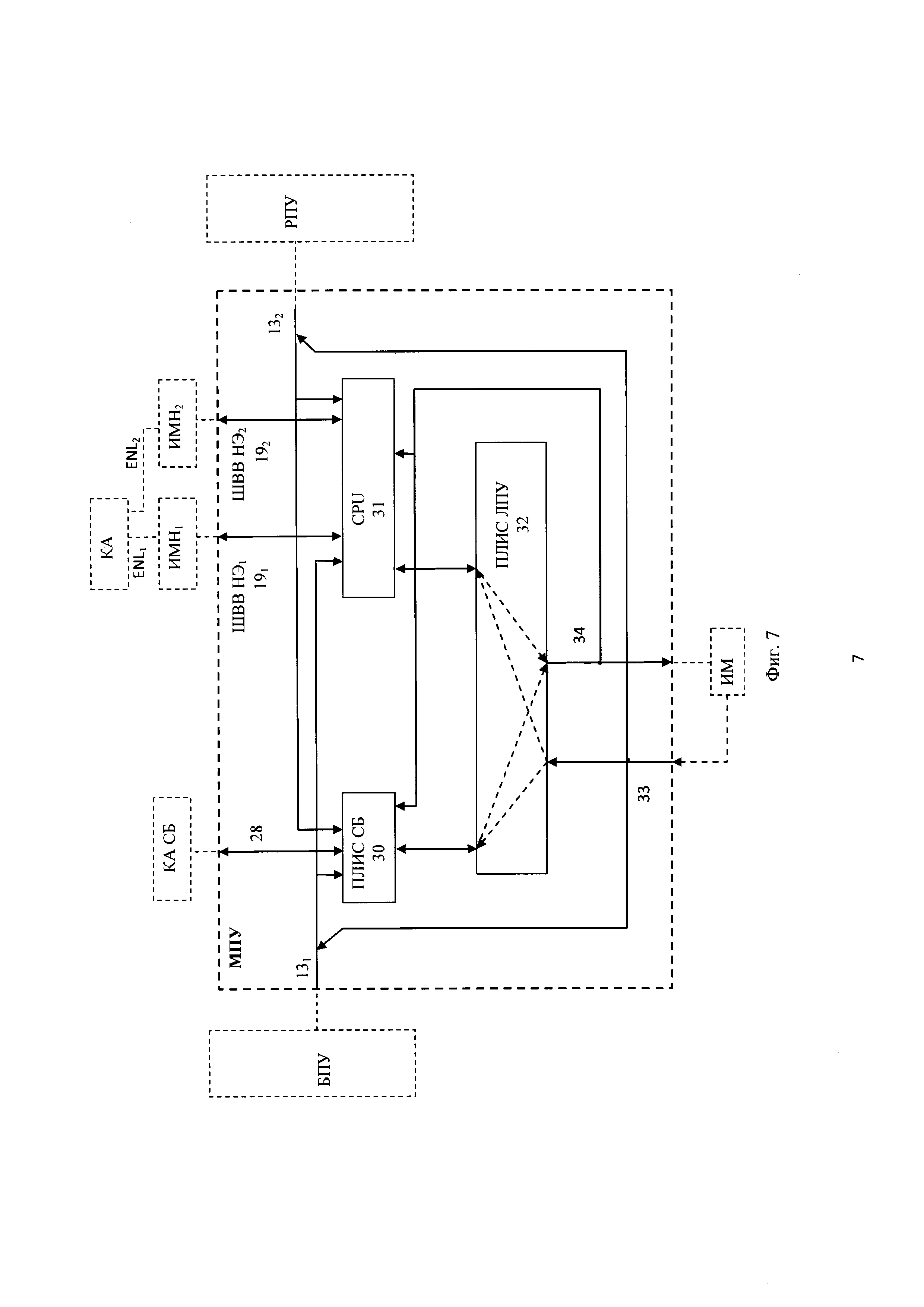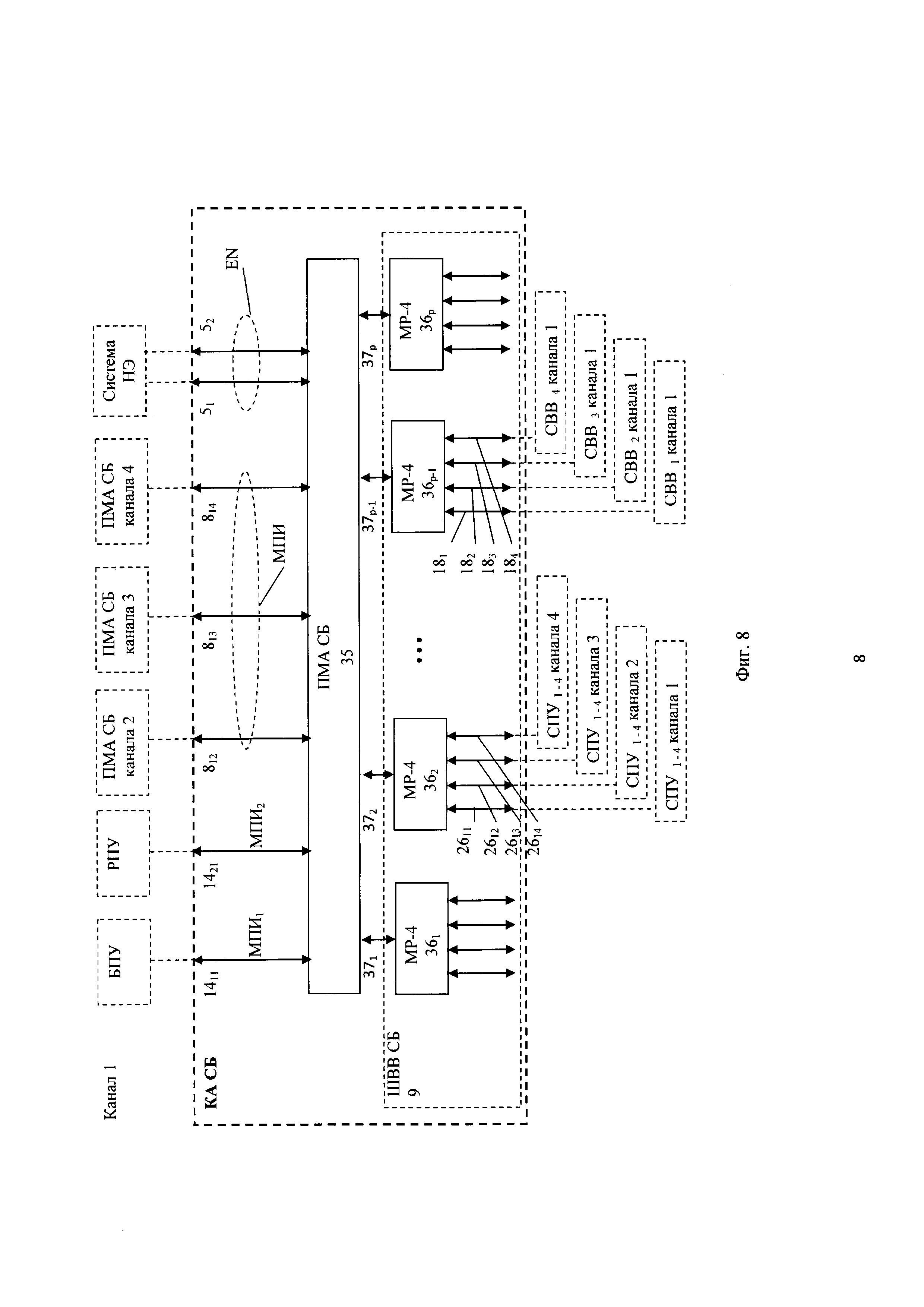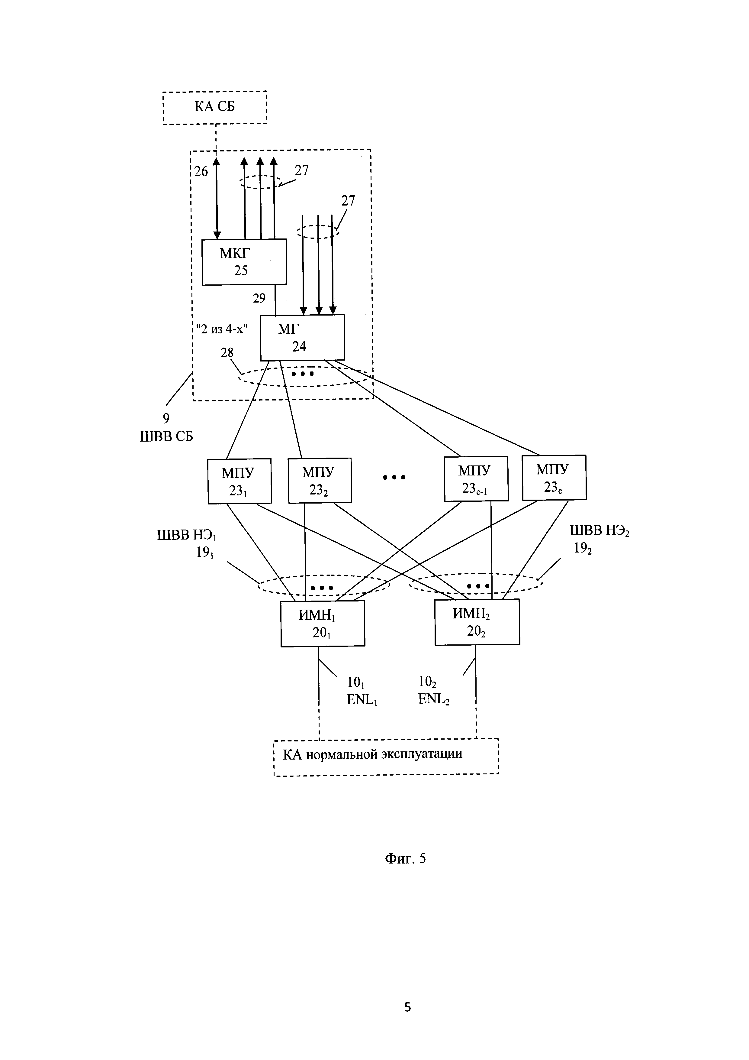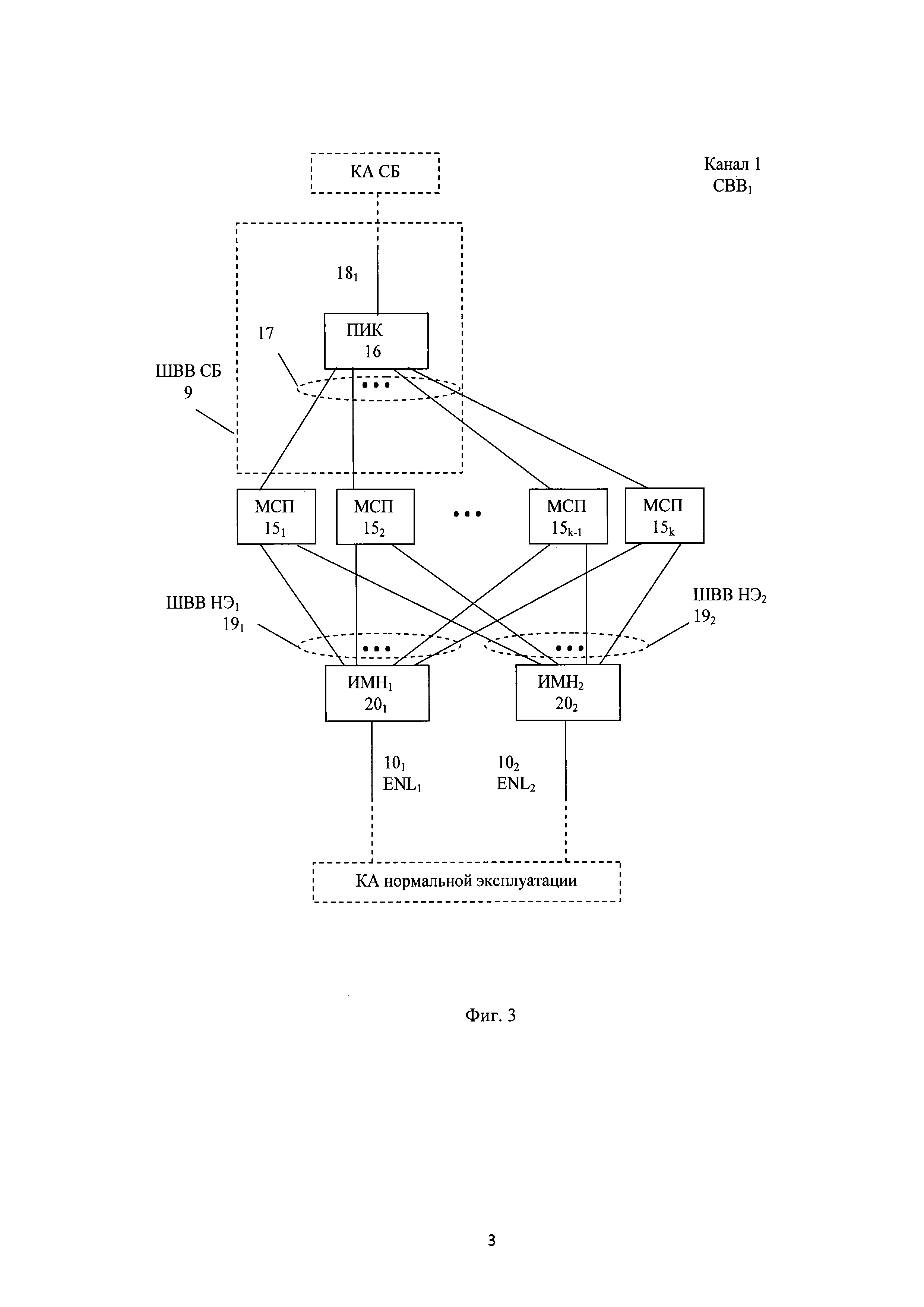 1. Управляющая система безопасности атомной электростанции, содержащая множество идентичных каналов безопасности, каждый канал включает станции ввода-вывода сигналов технологического процесса СВВ1-n, станции приоритетного управления исполнительными механизмами СПУ1-m, которые соединены с блочным пунктом управления БПУ и резервным пунктом управления РПУ, контроллер автоматизации средств безопасности КА СБ, шину ввода-вывода средств безопасности ШВВ СБ обмена данными контроллера КА СБ со станциями СВВ и СПУ, и соединен с другими каналами безопасности с помощью перекрестных дуплексных оптоволоконных связей, отличающаяся тем, что станция СВВ содержит модули связи с технологическим процессом МСП1-k и коммуникационный модуль-преобразователь интерфейсов коммуникаций ПИК шины ШВВ СБ, станция СПУ содержит модули приоритетного управления исполнительными механизмами МПУ1-e и коммуникационные модули: модуль коммуникации голосования МКГ и модуль голосования МГ шины ШВВ СБ, контроллер автоматизации КА СБ содержит процессорный модуль автоматизации средств безопасности ПМА СБ и коммуникационные модули - модули разветвления MP-41-p шины ШВВ СБ, контроллеры автоматизации КА СБ всех каналов безопасности подключены к системе нормальной эксплуатации по резервированной шине EN, построенной на базе коммутируемого интерфейса Ethernet, кольцевой структуры соединения сетевых коммутаторов и коммуникационного протокола уровня данных, каждый канал безопасности дополнительно содержит контроллеры автоматизации нормальной эксплуатации КА1-s, которые соединены со станциями CBB1-n, станциями СПУ1-m по резервированным шинам ENL нормальной эксплуатации, построенным на базе коммутируемого интерфейса Ethernet, радиальной структуры соединения сетевых коммутаторов и коммуникационного протокола уровня данных, и с системой нормальной эксплуатации по резервированной шине EN нормальной эксплуатации, контроллеры автоматизации нормальной эксплуатации КА, встроенные в станции СВВ и СПУ средства связи КА с модулями МСП и МПУ и встроенные в модули МСП и МПУ программно-аппаратные средства нормальной эксплуатации, построены на разных аппаратно-программных платформах, станции СВВ, СПУ, контроллер КА СБ и аппаратура питания и коммуникации системы безопасности содержат встроенные средства самотестирования и самоконтроля, формирующие на выходах двоичные сигналы состояния соответствующей аппаратуры «исправна/неисправна», поступающие в КА НЭ, где сигналы обрабатываются и передаются на верхний уровень управления системы нормальной эксплуатации по шине EN. 2. Управляющая система безопасности атомной электростанции по п. 1, отличающаяся тем, что в станции СВВ коммуникационный модуль ПИК шины ШВВ СБ по отдельным линиям связи ШВВ СБ соединен с контроллером автоматизации КА СБ канала безопасности и с каждым модулем МСП1-k этой станции. 3. Управляющая система безопасности атомной электростанции по п. 2, отличающаяся тем, что каждая станция СВВ содержит два резервированных интерфейсных модуля ИМН нормальной эксплуатации, подключенные к контролеру автоматизации нормальной эксплуатации КА НЭ по резервированной шине ENL, в каждый модуль МСП1-к встроен отдельный процессор нормальной эксплуатации, соединенный с каждым из 2-х модулей ИМН по отдельной линии последовательн