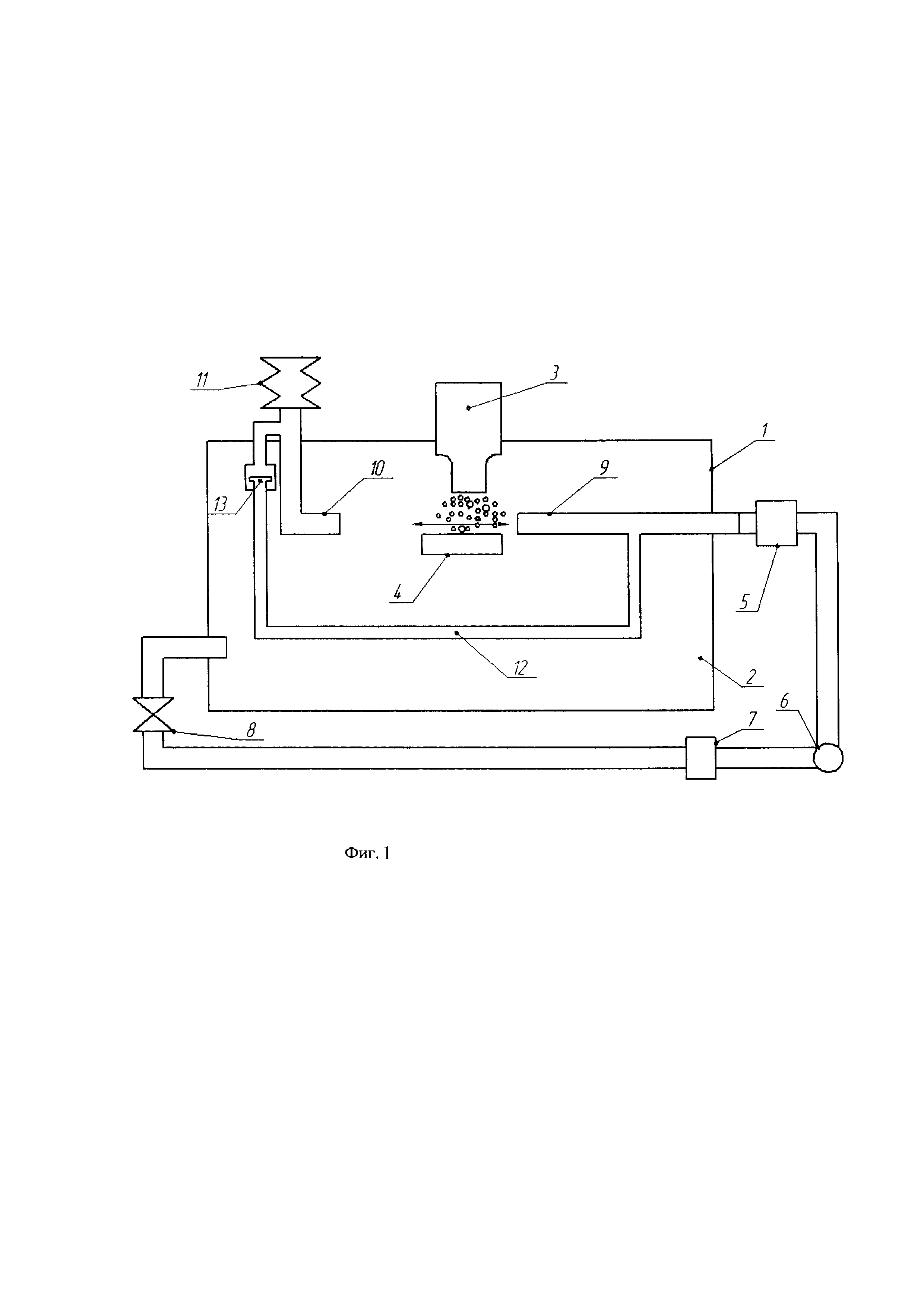 Изобретение относится к области ультразвуковой обработки и предназначено для очистки изделий авиационной техники от технологических и эксплуатационных загрязнений. Подобный вариант ультразвуковой очистки способен выполнять широкий ряд задач связанных с очисткой различных поверхностей деталей газотурбинных двигателей и авиационной техники, таких как, охлаждаемые лопатки, топливные коллекторы, форсунки, элементы гидравлики и другие сложнофасонные изделия, от стойких загрязнений, имеющих сложную природу и не поддающихся качественной очистке другими методами. Известны способы ультразвуковой очистки изделий, при которых изделия погружают в моющую жидкость в которой создается ультразвуковое поле стержневым излучателем (источник ультразвуковых колебаний), излучающая поверхность которого совершает поршневые колебания с амплитудой смещений 15-30 мкм [Панов А.П. «Ультразвуковая высокоамплитудная очистка поверхности». В кн. «Воздействие мощного ультразвука на межфазную поверхность металлов». М., «Наука», 1986, с. 217]. К недостаткам таких способов относится малая по протяженности, до 15-20 мм в направлении излучения, зона интенсивного образования кавитационных пузырьков, обеспечивающая очистку поверхности изделий. Известен способ генерирования колебаний жидкостного потока с использованием жидкостных центробежных форсунок, которые позволяют получить пульсирующий жидкостной поток. [Патент РФ №2087756, 20.08.1997] Наиболее близким аналогом, принятым в качестве прототипа является способ ультразвуковой очистки изделий, при котором с целью интенсификации рабочего процесса, на изделие, помещенное в рабочую жидкость воздействуют одновременно двумя ультразвуковыми излучателями [Патент РФ №2378058]. При этом жидкостному потоку с кавитационными свойствами, создаваемому основным высокочастотным излучателем, сообщается дополнительная энергия от второго, низкочастотного излучателя, с целью увеличить зону интенсивного образования кавитационных пузырьков и тем самым повысить эффективность очистки. К недостаткам этого способа можно отнести одинаковую природу двух воздействий на очищаемое изделие, позволяющих интенсифицировать в какой-то степени процесс очистки, но не добавляющих новых эффектов для разрушения и вымывания загрязнений. Способ состоит в том, что на изделие, помещенное в рабочую емкость с моющей жидкостью, воздействуют ультразвуковые колебания от источника ультразвукового излучения и одновременно на изделие направляется затопленная струя моющей жидкости с меняющимися во времени скоростью и расходом. Устройство для одновременного воздействия на очищаемую поверхность ультразвуковых эффектов, способствующих разрушению и удалению загрязнения, и переменного жидкостного потока состоит из источника ультразвуковых колебаний и генератора колебаний жидкостного потока, в основе которого жидкостная центробежная форсунка. Для генерирования колебательного движения моющей жидкости с задаваемой переменной скоростью в зоне очистки устройство содержит регулируемую упругую емкость. Устройство обеспечивает создание ультразвуковых колебаний в моющей жидкости и сопутствующих распространению ультразвука в жидкой среде эффектов, таких как кавитация, радиационное давление, образование акустических течений, которые уси