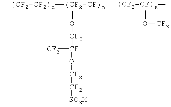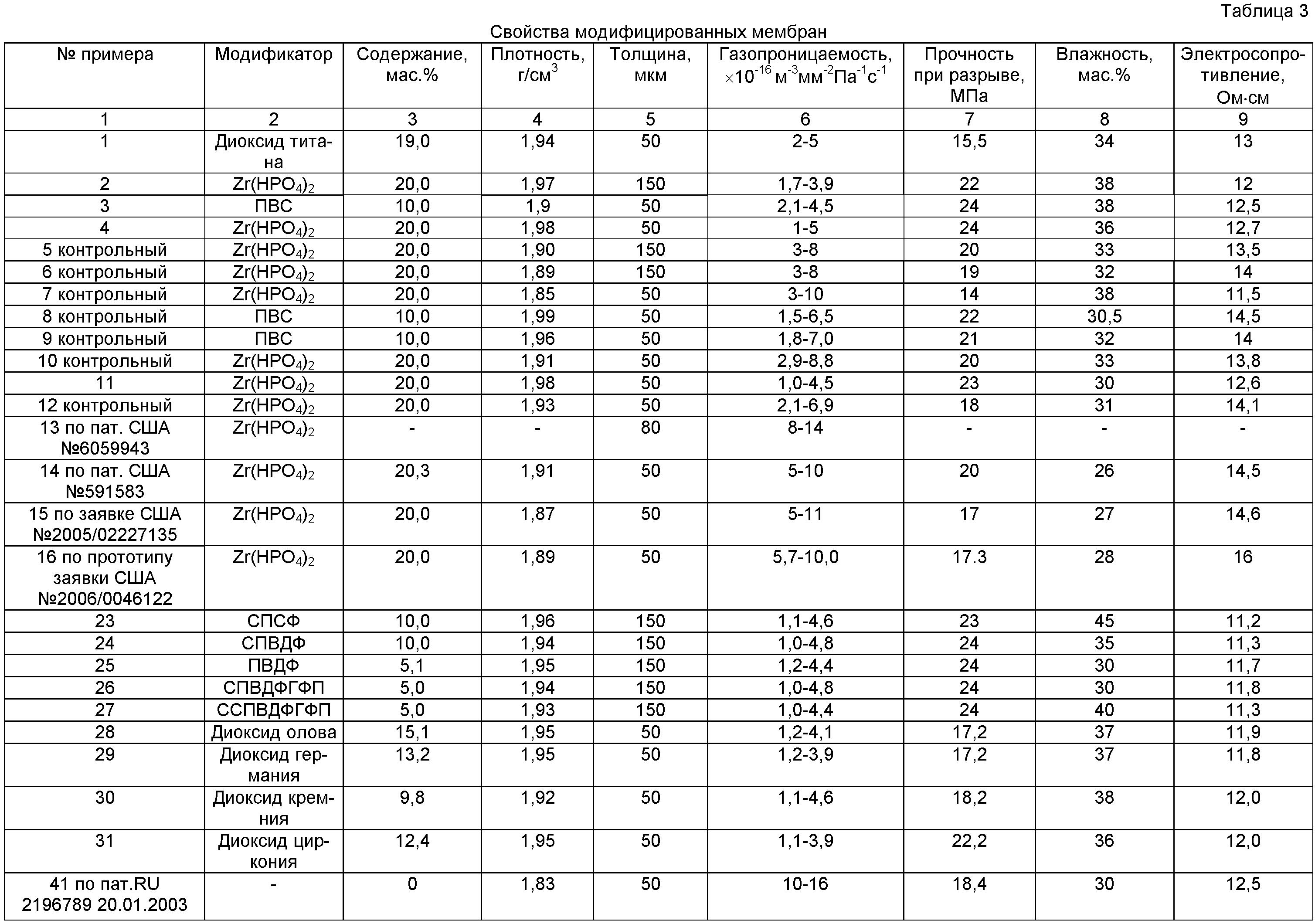 напряжение па ячейке 0,7 В плотность тока 1,4 А/см2 содержание диоксида титана 19 мас.% прочность при разрыве 15,5 МПа электросопротивление 13,1 Ом·см влажность 34 мас.% содержание цирконилфосфата 20 мас.% прочность при разрыве 22 МПа электросопротивление 12,1 В влажность 38 мас.% напряжение на ячейке 0,7 В плотность тока 0,9 А/см2 для водородно-воздушного ТЭ плотность тока 1,3 А/см2 для водородокислородного ТЭ содержание поливинилого спирта 10 мас.% прочность при разрыве 24 МПа электросопротивление 12,8 Ом·см влажность 37,9 мас.% напряжение па ячейке 0,7 В плотность тока 0,7 А/см2 для водородно-воздушного ТЭ плотность тока 1 А/см2 для водородно-кислородного ТЭ напряжение на ячейке 0,7 В плотность тока 0,5 А/см2 для водородно-воздушного ТЭ плотность тока 0,8 А/см2 для водородно-кислородного ТЭ содержание фосфата циркония 16 мас.% прочность при разрыве 18 МПа электросопротивление 16,5 Ом·см влажность 24,4 мас.% содержание цирконилфосфата 17,3 мас.% прочность при разрыве 14 МПа электросопротивление 16,5 Ом·см влажность 24,8 мас.% напряжение на ячейке 0,7 В плотность тока 0,7 А/см2 для водородно-воздушного ТЭ плотность тока 0,9 А/см2 для водородно-кислородного ТЭ напряжение на ячейке 0,7 В плотность тока 0,6 А/см2 для водородно-воздушного ТЭ плотность тока 0,8 А/см2 для водородно-кислородного ТЭ содержание фосфата циркония 16,6 мас.% прочность при разрыве 14,3 МПа электросопротивление 19,4 Ом·см влажность 24 мас.% содержание сульфированного полисульфона 10 мас.% прочность при разрыве 25 МПа электросопротивление 11,1 Ом·см влажность 45,2 мас.% содержание сульфированного полисульфона 10 мас.% прочность при разрыве 25 МПа электросопротивление 11,30 Ом·см влажность 39,9 мас.% содержание поливинилиденфторида 10 мас.% прочность при разрыве 26 МПа электросопротивление 11,7 Ом·см влажность 30,3, мас.% содержание сополимера винилиденфторида с гексафторпропиленом 5 мас.% прочность при разрыве 26 МПа электросопротивление 11,7 Ом·см влажность 30,3, мас.% содержание сульфированного сополимера винилиденфторида с гексафторпропиленом 5 мас.% прочность при разрыве 25 МПа электросопротивление 11,3 Ом·см влажность 40,3, мас.% напряжение на ячейке 0,75 В плотность тока 1,4 А/см2 содержание диоксида олова 15 мас.% прочность при разрыве 14,2 МПа электросопротивление 11,9 Ом·см влажность 37 мас.% напряжение на ячейке 0,75 В плотность тока 1,4 А/см2 содержание диоксида германия 13 мас.% прочность при разрыве 17,2 МПа электросопротивление 11,8 Ом·см влажность 37 мас.% напряжение на ячейке 0,74 В, плотность тока 1,4 А/см2 содержание диоксида кремния 12 мас.% прочность при разрыве 18,2 МПа электросопротивление 12,0 Ом·см влажность 38 мас.% напряжение на ячейке 0,73 В плотность тока 1,4 А/см2 содержание диоксида циркония 12 мас.% прочность при разрыве 22,2 МПа электросопротивление 12,0 Ом·см влажность 36 мас.% напряжение на ячейке 0,60 В плотность тока 1,3 А/см2 прочность при разрыве 18,2 МПа электросопротивление 12,4 Ом·см влажность 31 мас.% Таблица 1 Свойства образцов исходных перфторсульфокатионитовых мембран (КОМ) № образца Состав КОМ ЭМ Степень кристалличности Функциональная группа ТФЭ ПФСМ ПФВЭ 1 2 3 4 5 6 7 1 75 22,0 3 750 - SO3H 2 74,3 20,7 5 800 5 SO3H 3 74,3 20,7 5 800 5 SO3Li 4 78,8 20,7 0,5 800 7 SO3Li 5 78,8 20,7 0,5 800 7 SO3H 6 76,6 18,4 5 900 8 SO3H 7 78,6 18,4 3 900 9 SO3H 8 78,6 18,4 3 900 9 SO3Li 9 81,1 18,4 0,5 900 9 SO3H 10 81,6 18,4 0 900 10 SO3H 11 76,1 18,4 5,5 900 8 SO3H 12 82,7 16,8 0,5 980 10 SO3Li 13 84,5 15 0,5 1090 11 SO3Li 14 83,8 15,7 0,5 1050 9 SO3H 15 81,3 15,7 3 1050 9 SO3H 16 79,3 15,7 5 1050 10 SO3H 17 84,3 15,7 0 1050 12 SO3H 18 78,8 15,7 5,5 1050 10 SO3H Таблица 2 Условия получения
