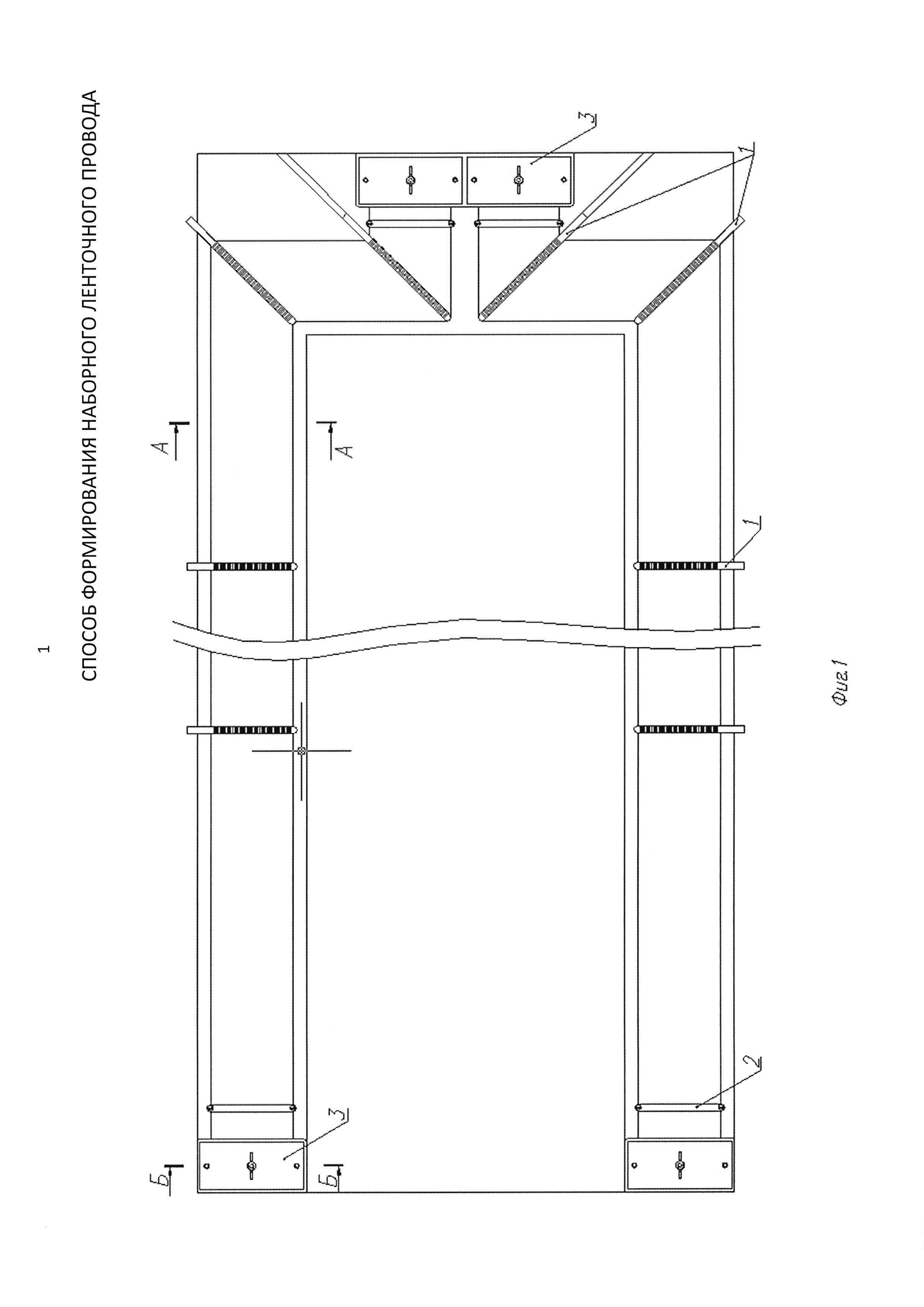 Изобретение относится к электротехнике, в частности к кабельной технике, а именно к изготовлению и применению ленточных проводов, и может быть использовано в сложных радиотехнических и электронных системах. Известны различные способы формирования ленточных проводов: Согласно изобретению по патенту [1. Патент 2305336 С2 RU, МПК6 Н01В 7/08. Трехмерный сформованный плоский кабель, способ его изготовления и применения / Ребель Дени (FR), Франк Торстен (DE). (10.09.2003). Опубл. 27.08.2007. Бюл. №24] задача решается посредством трехмерного сформованного формостабильного плоского кабеля, состоящего из многослойного материала. Материал включает по меньшей мере одну заключенную между двумя изоляционными слоями токопроводящую дорожку и по крайней мере один несущий слой, которые соединены друг с другом посредством клеевого слоя, причем многослойный материал или все компоненты для многослойного материала нанесены на формовочный инструмент и под действием тепла, облучения и/или давления сформованы, а также посредством охлаждения ниже температуры стеклования Tg клеевого слоя или отверждения клеевого слоя зафиксированы в трехмерной форме. В качестве материала используется гибкий плоский кабель (FFC). Недостатками являются: - во-первых, использование готовых гибких плоских кабелей ограничивает конечное изделие в размерах и электрических параметрах из-за узконаправленной номенклатуры, в отличие от применения, например, одножильных проводов; - во-вторых, ленточный провод, представленный в примерах, будет иметь очень узкое применение; - в-третьих, в отраслях промышленности, где действуют ограничения по номенклатуре проводов, разрешенной для применения, и вовсе возникнут проблемы по подбору такого типа материала. Согласно изобретению по патенту [2. Пат. 2152656 RU, МПК6 Н01В 7/08, Н01В 13/00. Прессованный кабель, заготовки и способ для его изготовления / Юсбранд Флойд P. (US) - Заявл. 31.01.1996; опубл. 10.07.2000, Бюл. №19.] кабель предпочтительно содержит несколько проводов и пластический материал, переплетенный с проводами в тканеподобную структуру для предохранения проводов и удержания их на некотором расстоянии один от другого. Тканеподобную структуру пластического материала обычно формируют литьем под давлением. Недостатки данного аналога: - во-первых, данный процесс изготовления ленточного провода очень трудоемок, так как требует постоянного изготовления пластического материала и последующего плетения провода; - во-вторых, усложняется процесс изготовления сложной геометрии проводов. Согласно изобретению по патенту [3. Пат. 2533885 RU, МПК6 Н01В 7/08. Транспонированный гибкий комбинированный ленточный жгут / Ионов А.Г. и др. - Заявл. 13.12.2012; опубл. 27.11.2014, Бюл. №33]. Данный способ формирования представляет собой токопроводящие жилы или кабели на их основе, соединенные между собой гибкой связью с помощью плетения или ткани. Технический результат заключается в создании компактного, гибкого, комбинированного, прочного единого кабеля, обладающего возможностью в любой точке жгута как разветвления, так и соединения токопроводящих жил, проводов или групп проводов, при этом сохраняя свои эксплуатационные свойства. Недостатками аналога являются: - во-первых, при формировании ленточного провода таким способом теряется его плоская форма при транспортировке; - во-вторых, провода, сформированные 