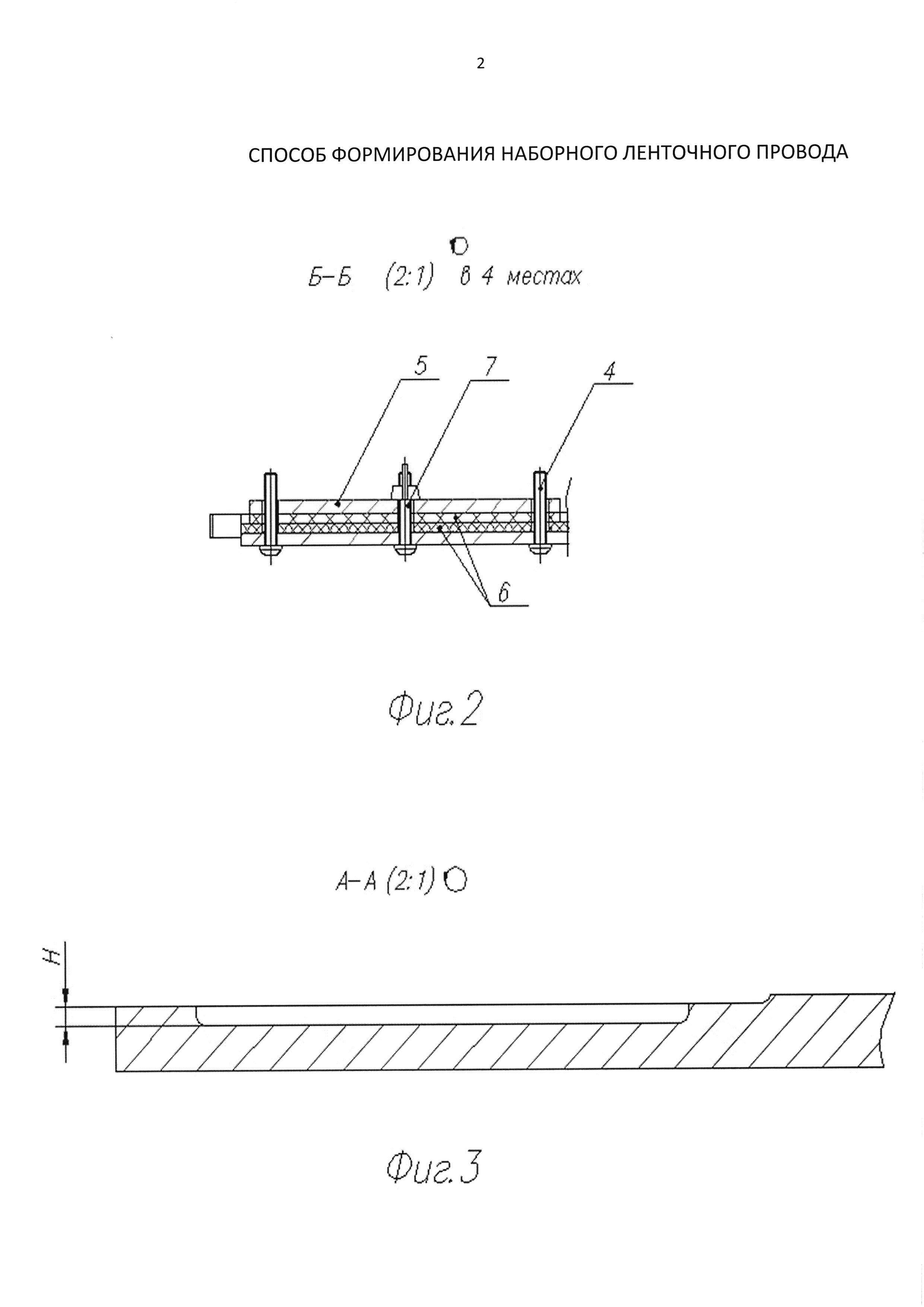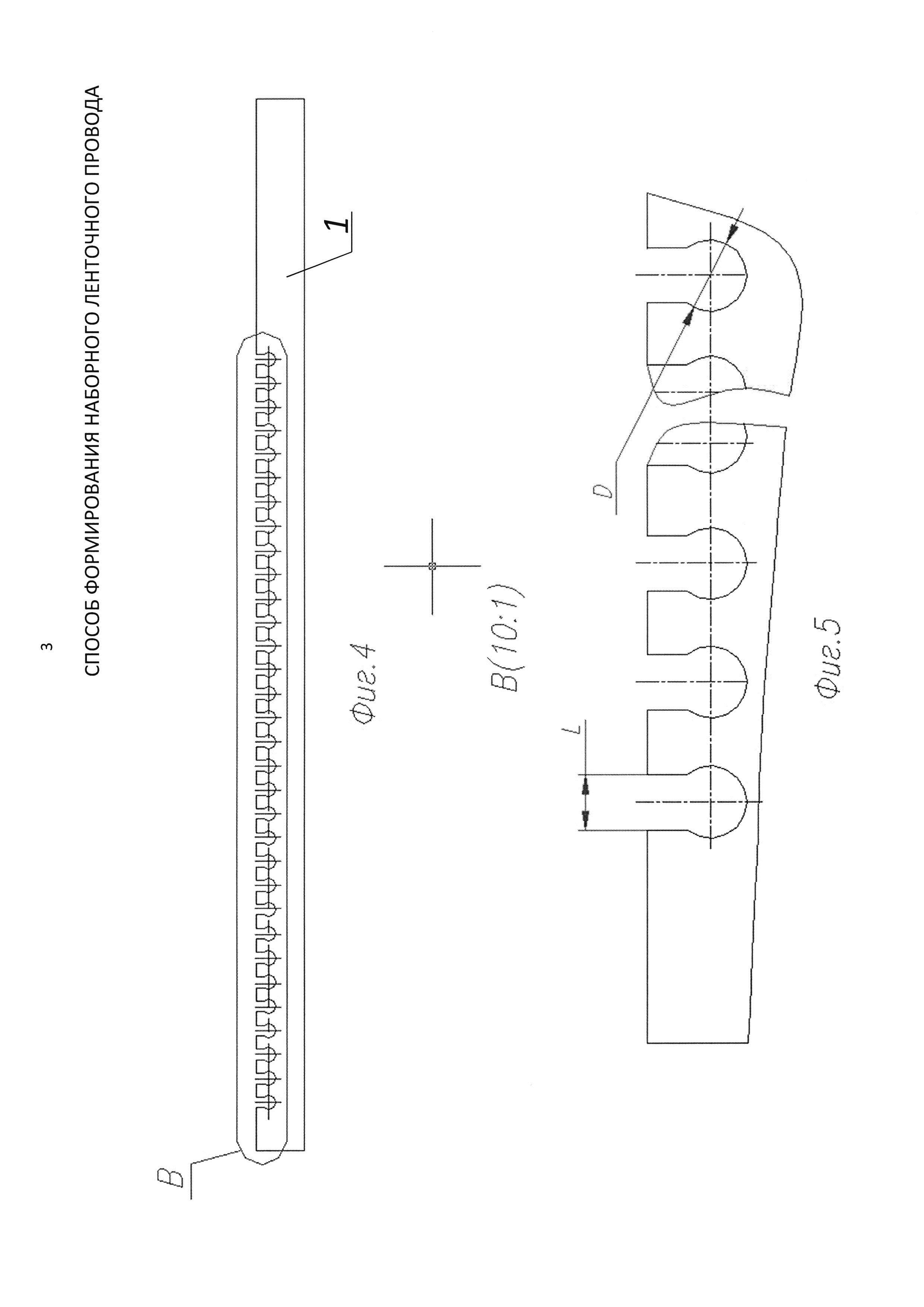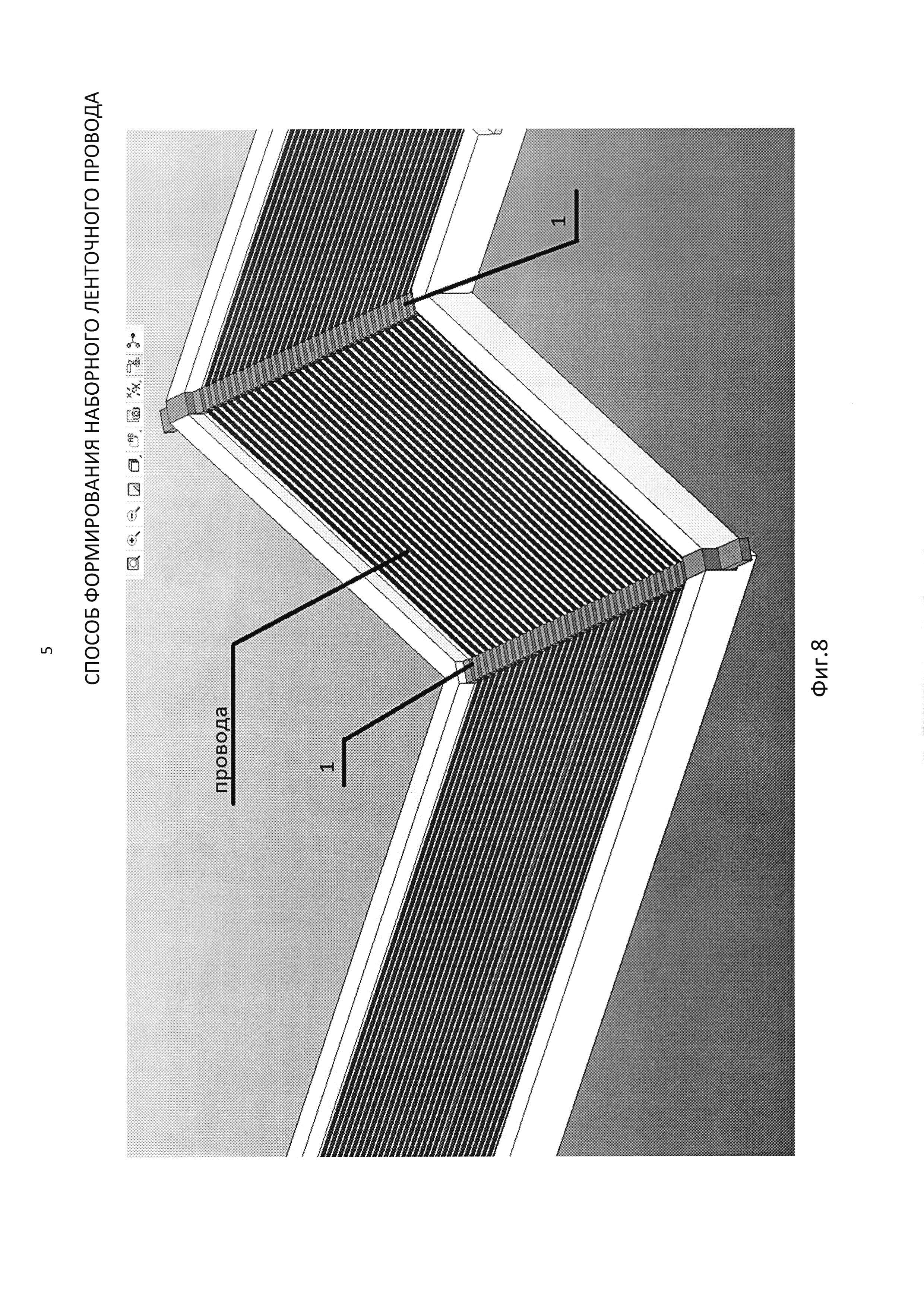 Способ формирования наборного ленточного провода, при котором формирование геометрии ленточного провода производят путем параллельной раскладки проводов по гребешкам, состоящим из направляющих пазов, соответствующих необходимому количеству проводов в изготавливаемом ленточном проводе, отличающийся тем, что раскладку проводов производят на поверхности, повторяющей поверхность конкретного изделия с углублением, соответствующим будущей геометрии ленточного провода и обеспечивающим необходимые повороты проводов на протяжении всего участка, причем формирование геометрии ленточного провода производят до нанесения подслоя, обеспечивающего адгезию связующего слоя к проводам, и связующего слоя, с последующим отверждением и фиксацией трехмерной формы.