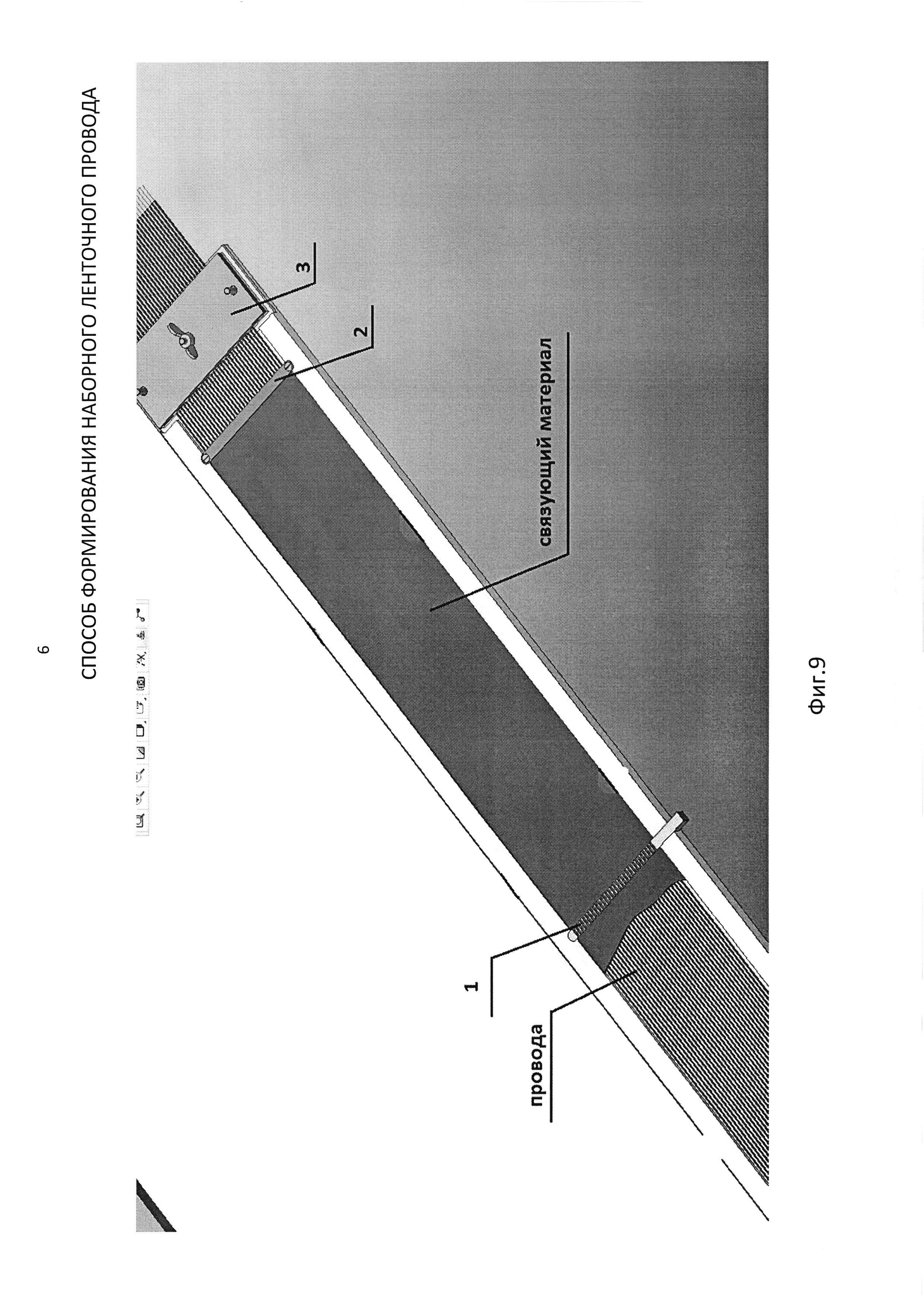 Изобретение относится к электротехнике, в частности к кабельной технике, а именно к изготовлению и применению ленточных проводов, и может быть использовано в сложных радиотехнических и электронных системах. Формирование геометрии ленточного провода производят путем параллельной раскладки проводов на поверхности, повторяющей поверхность конкретного изделия с углублением, соответствующим будущей геометрии ленточного провода, по гребешкам, состоящим из направляющих пазов, соответствующих необходимому количеству проводов в изготавливаемом ленточном проводе, а также обеспечивающим необходимые повороты проводов на протяжении всего участка, причем формирование геометрии ленточного провода производят до нанесения подслоя, обеспечивающего адгезию связующего слоя к проводам, и связующего слоя, с последующим отверждением и фиксацией трехмерной формы. Изобретение обеспечивает повышение качества и надежности изделий при его применении, существенно сокращает сроки поставки материала, значительно снижает стоимость материала. 9 ил.