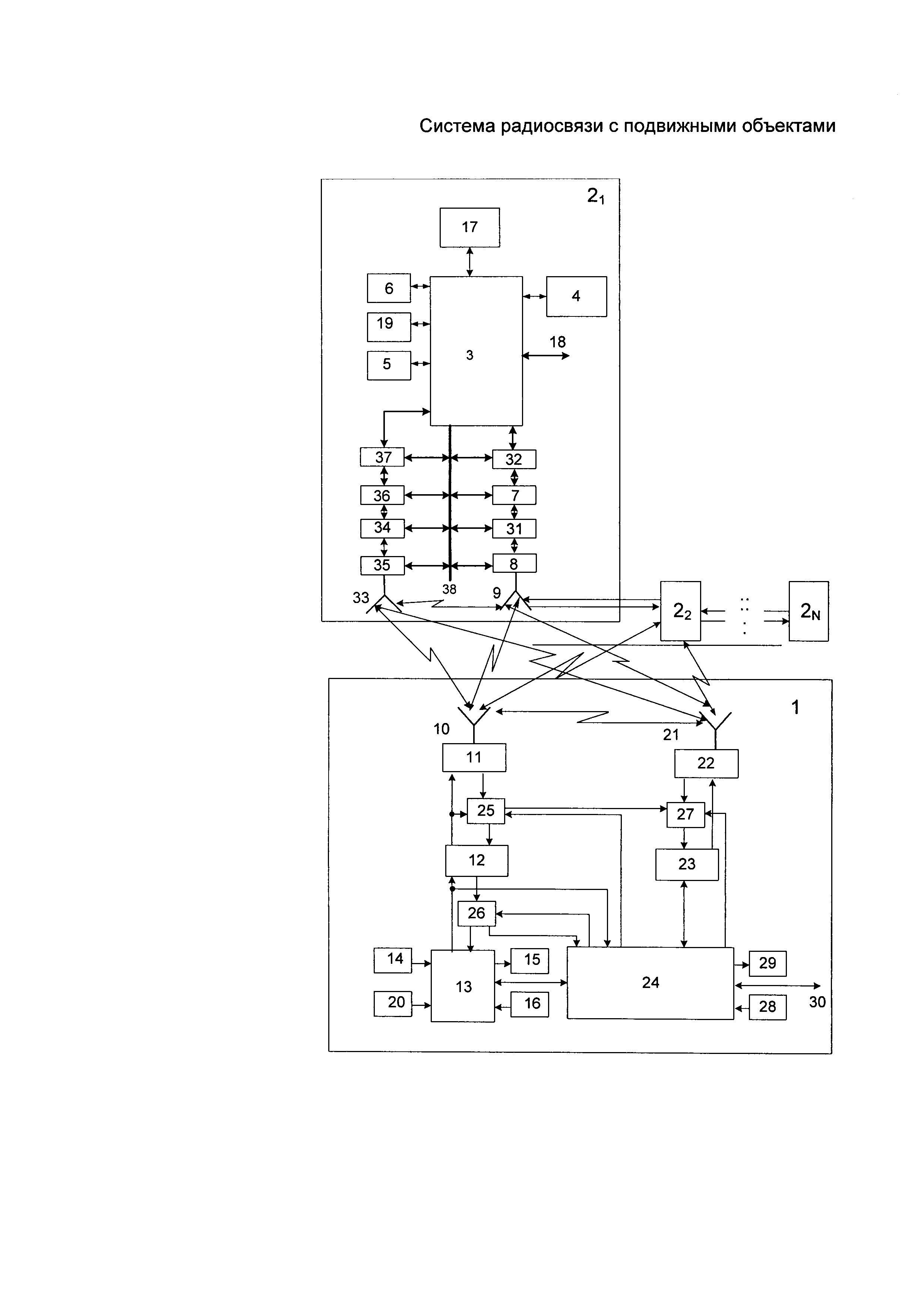 Система радиосвязи с подвижными объектами (ПО), состоящая из наземного комплекса (НК), содержащего первую наземную антенну, подключенную к высокочастотному входу/выходу первой радиостанции, низкочастотный вход которой подключен к соответствующему выходу первой аппаратуры передачи данных (АПД), первый вычислитель автоматизированного рабочего места (АРМ), первый выход которого подключен к первому входу первой АПД, первый вход первого вычислителя автоматизированного рабочего места подключен к наземному приемнику сигналов навигационных спутниковых систем, второй вход - к первому пульту управления АРМ, второй выход - к первому монитору АРМ, наземный формирователь типа ретранслируемых сообщений, соединенный с третьим входом первого вычислителя АРМ, вторую наземную радиостанцию, высокочастотный вход/выход которой подключен к второй наземной антенне, а ее низкочастотный вход подключен к выходам второй АПД, вход/выход второй АПД соединен двухсторонними связями с первым входом/выходом второго вычислителя автоматизированного рабочего места, коммутатор, первый и второй распределители сигналов, причем низкочастотный выход первой радиостанции через первый распределитель сигналов подключен к входу коммутатора и второму входу первой АПД, а второй выход первой АПД через второй распределитель сигналов подключен к четвертому входу первого вычислителя автоматизированного рабочего места и первому входу второго вычислителя автоматизированного рабочего места, управляющие входы первого и второго распределителей сигналов и коммутатора соединены с первым, вторым и третьим выходами второго вычислителя автоматизированного рабочего места соответственно, первый выход первого вычислителя АРМ подключен также к второму входу второго вычислителя АРМ, первый выход первой АПД соединен также со вторым входом первого распределителя сигналов, низкочастотный выход второй радиостанции через коммутатор подключен к входу второй аппаратуры передачи данных, первый и второй вычислители АРМ соединены между собой двухсторонними связями, третий вход второго вычислителя АРМ подключен к второму пульту управления АРМ, четвертый выход второго вычислителя АРМ - к второму монитору АРМ, третий вход/выход второго вычислителя АРМ является входом/выходом системы радиосвязи для сопряжения с внешними системами, причем передача данных с НК обеспечивается по цепочке последовательно соединенных первого подвижного объекта, второго ПО и далее до N-го ПО, а передача данных с N-го ПО на НК осуществляется в обратном порядке, и N подвижных объектов, в состав каждого из которых входят бортовые датчики, блок регистрации данных, приемник сигналов навигационных спутниковых систем, анализатор типа принимаемых сообщений и бортовой формирователь типа ретранслируемых сообщений, каждый из которых соединен двухсторонними связями с соответствующими входами/выходами бортового вычислителя, вход/выход которого подключен к двунаправленной шине системы управления подвижным объектом, первая бортовая аппаратура передачи данных, первая бортовая радиостанция, высокочастотный вход/выход которой подключен к первой бортовой антенне, при этом первая и вторая наземные антенны связаны по эфиру между собой, отличающаяся тем, что в каждый подвижный объект введены дополни