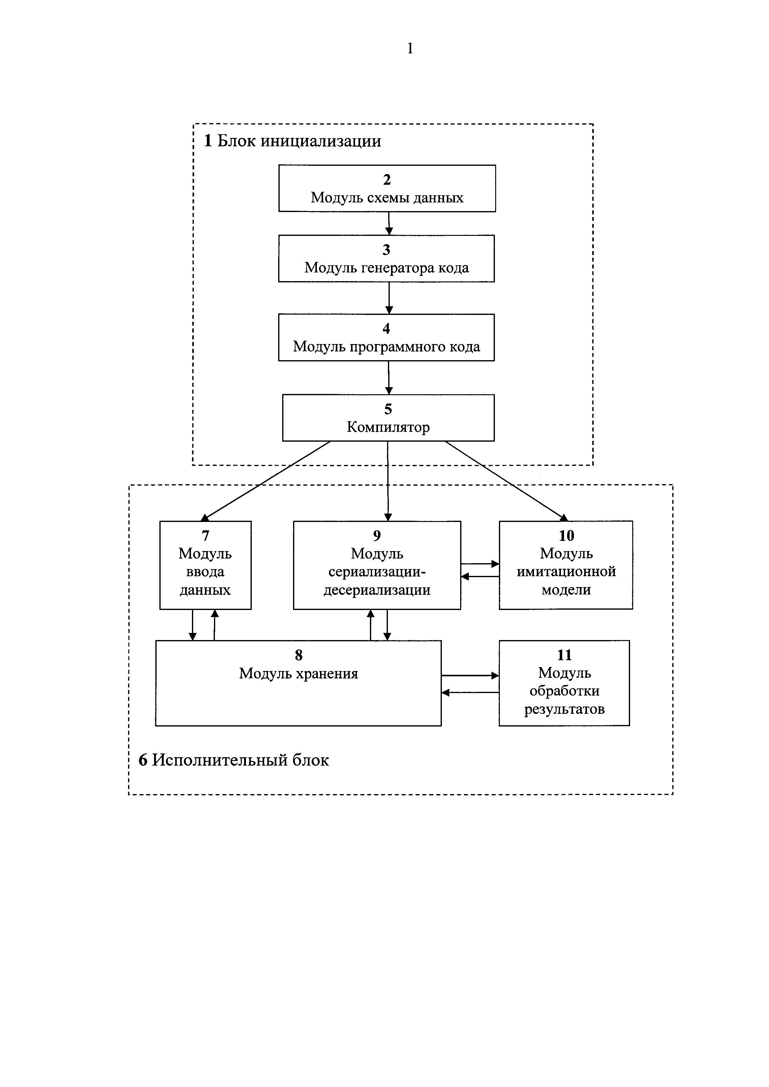 1. Способ автоматизированного конфигурирования имитационных моделей беспилотных летательных аппаратов (БПЛА) состоящий в том, что осуществляют актуализацию имитационной модели за счет введения оператором исходных данных, преобразования исходных данных в документы в формате схемы данных, преобразования документов в структуру данных в формате имитационной модели, последовательного обращения к структурам данных в формате имитационной модели, обработки полученных результатов, сохранения данных и результатов, отличающийся тем, что до актуализации автоматизированного конфигурирования осуществляют подготовительный этап инициализации, заключающийся в том, что в схеме данных задают описание всех подлежащих конфигурированию элементов имитационной модели, преобразуют описание элементов схемы данных в исходный код на языке программирования высокого уровня, осуществляют централизованное хранение исходного кода на языке программирования высокого уровня и транслирование исходного кода из языка высокого уровня в машинный код. 2. Система автоматизированного конфигурирования имитационных моделей беспилотных летательных аппаратов для реализации способа по п. 1, содержащая исполнительный блок, включающий в себя модуль ввода данных, модуль хранения, модуль сериализации-десериализации, модуль имитационной модели и модуль обработки результатов, отличающаяся тем, что система снабжена блоком инициализации, состоящим из модуля схемы данных, модуля генератора кода, модуля программного кода и компилятора, при этом выход модуля схемы данных связан со входом модуля генератора кода, выход модуля генератора кода связан со входом модуля программного кода, выход модуля программного кода связан со входом компилятора, первый выход компилятора связан с первым входом модуля ввода данных, второй выход компилятора связан с первым входом модуля сериализации-десериализации, третий выход компилятора связан с первым входом модуля имитационной модели, выход модуля ввода данных связан с первым входом модуля хранения, первый выход модуля сериализации-десериализации связан со вторым входом модуля хранения, второй выход модуля сериализации-десериализации связан со вторым входом модуля имитационной модели, выход модуля имитационной модели связан с третьим входом модуля сериализации-десериализации, первый выход модуля хранения связан со вторым входом модуля ввода данных, второй выход модуля хранения связан со вторым входом модуля сериализации-десериализации, третий выход модуля хранения связан со входом модуля обработки результатов, выход модуля обработки результатов связан с третьим входом модуля хранения.