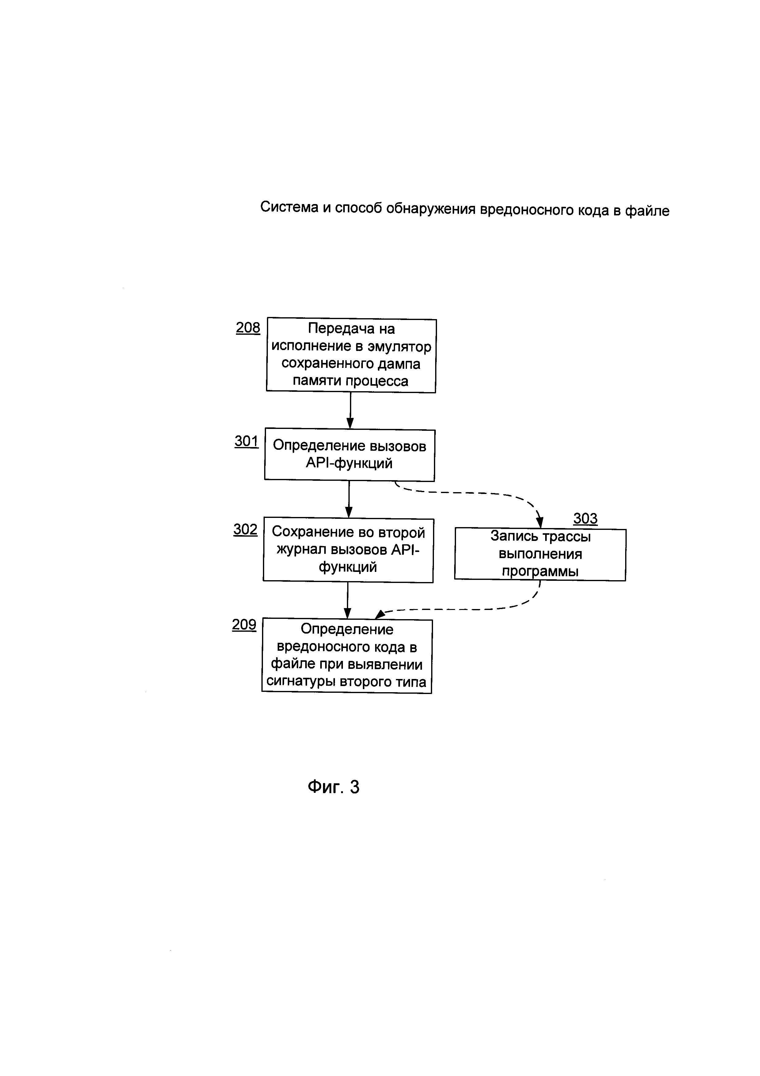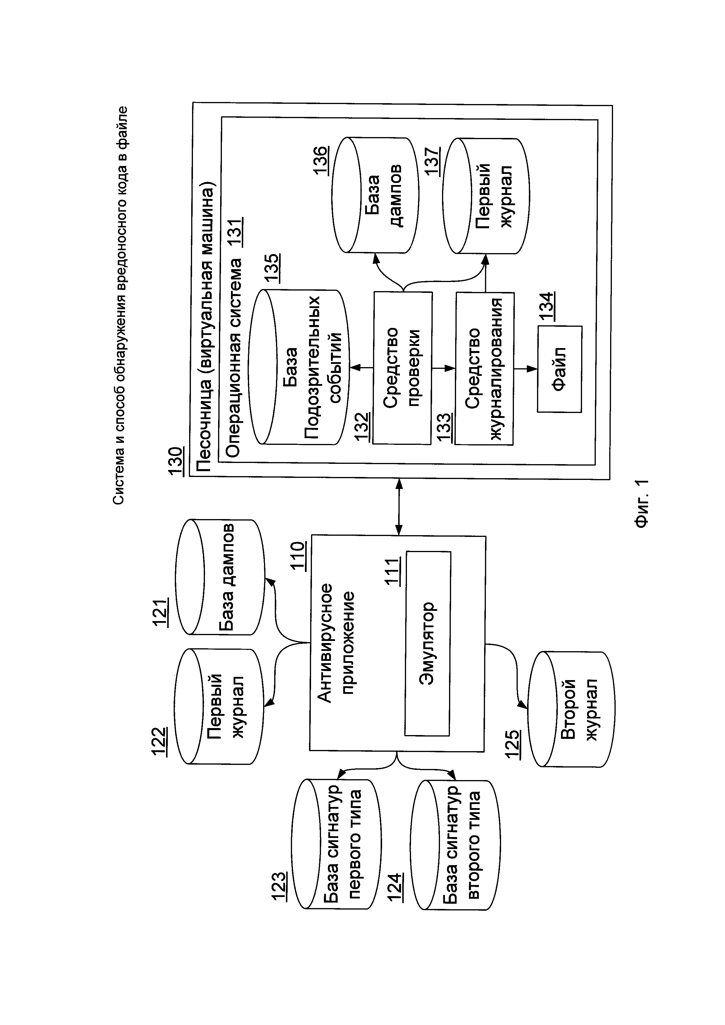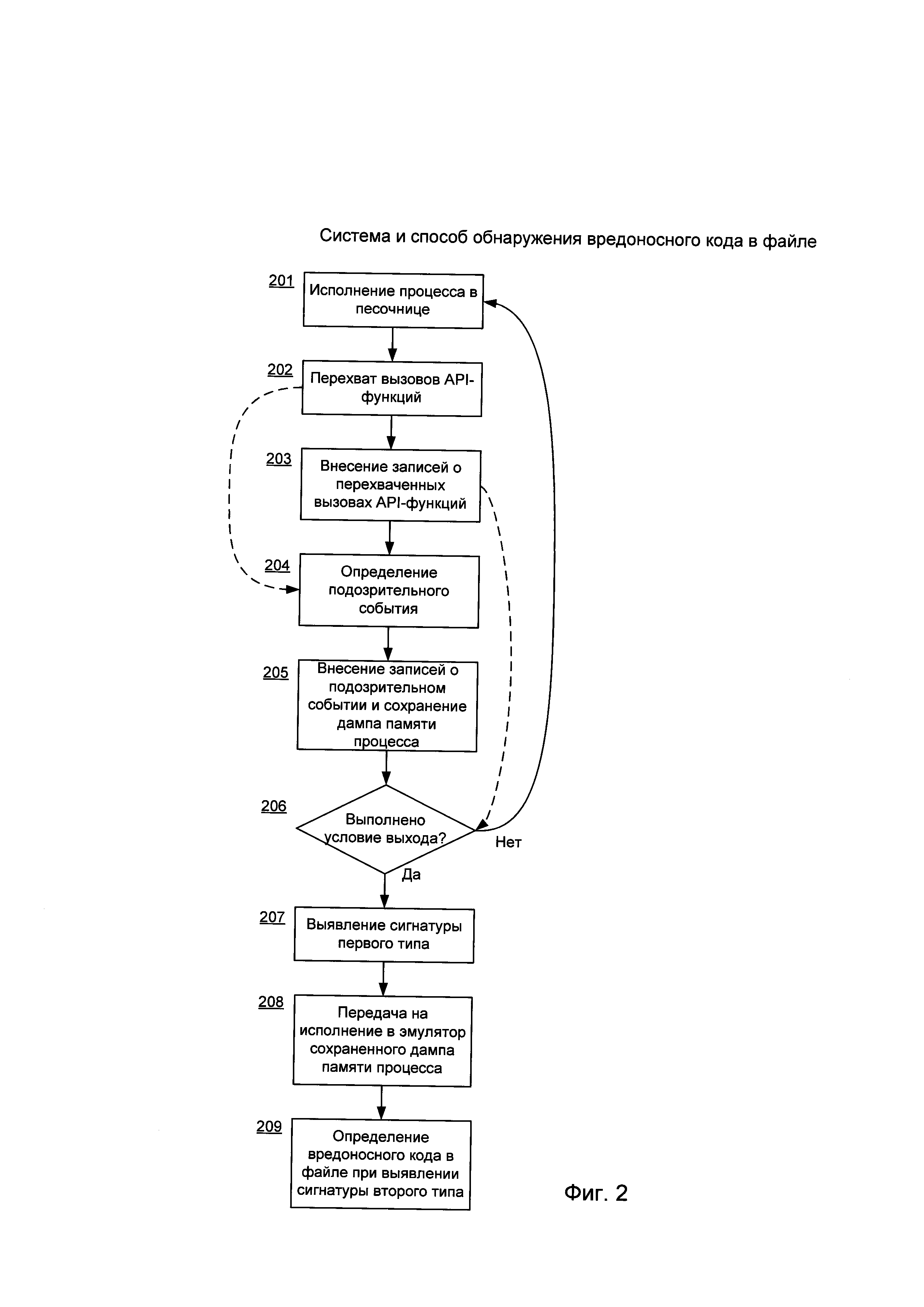 1. Способ обнаружения вредоносного кода в файле, в котором: а) с использованием песочницы исполняют процесс, запущенный из файла, под контролем антивирусного приложения; б) с использованием средства журналирования перехватывают вызовы API-функций во время исполнения процесса; в) выполняют по меньшей мере одно из следующих действий: в. 1) с использованием средства журналирования производят последовательное внесение записей о перехваченных вызовах API-функций в первый журнал и сохраняют с использованием средства проверки дамп памяти процесса в базу дампов, при этом упомянутые записи первого журнала включают: - имя вызванной функции; - уникальный идентификатор процесса (PID); - уникальный идентификатор потока (TID); - набор аргументов упомянутой функции; в. 2) с использованием средства проверки определяют подозрительное событие из числа подозрительных событий, список которых содержится в базе данных подозрительных событий, произошедшее во время исполнения процесса, на основании по меньшей мере одного из: перехваченных средством журналирования вызовов API-функций, снимков внутреннего состояния процессора, регистров процессора, содержимого стека; и, далее, с помощью средства проверки вносят запись о подозрительном событии в первый журнал и сохраняют дамп памяти процесса в базу дампов; г) повторяют шаги а)-в) до выполнения условия выхода; д) с помощью антивирусного приложения выявляют в первом журнале по меньшей мере одну сигнатуру первого типа из числа сигнатур первого типа, список которых содержится в базе данных сигнатур первого типа, при этом каждая сигнатура первого типа - это структура данных, которая содержит по крайней мере одну запись, содержащую, в свою очередь, информацию о вызове API-функции или информацию о подозрительном событии; е) после выявления по меньшей мере одной сигнатуры первого типа, с помощью антивирусного приложения передают на исполнение в эмулятор по меньшей мере один дамп памяти, сохраненный в базе дампов; ж) во время исполнения в эмуляторе процесса, исполняемый код которого содержится в дампе памяти, переданном на исполнение в эмулятор, с помощью антивирусного приложения выполняют по меньшей мере одно из следующих действий: - последовательно вносят во второй журнал по крайней мере одну запись, содержащую информацию о вызове API-функции; - записывают трассу выполнения процесса во второй журнал, при этом трасса выполнения процесса содержит непрерывную последовательность выполняемых на процессоре инструкций и снимки внутреннего состояния процессора при выполнении каждой инструкции; з) с помощью антивирусного приложения определяют вредоносный код в файле, при выявлении во втором журнале по меньшей мере одной сигнатуры второго типа из базы данных сигнатур второго типа, при этом каждая сигнатура второго типа - это структура данных, которая включает по крайней мере одну из следующих записей: - информацию о вызове API-функции; - инструкции процессора и записи снимков внутреннего состояния процессора. 2. Способ по п. 1, в котором условием выхода является одно из: i) процесс завершился; ii) истек заданный период времени; iii) шаги а)-в) были выполнены заданное число повторений; iv) количество выполненных процессом инструкций превысило заданный порог количества инструкций; v) количество подозрительных событий, определе