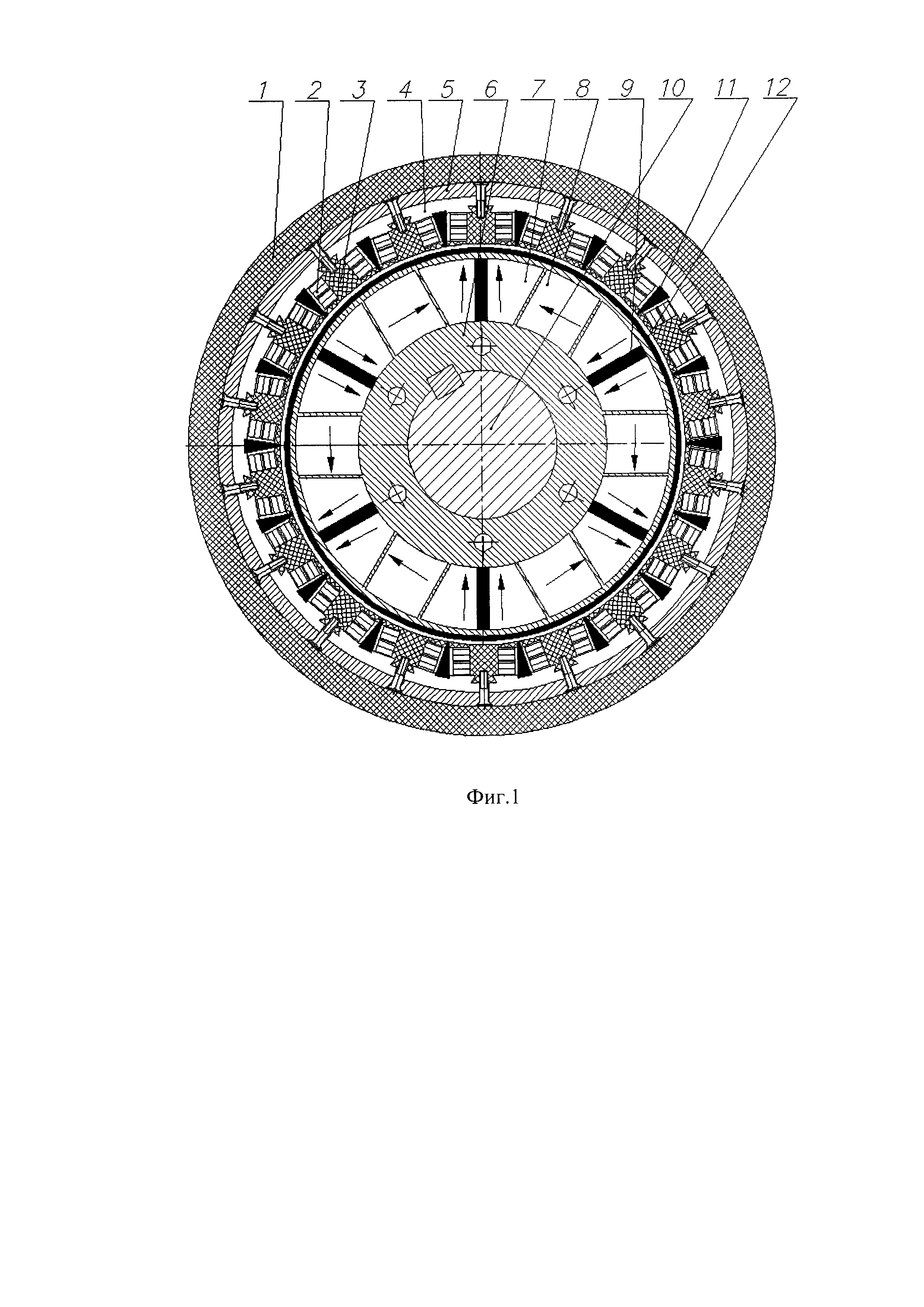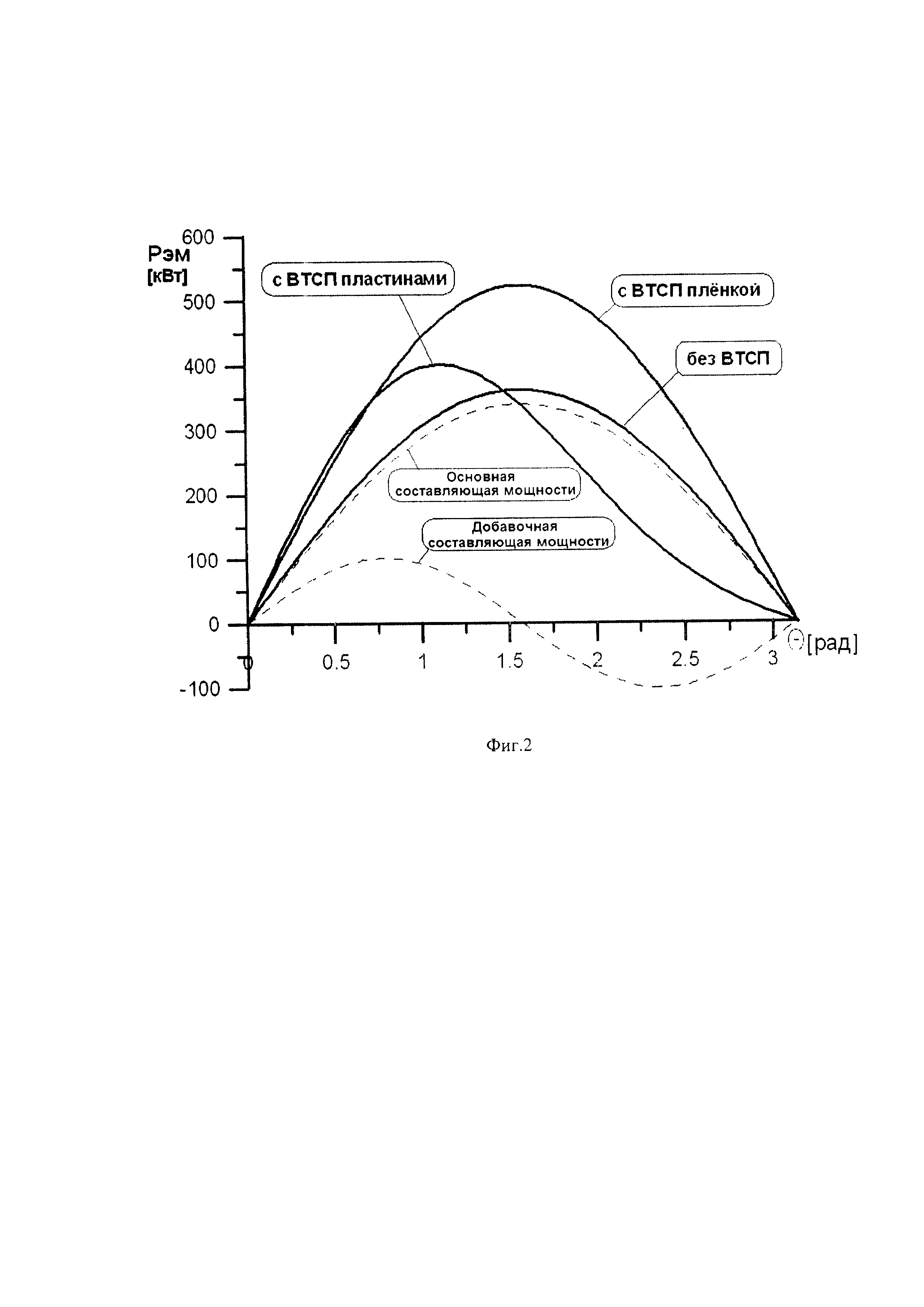 1. Электрическая машина с постоянными магнитами и обмотками из высокотемпературного сверхпроводникового материала, содержащая корпус, в котором размещены статор с расположенной на нем многофазной многополюсной обмоткой, ротор, состоящий из массива блоков постоянных магнитов, содержащий чередующиеся постоянные магниты с радиальной и тангенциальной намагниченностями, установленные в пазах немагнитного пакета ротора, и диамагнитные пластины из массивного высокотемпературного сверхпроводникового материала (ВТСП), размещенные в середине полюсов ротора, отличающаяся тем, что обмотка статора выполнена из ВТСП материала в виде рейстрековых катушек и расположена на зубцах, установленных на внешнем защитном экране, между катушками обмотки статора установлены диамагнитные вставки, на внешней поверхности ротора расположена тонкостенная оболочка. 2. Машина по п. 1, отличающаяся тем, что диамагнитные вставки выполнены из массивного ВТСП материала в виде пластин либо клинообразных вставок с возможностью охлаждения ВТСП обмотки статора. 3. Машина по п. 1, отличающаяся тем, что тонкостенная диамагнитная оболочка выполнена из ВТСП пленочного материала. 4. Машина по п. 1, отличающаяся тем, что в качестве ВТСП материала обмоток статора используется высокотемпературная сверхпроводящая лента второго поколения (ВТСП-2). 5. Машина по п. 1, отличающаяся тем, что внешний защитный экран может быть выполнен ферромагнитным, диамагнитным или комбинированным, составленным из двух концентрических оболочек: внутренней - ферромагнитной и внешней - диамагнитной.