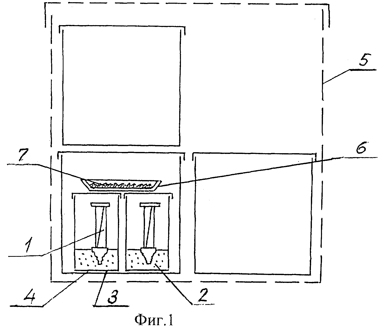 размещают в контейнер 4 большего размера, который затем располагают в рабочей камере 5 газостата. В контейнере 4 большего размера размещают емкость 6 с веществом 7, поглощающим кислород, в качестве
